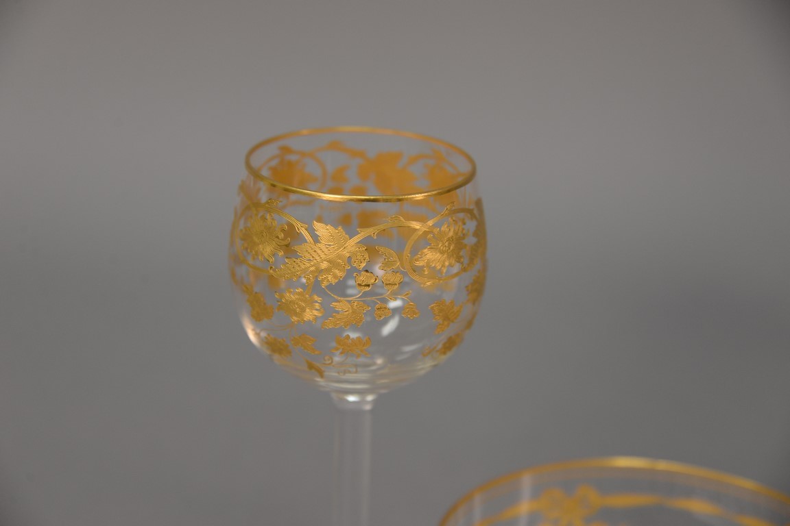 Nineteen piece lot with ten stems and nine finger bowls, each with heavy gold designs, possibly Baccarat. stems: ht. 6 1/2in.