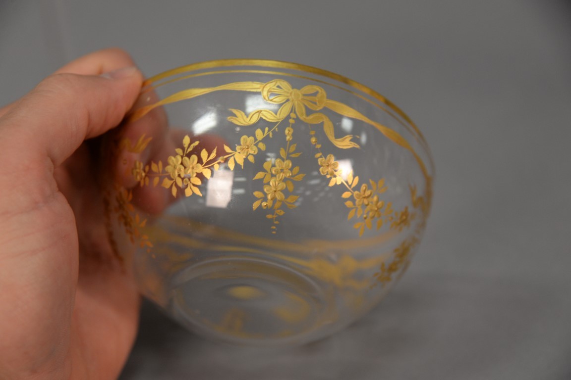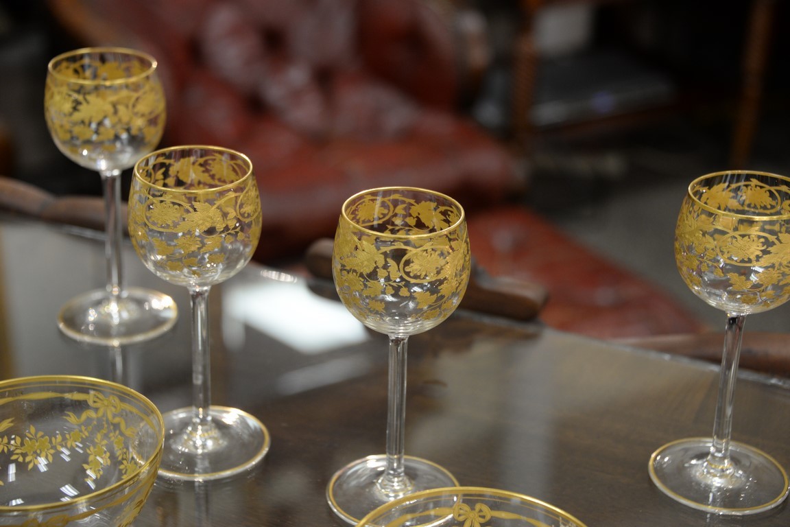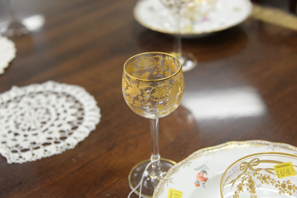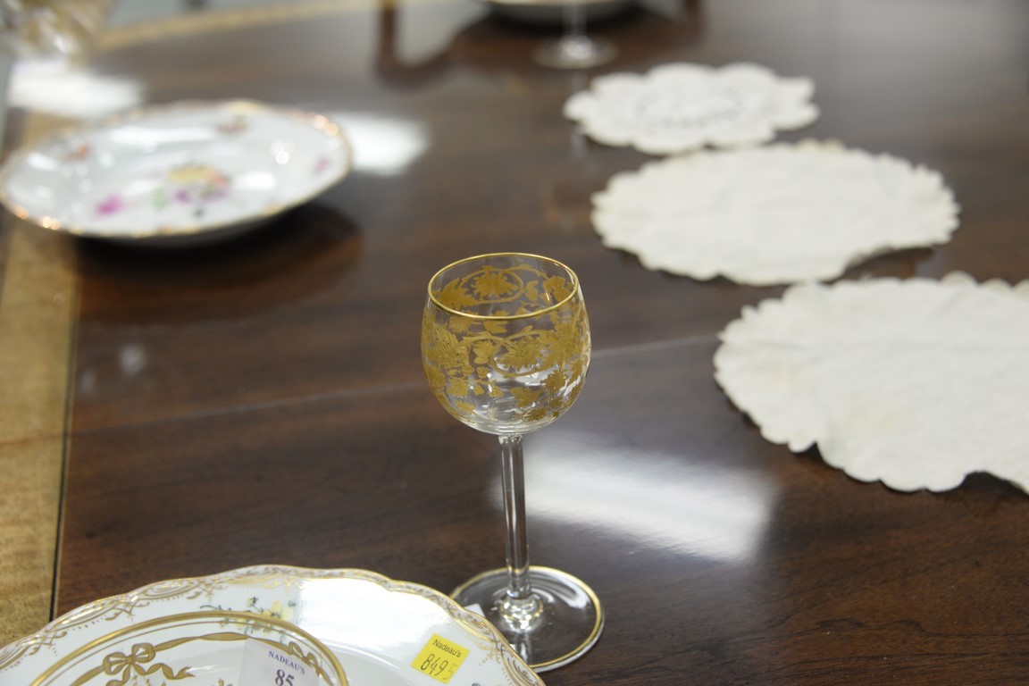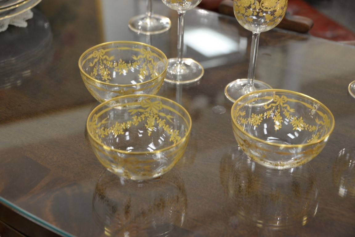 Lot 85: Nineteen piece lot with ten stems and nine finger bowls, each with heavy gold designs, possibly Baccarat. stems: ht. 6 1/2in.