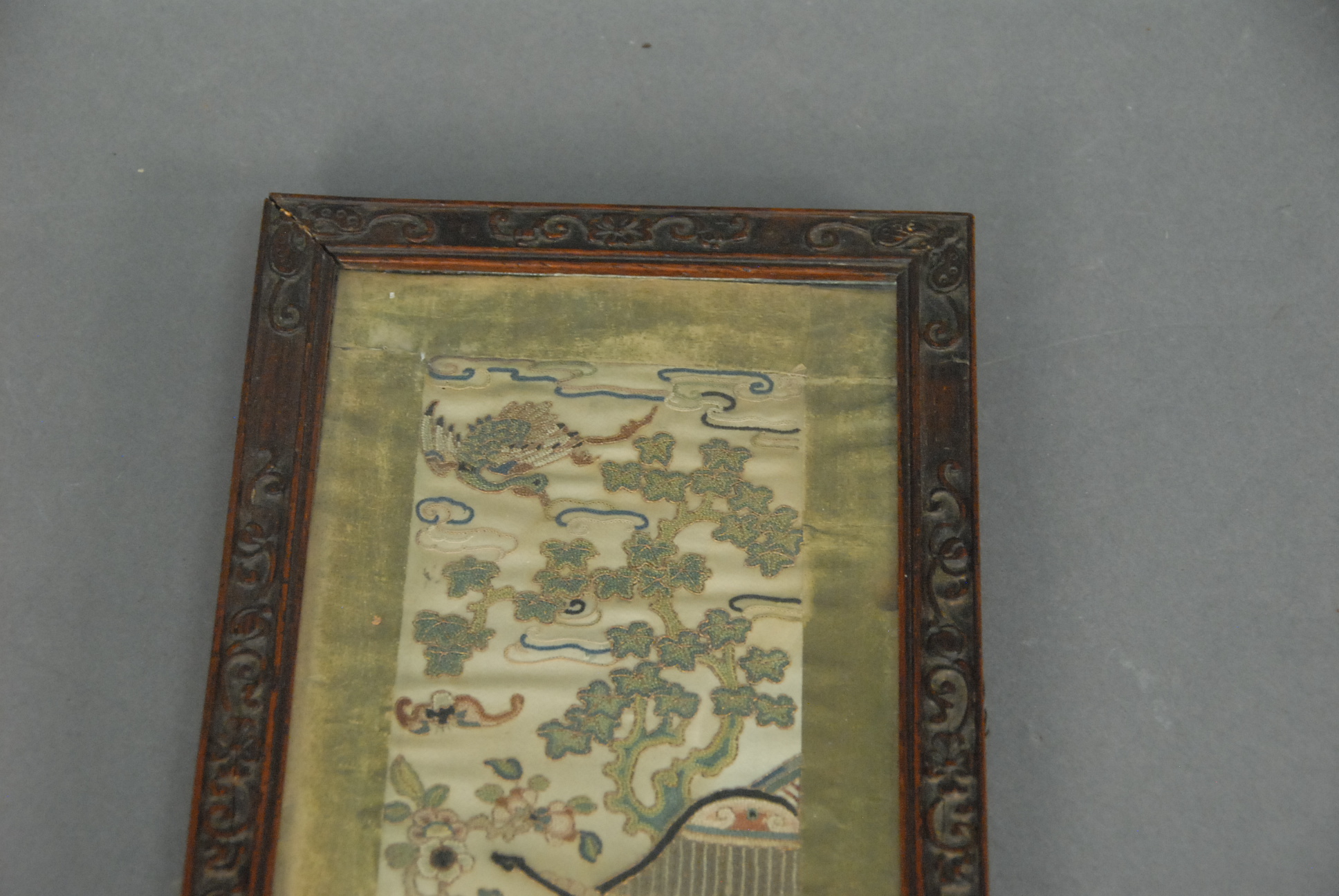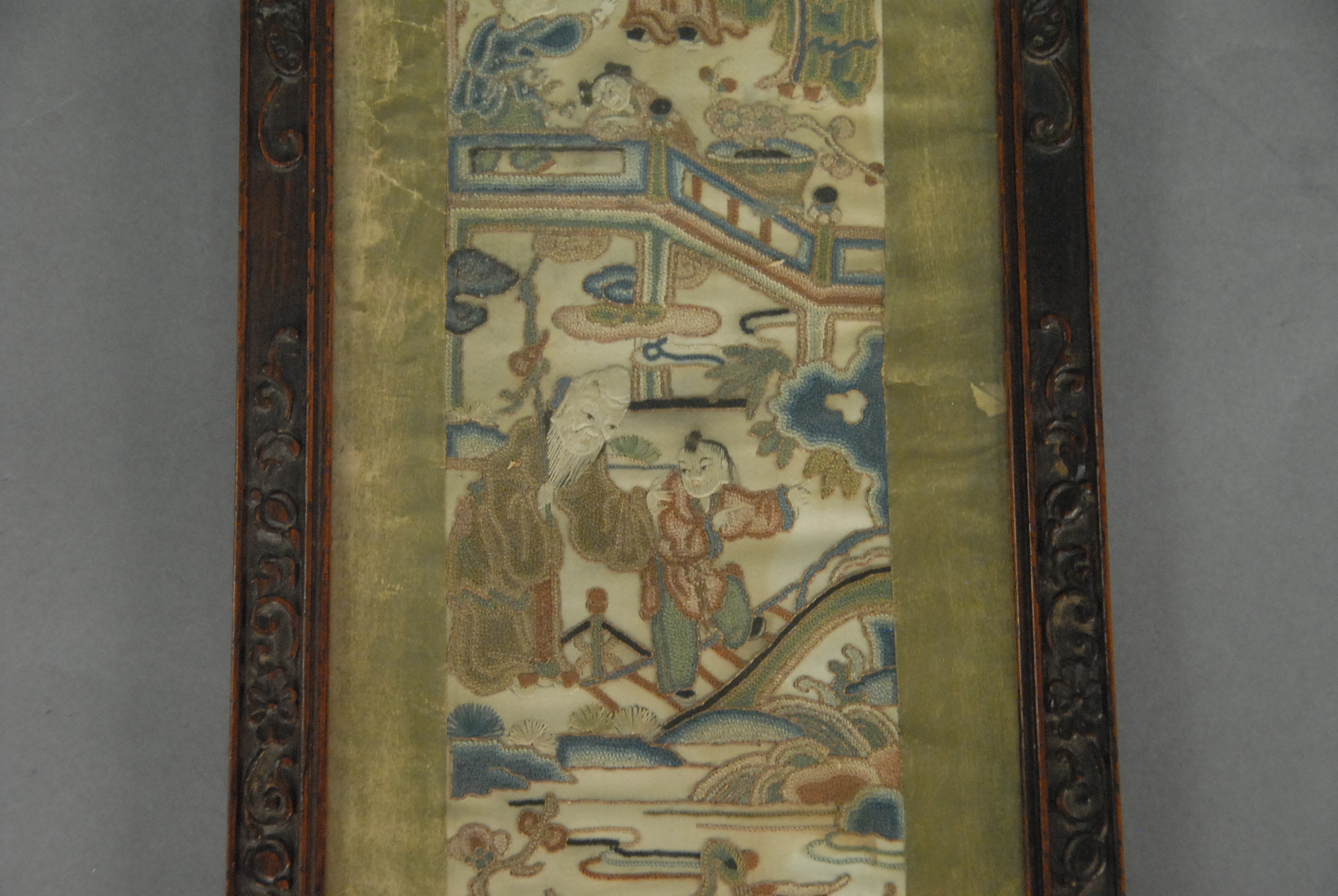 Oriental framed silk embroidery of courtyard scene with carved butterfly and scrolling flower frame, 21 x 6.