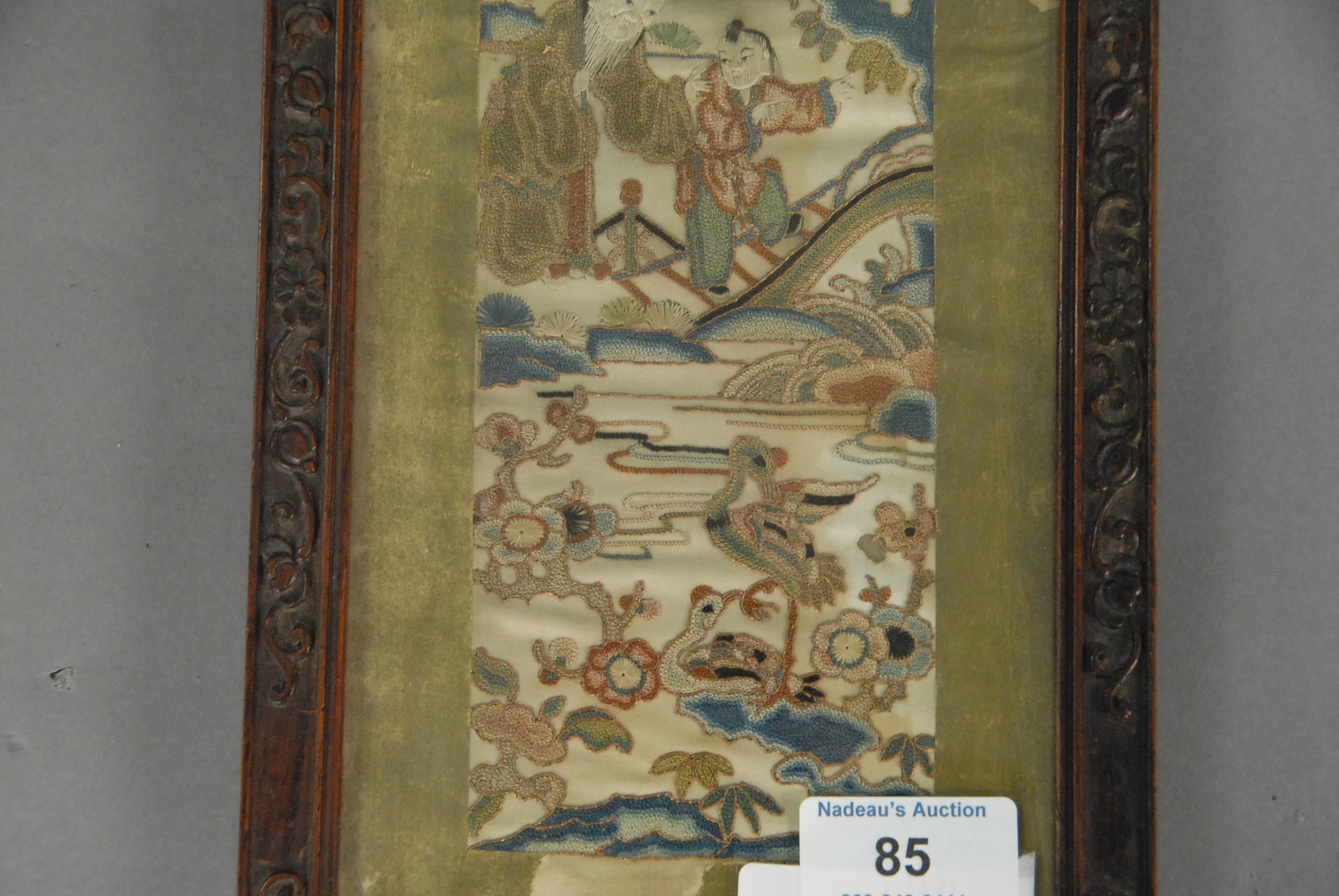Lot 85: Oriental framed silk embroidery of courtyard scene with carved butterfly and scrolling flower frame, 21 x 6.