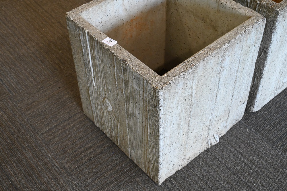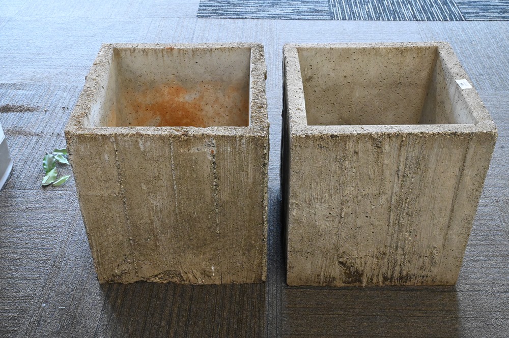 Pair of Contemporary Outdoor Cement Planters, height 18 inches, top 16 1/2″ x 16 1/2″.