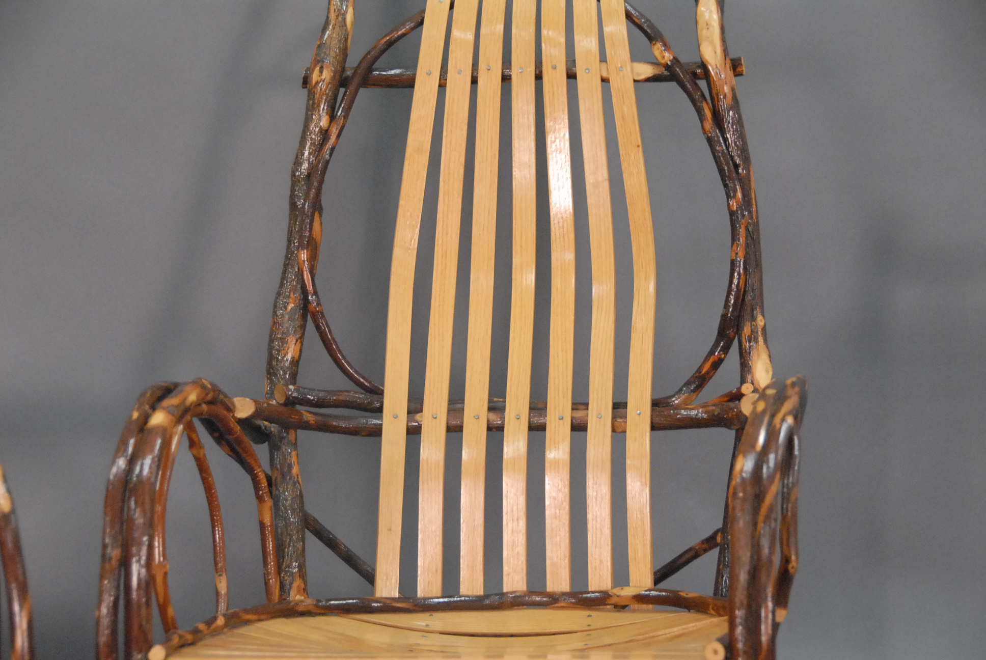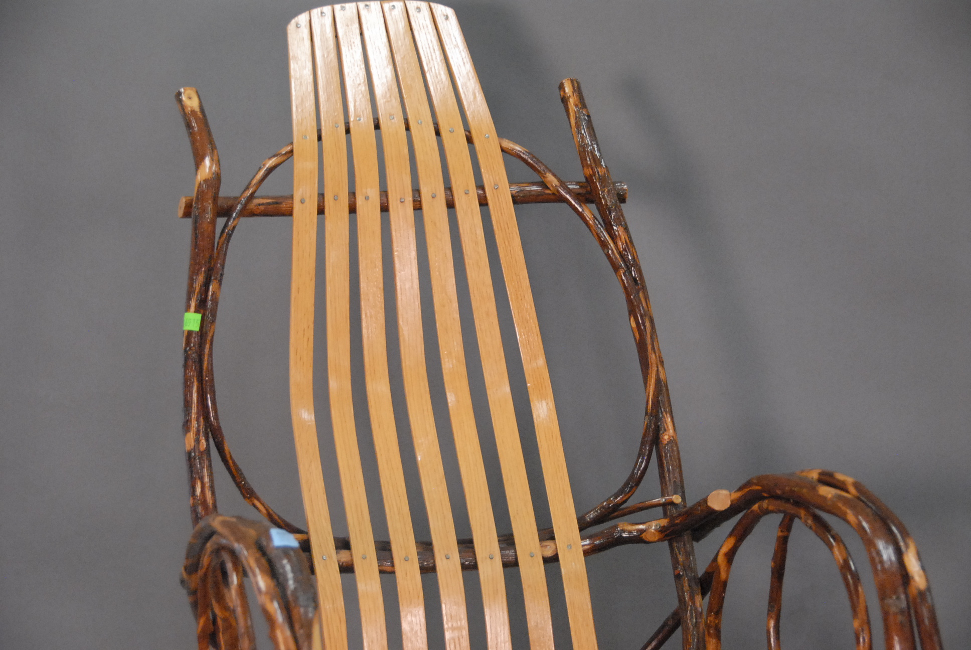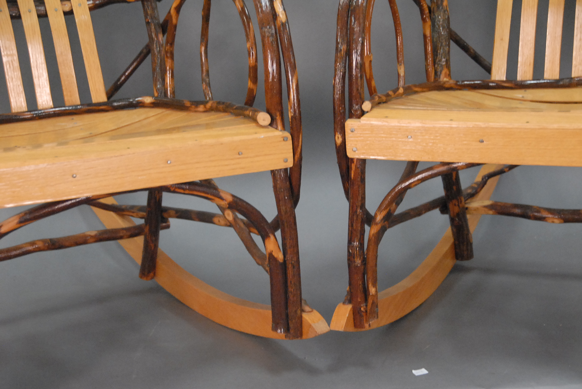 Pair of custom Bentwood oak rockers with stick/twig frames signed Fischer.