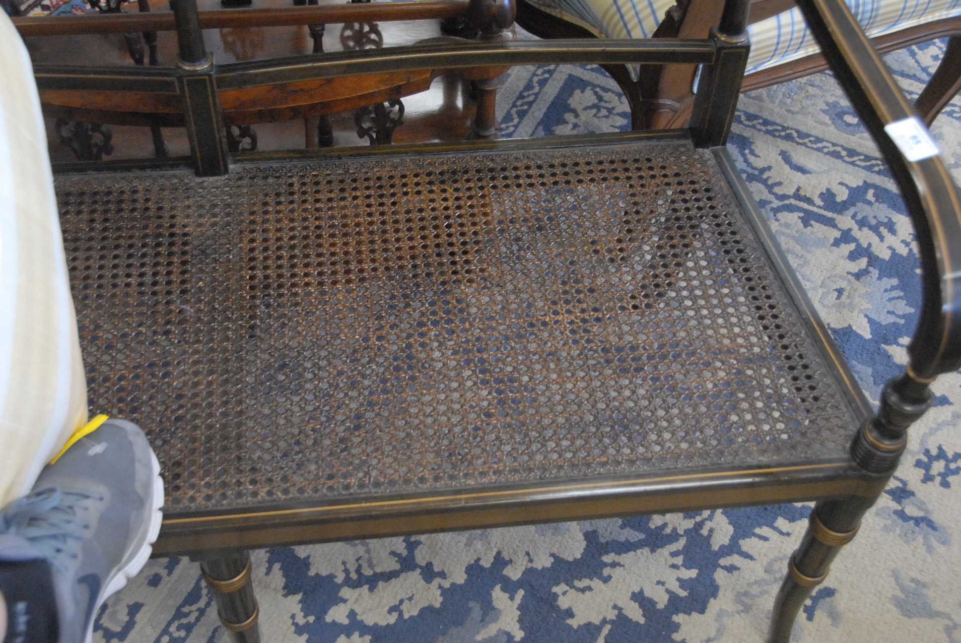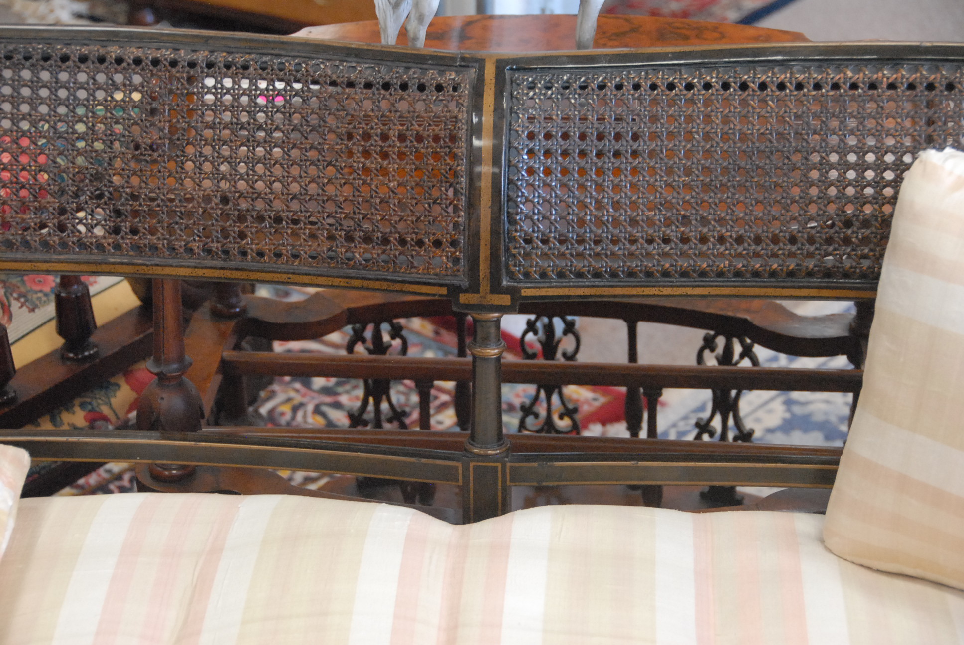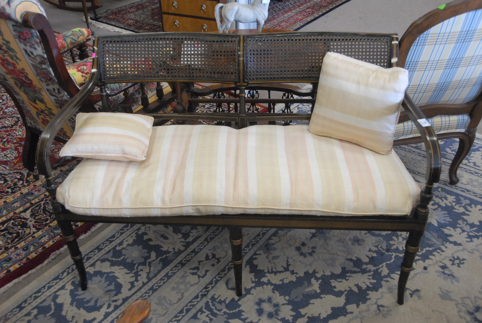 Regency style two seat settee with caned back and seat with custom cushion. lg. 47 in.
