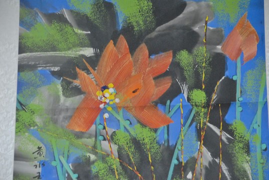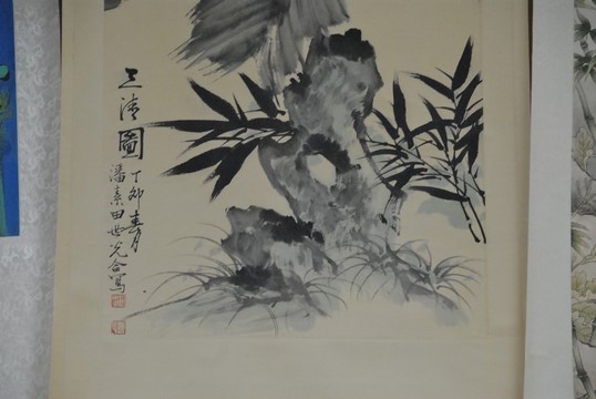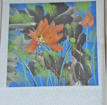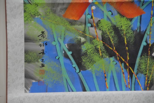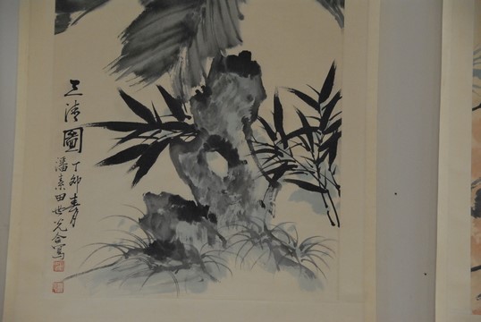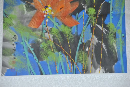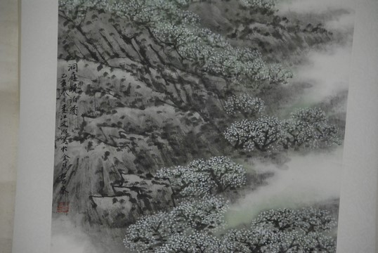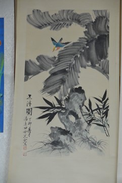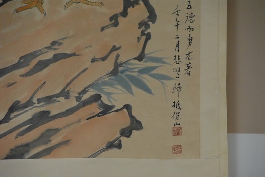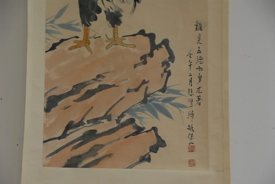 Song Wenzhi Oriental scroll painting of landscape with white houses 27 1/2 x 16, Brihong Xu oriental scroll of a Rooster sitting on rocks 35 x 19, Shiguang Tian Oriental scroll with flying bird 35 x 19, and Huang Yongyu Oriental scroll with red flowers 27 x 27.