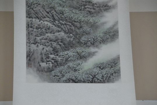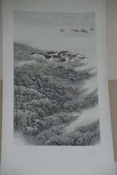 Lot 85: Song Wenzhi Oriental scroll painting of landscape with white houses 27 1/2 x 16, Brihong Xu oriental scroll of a Rooster sitting…