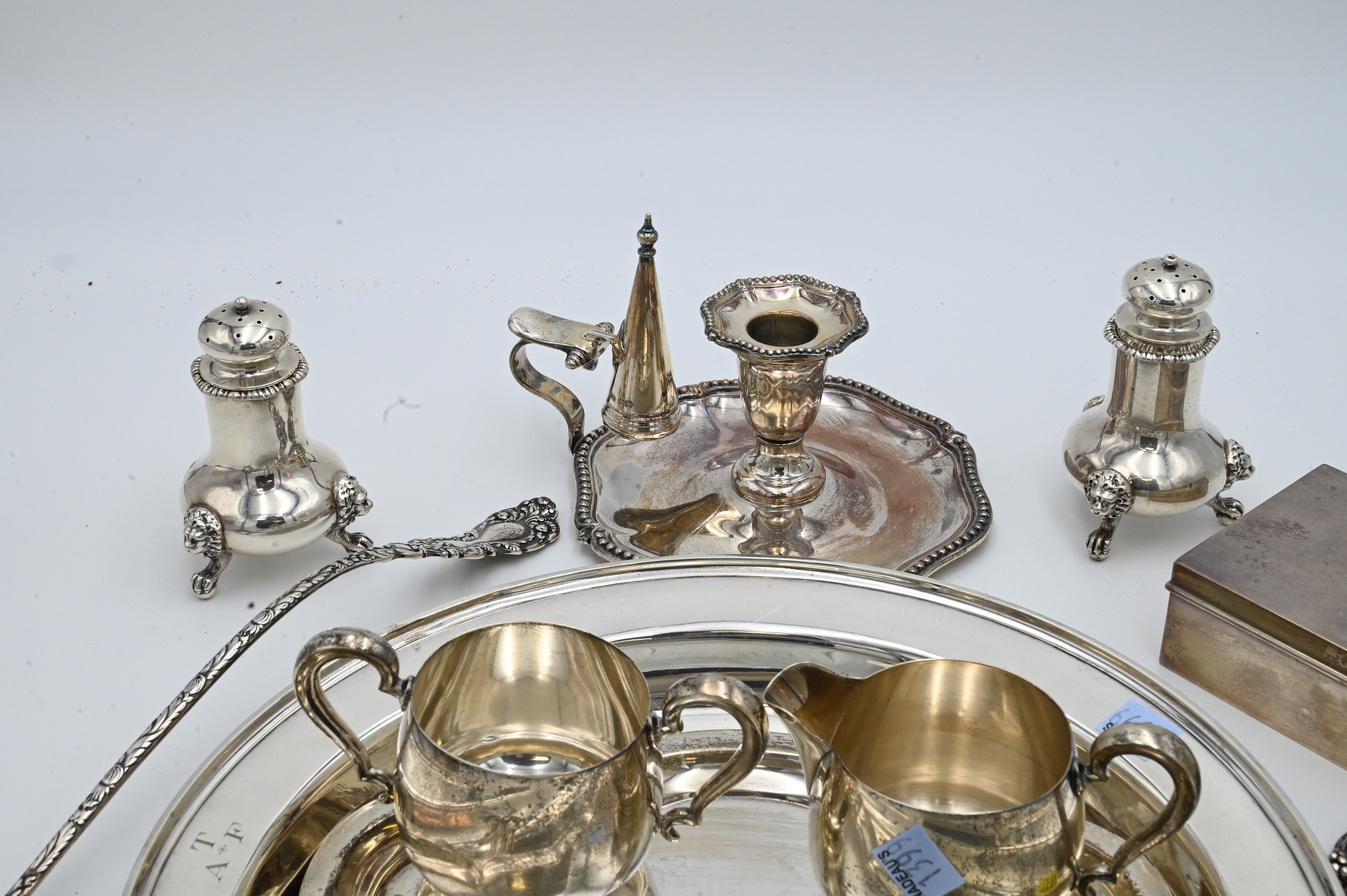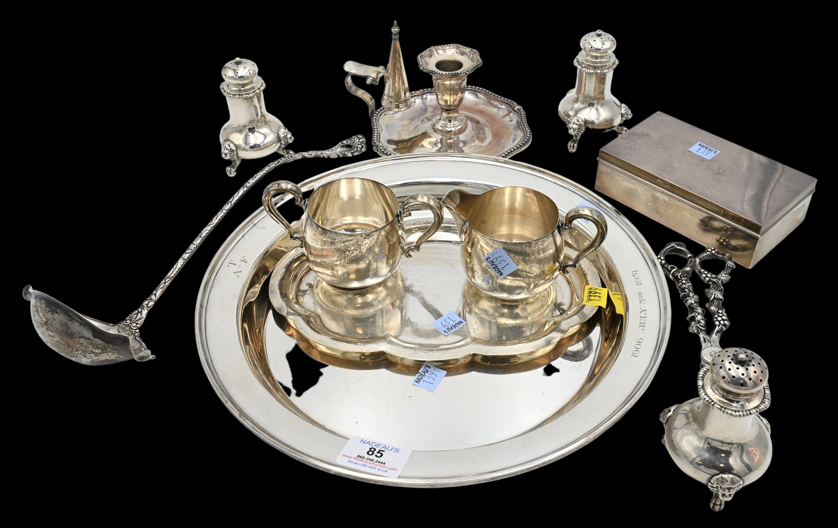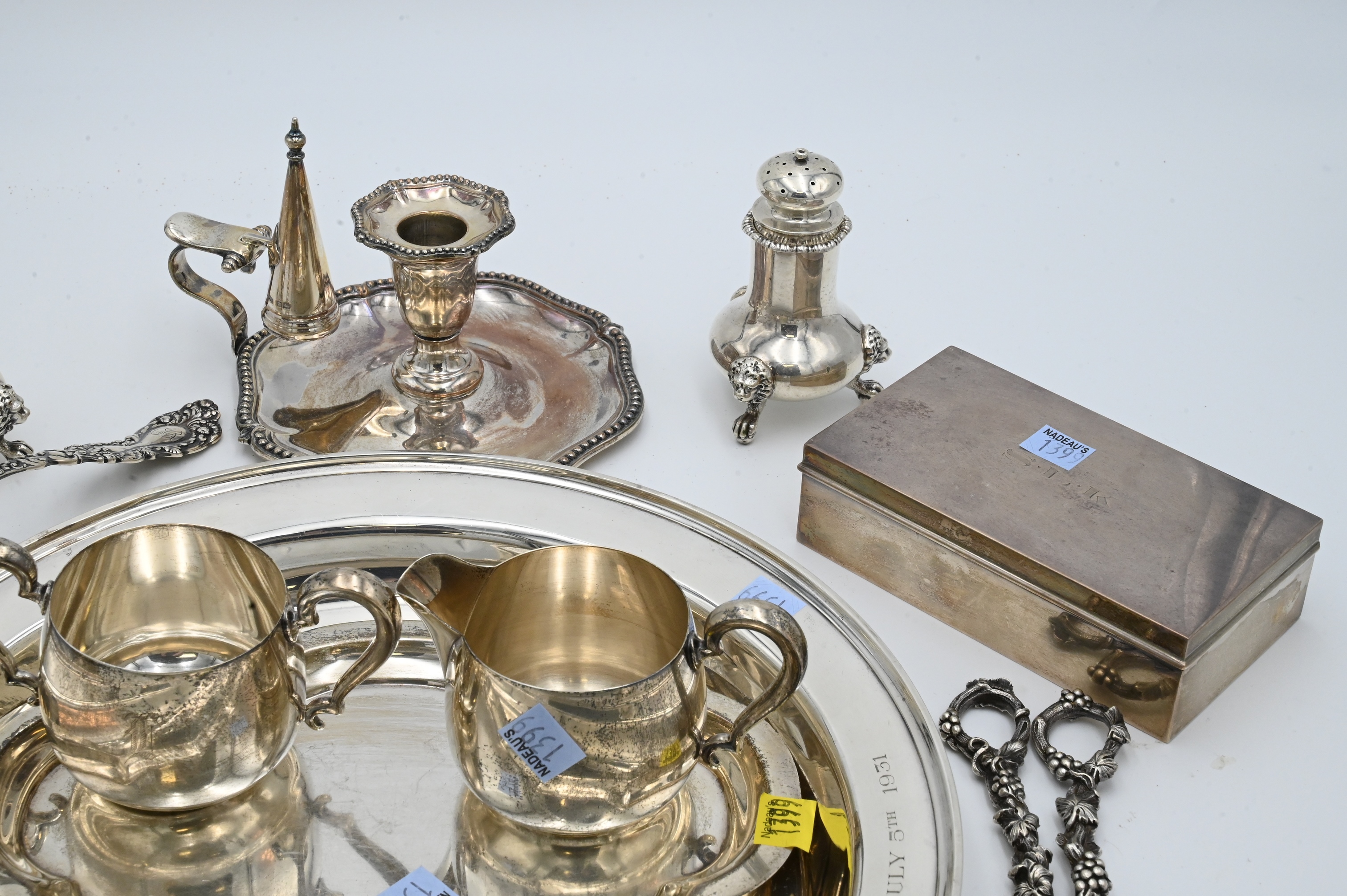 Sterling Silver Lot, to include a candle holder and snuffer, sugar, creamer, ladle, grape shears, along with a set of three pepper shakers, 78 t.oz.
