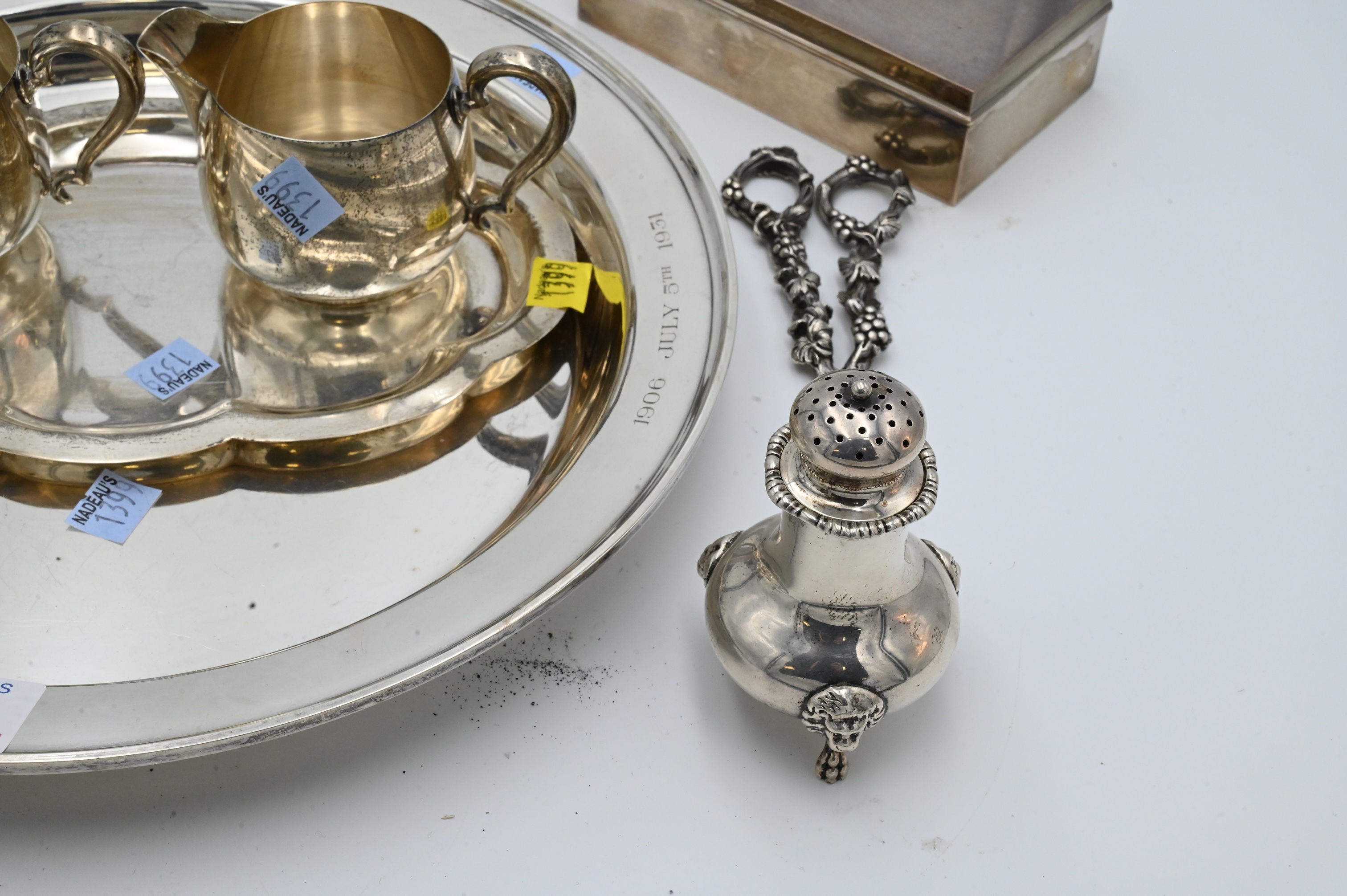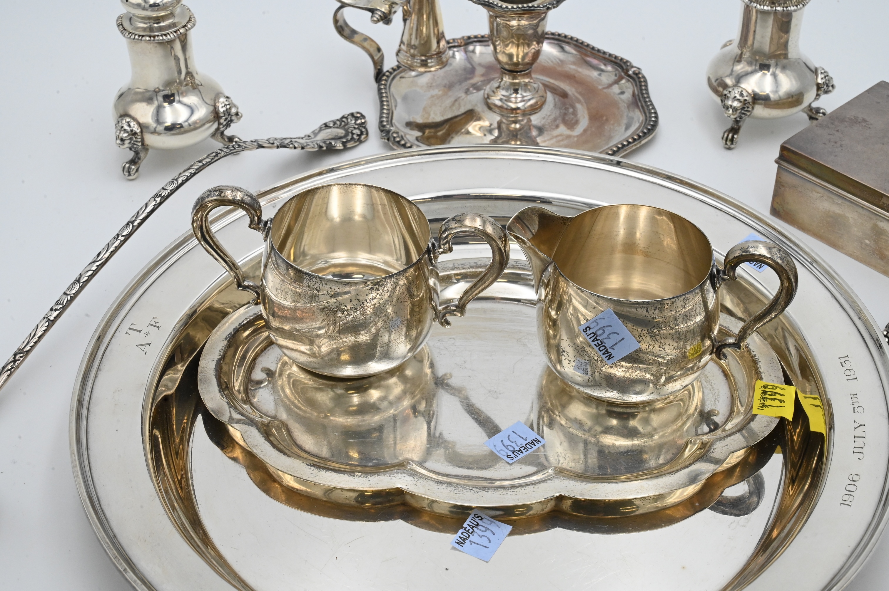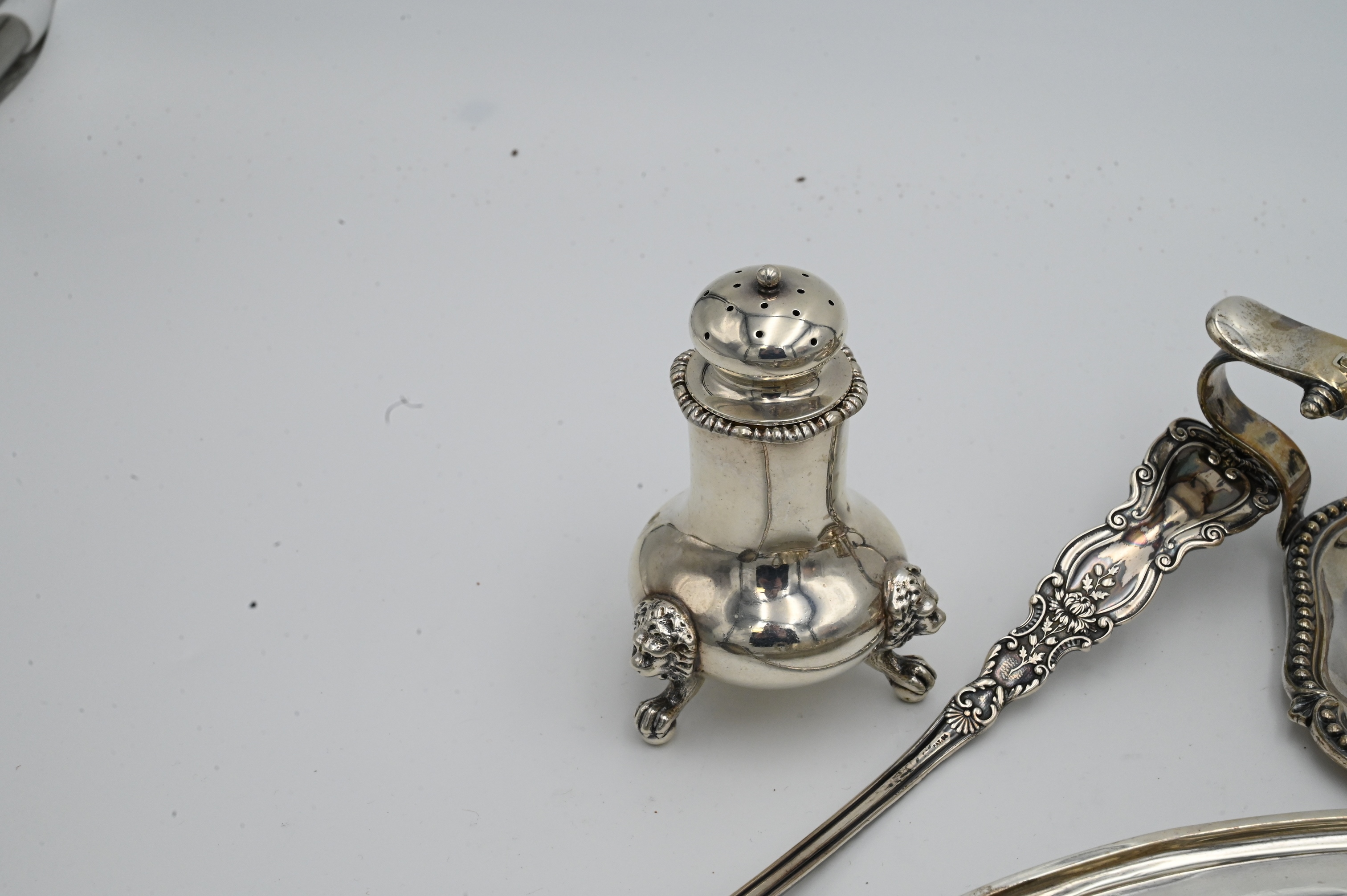 Sterling Silver Lot, to include a candle holder and snuffer, sugar, creamer, ladle, grape shears, along with a set of three pepper shakers, 78 t.oz.