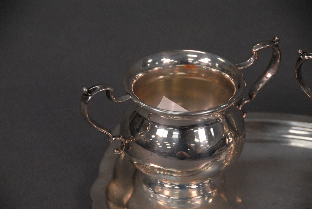 Sterling silver small tray and sugar and creamer, 15.1 t oz. Provenance: property from a home in Rockville Center, New York which was decorated by Iris Apfel.