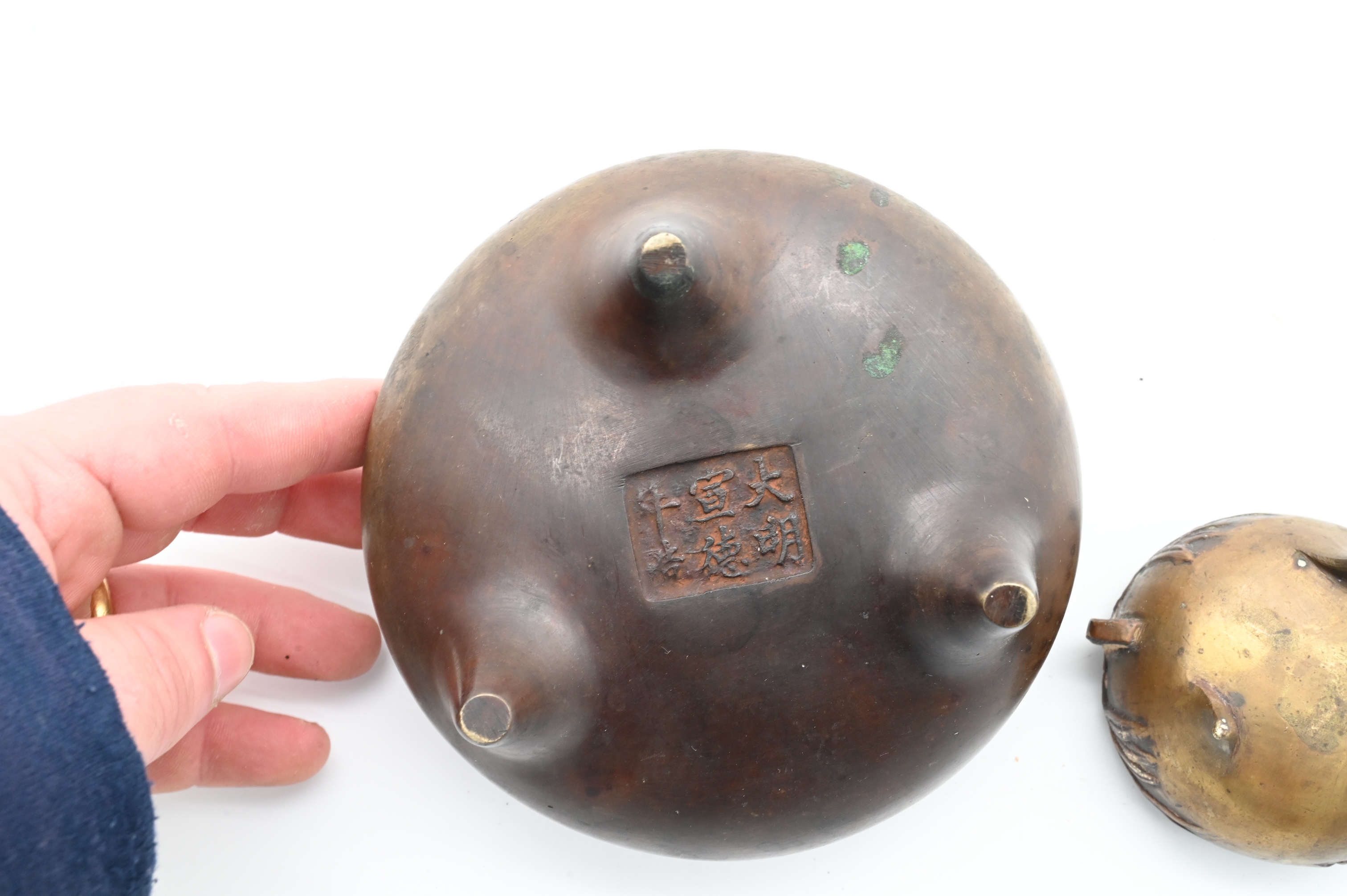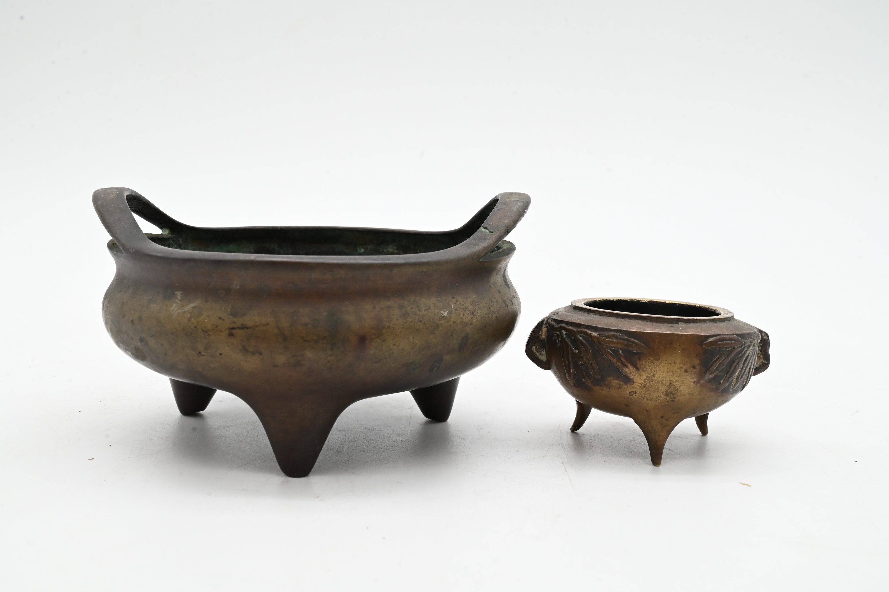 group of two bronze incense burners, one of tripod form with applied handles, the other of rounded form with side handles, one example bearing an apocryphal Xuande mark to the base.