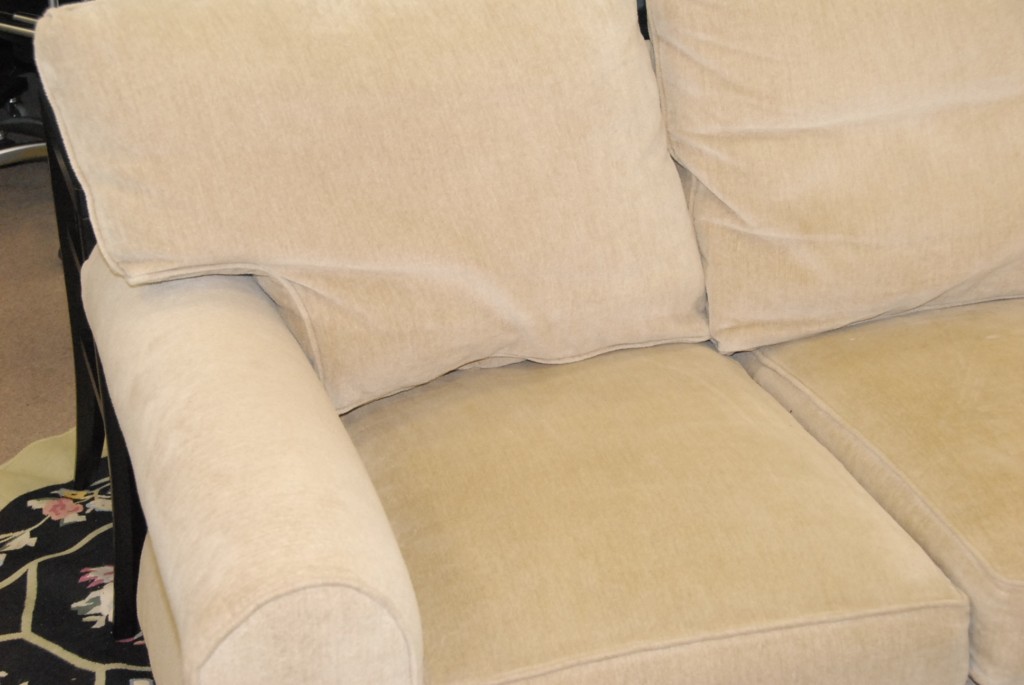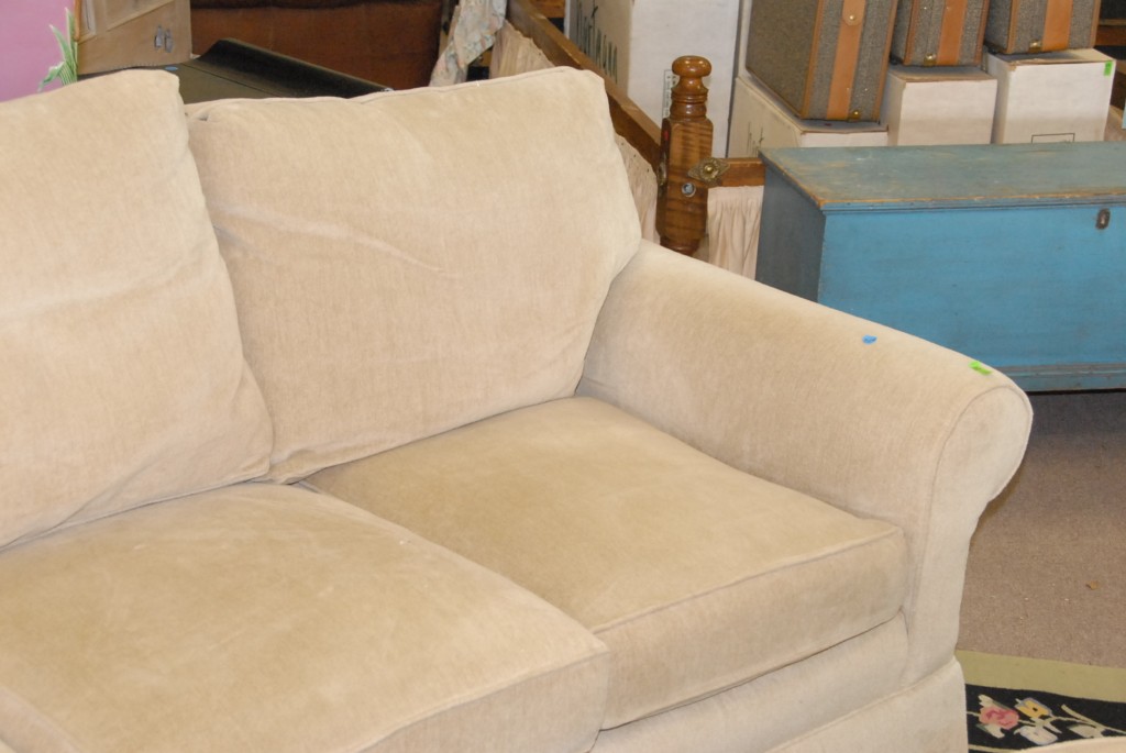 Upholstered sofa Vanguard Furniture, tan upholstery in clean condition and small table.
