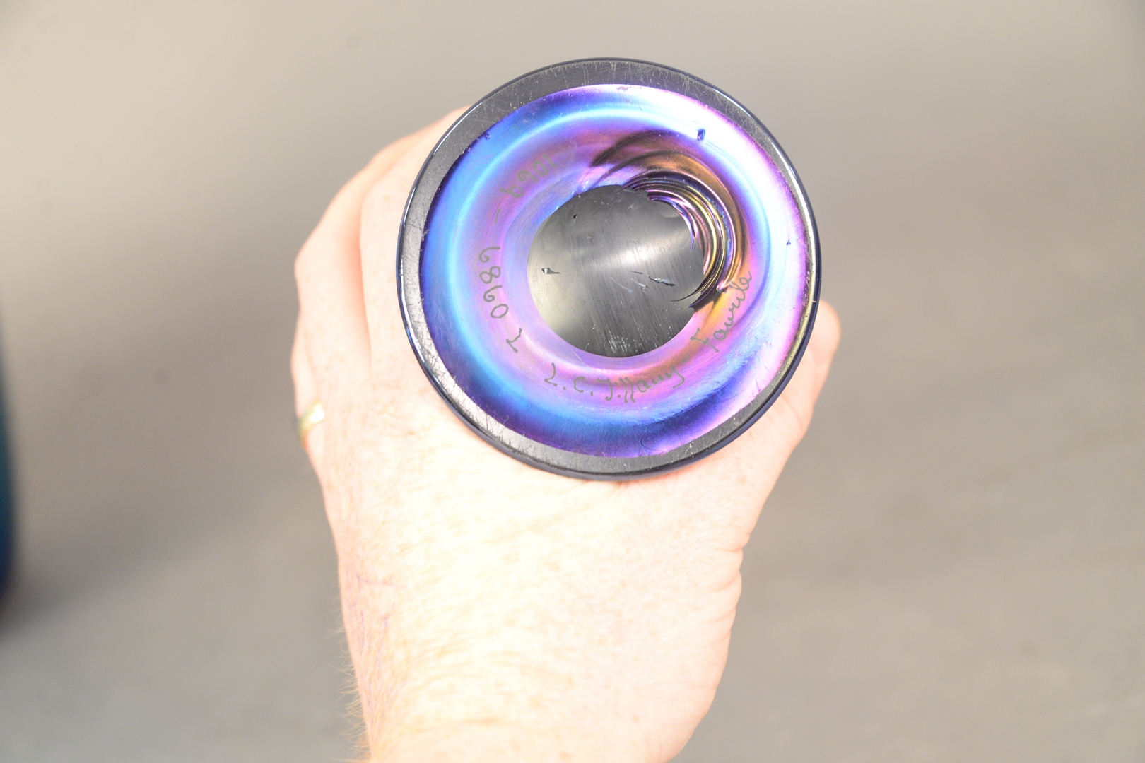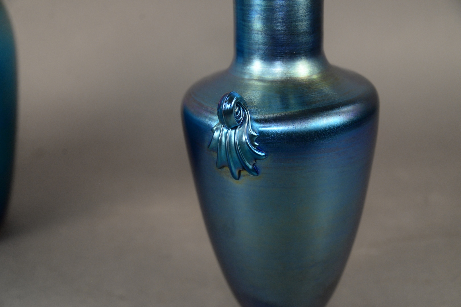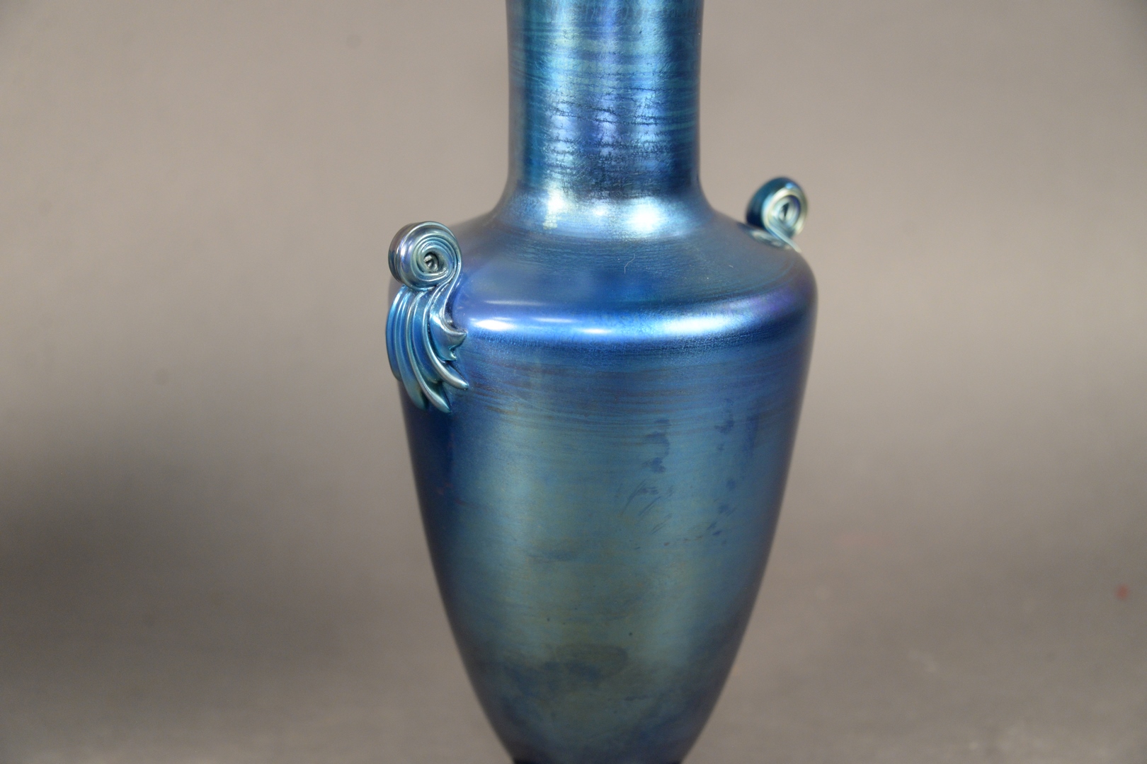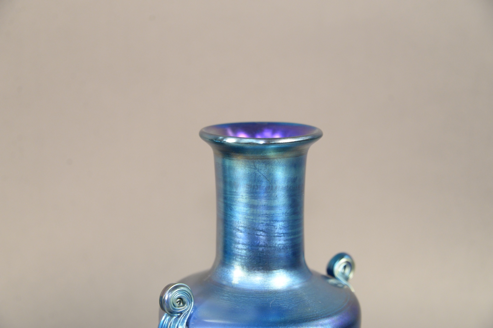Lot 850: Tiffany Studios Blue Favrile Glass Vase, having a cylindrical neck and two small scroll handles mounted to the shoulder, height 12 i…