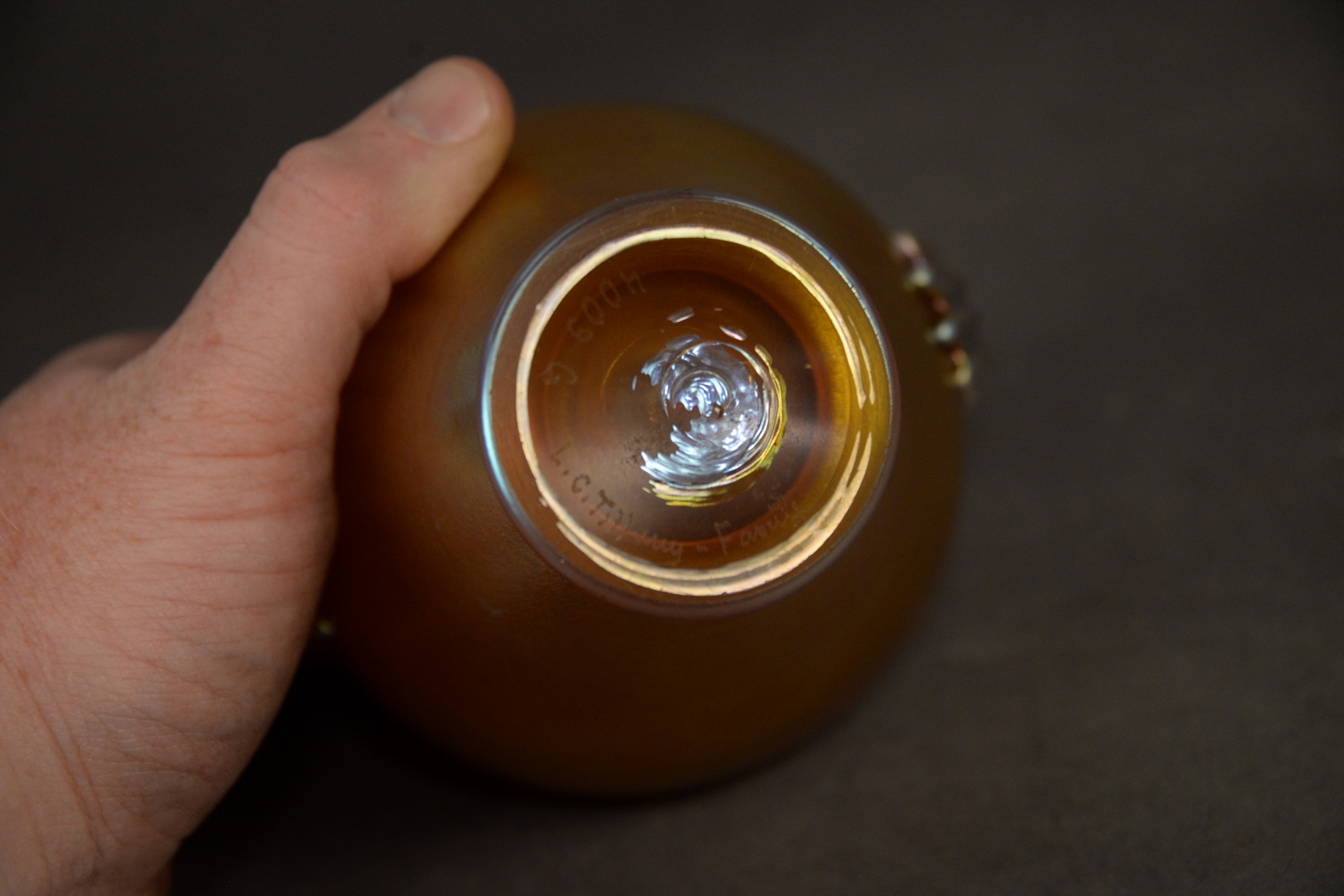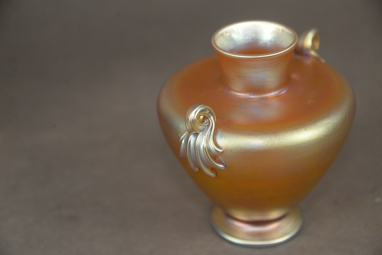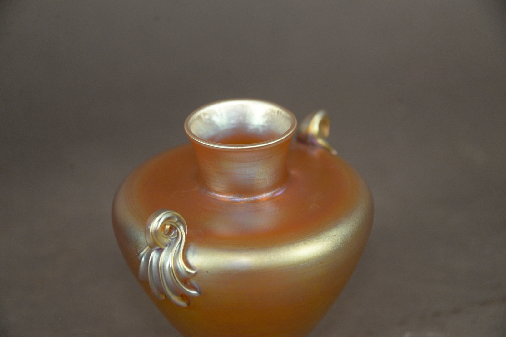 Lot 851: Tiffany Studios Yellow Favrile Glass Vase, having ovoid handled form raised on a circular foot, inscribed 4003G L.C. Tiffany – Favr…
