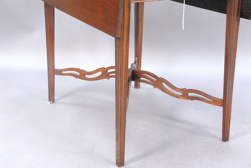 Federal cherry drop leaf Pembroke table with a drawer and pierced arched stretcher base all set on square tapered legs. ht. 28 1/2n.