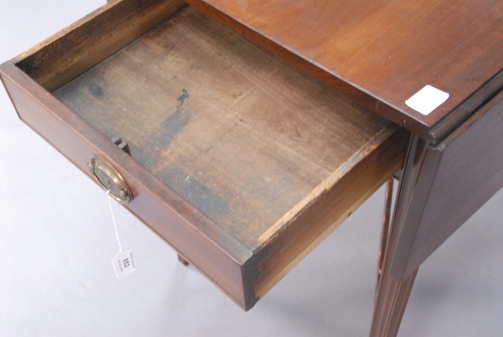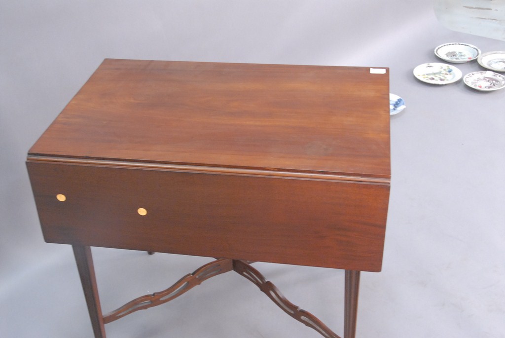 Lot 852: Federal cherry drop leaf Pembroke table with a drawer and pierced arched stretcher base all set on square tapered legs.ht. 28 1/2n.