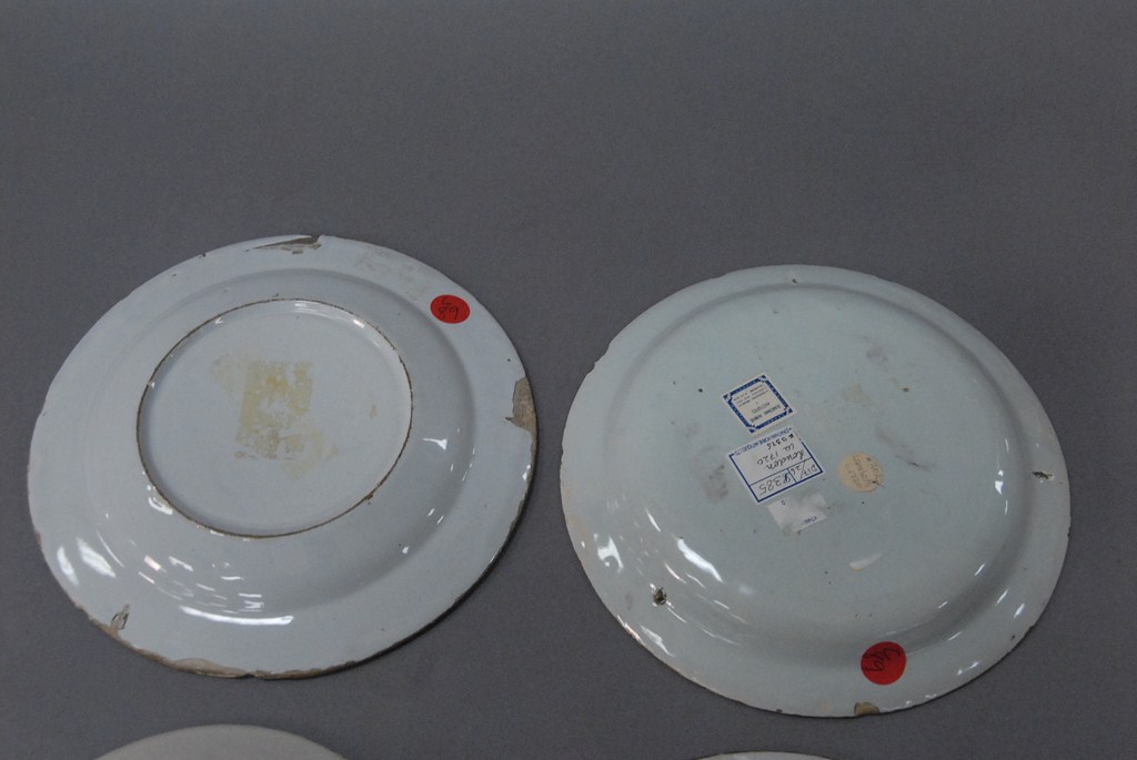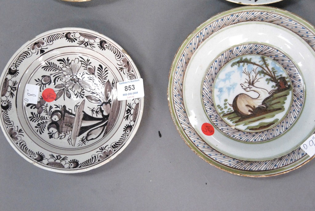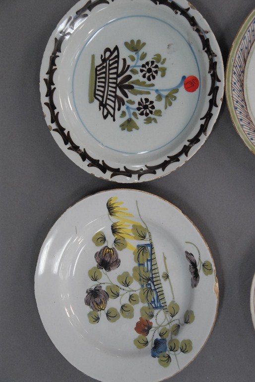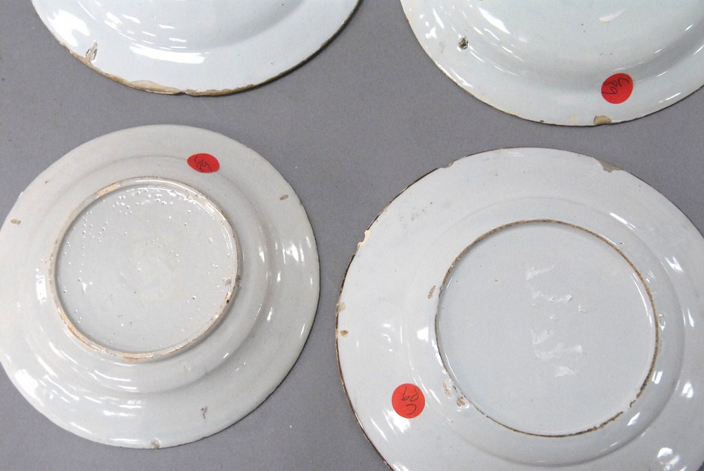 Four Delft plates one with deer and three with flowers. dia. 8in. & 9in.