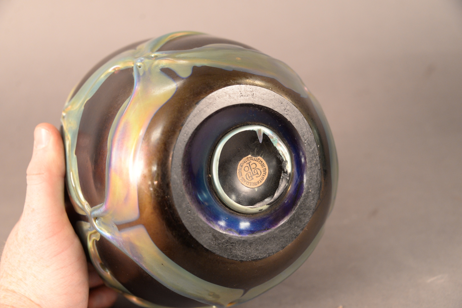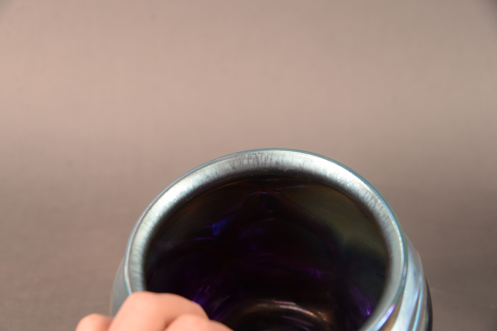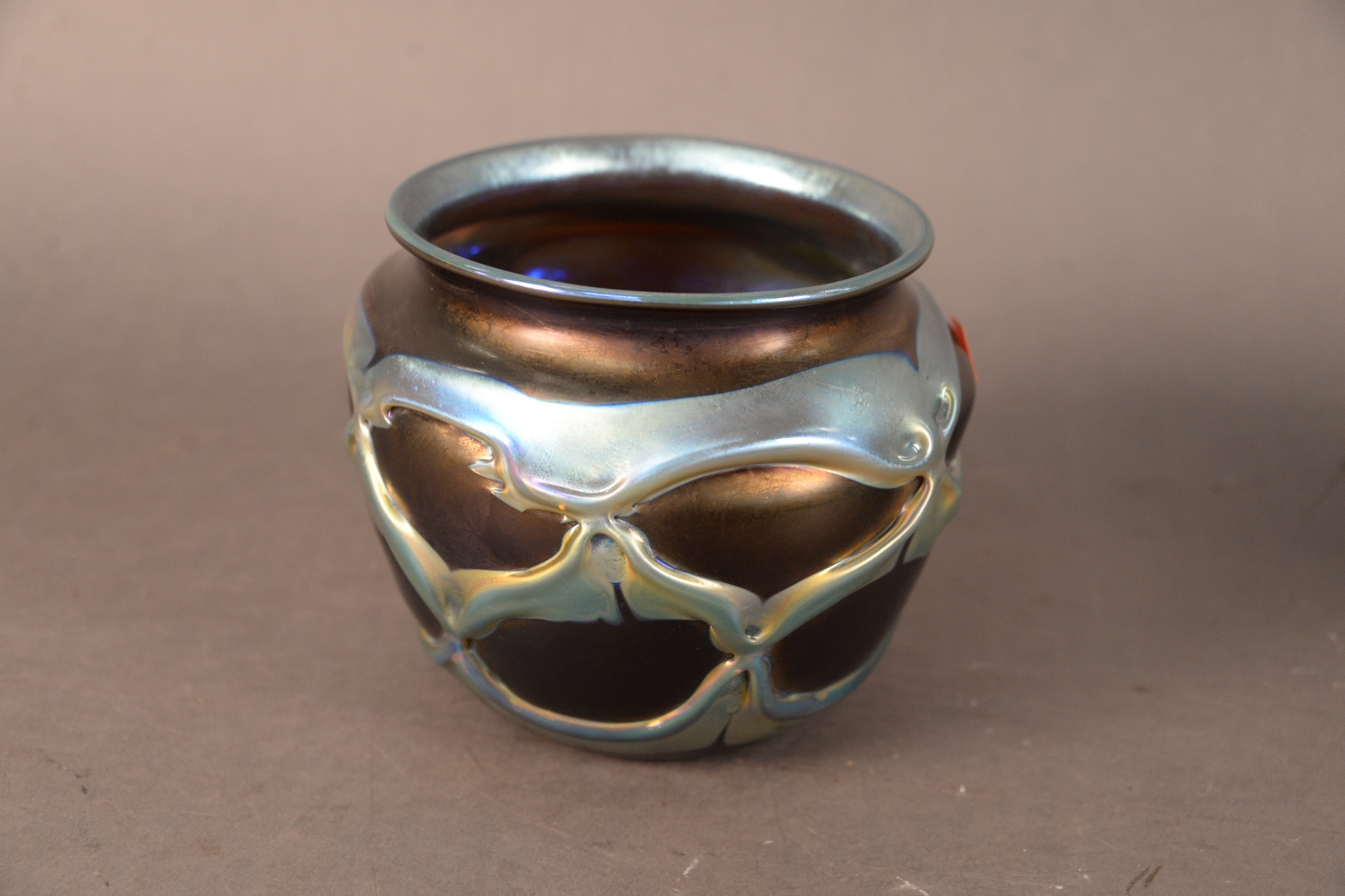Lot 854: Attributed to Tiffany Studios Favrile Glass Vase, having blue details, height 5 1/2 inches, diameter 6 inches, having a Tiffany labe…