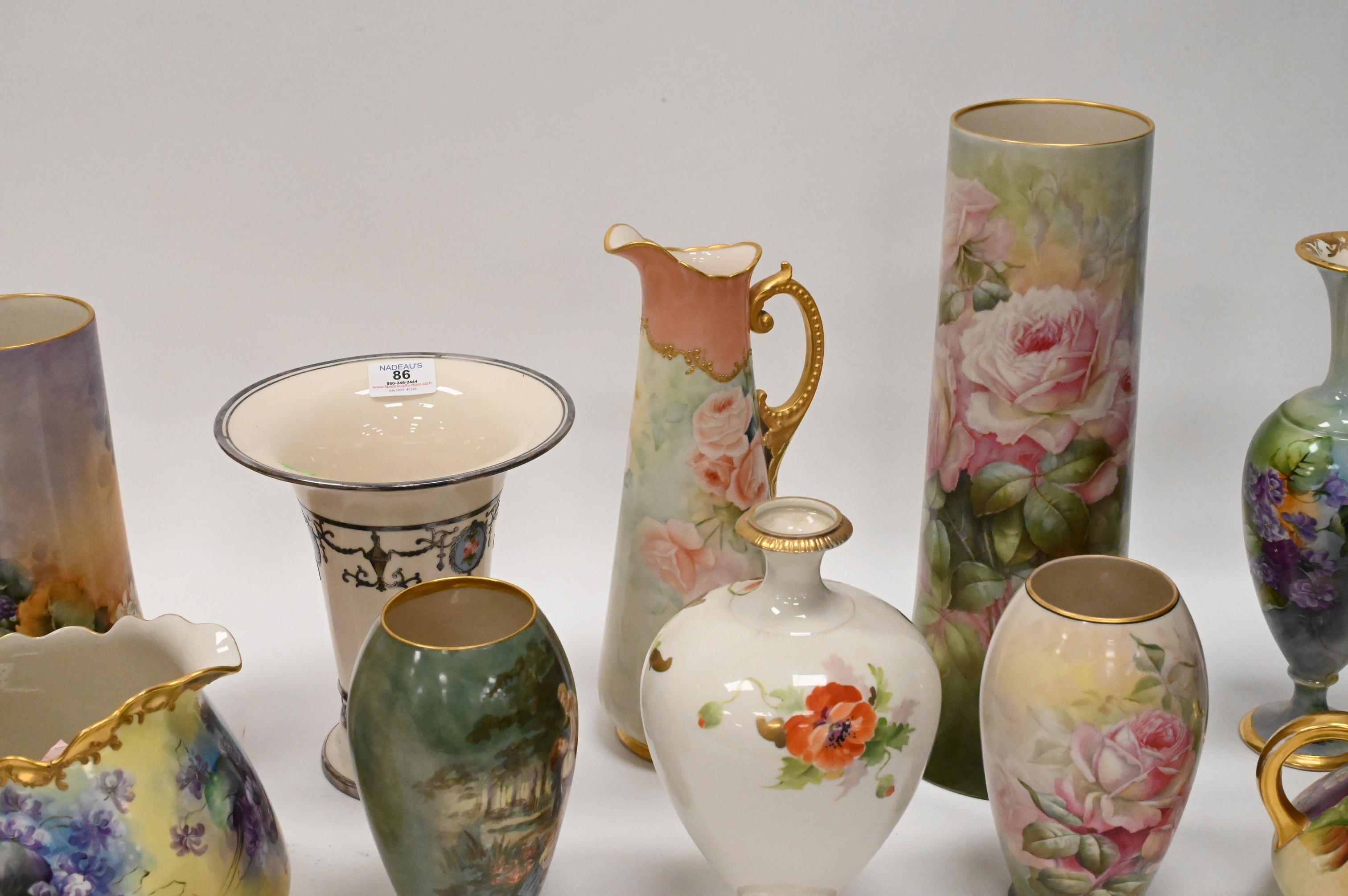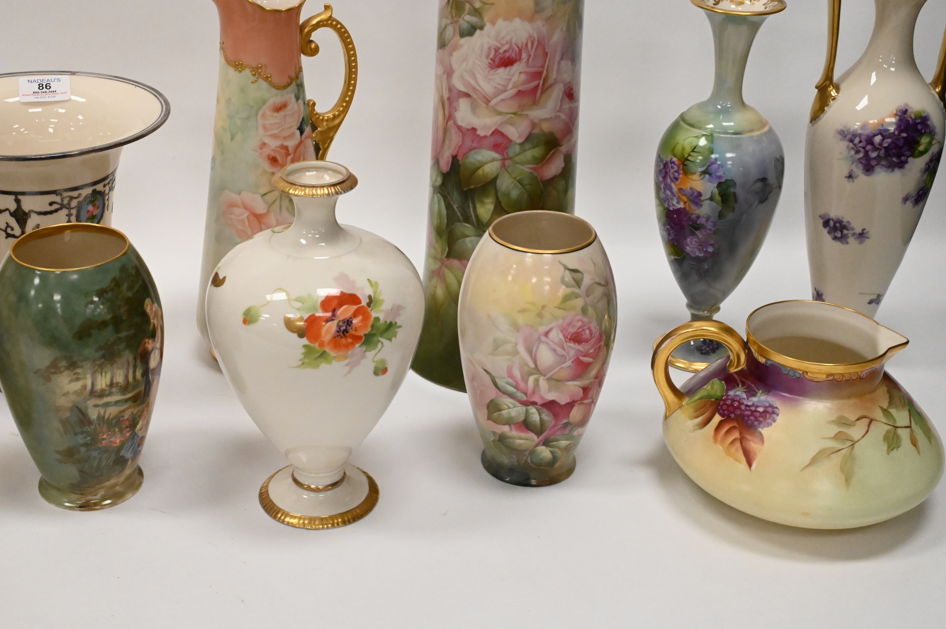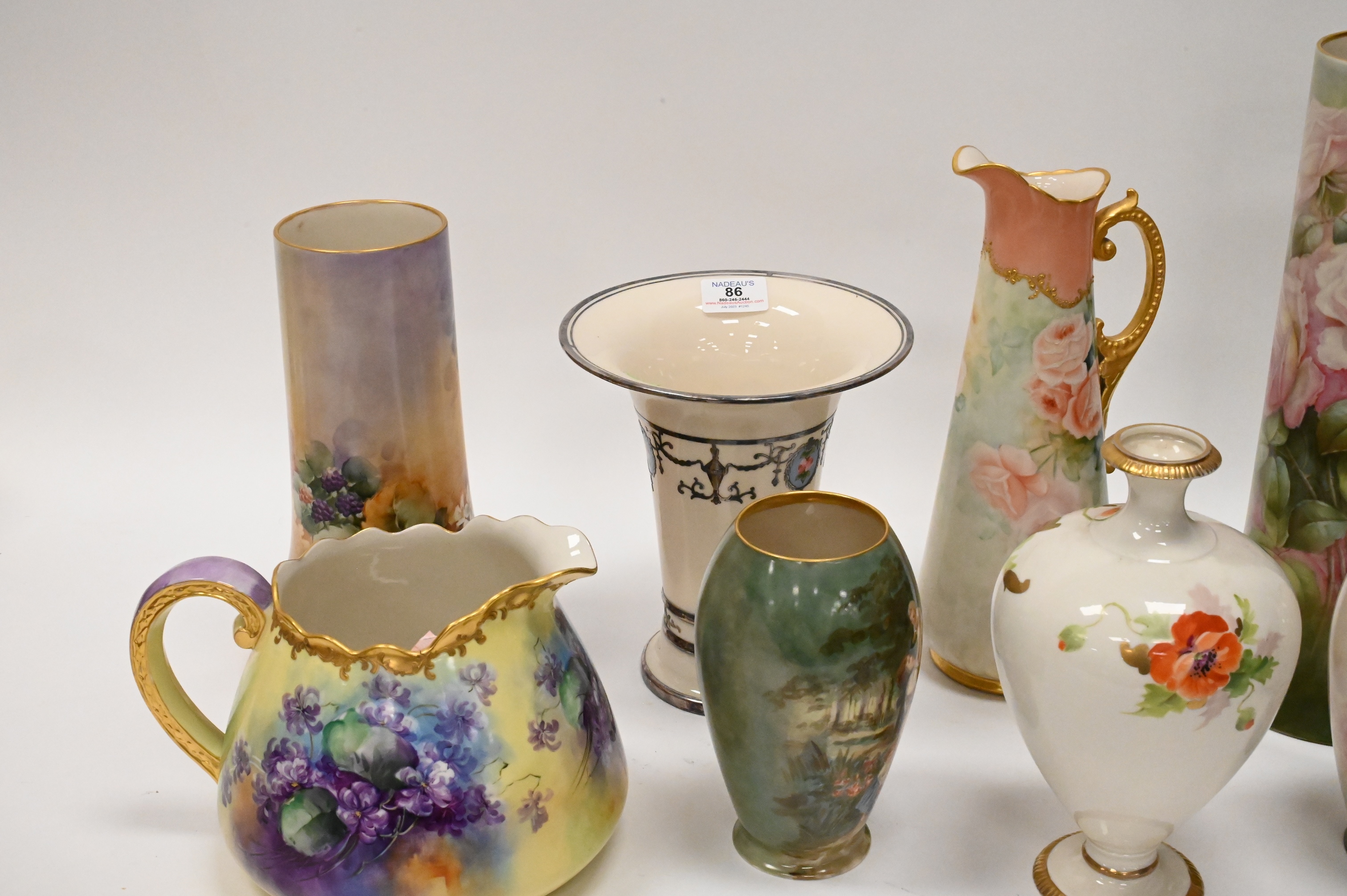 11 Piece Belleek Hand Painted Porcelain Lot, to include tall vases, pitchers, urn, some signed, tallest 16 inches.