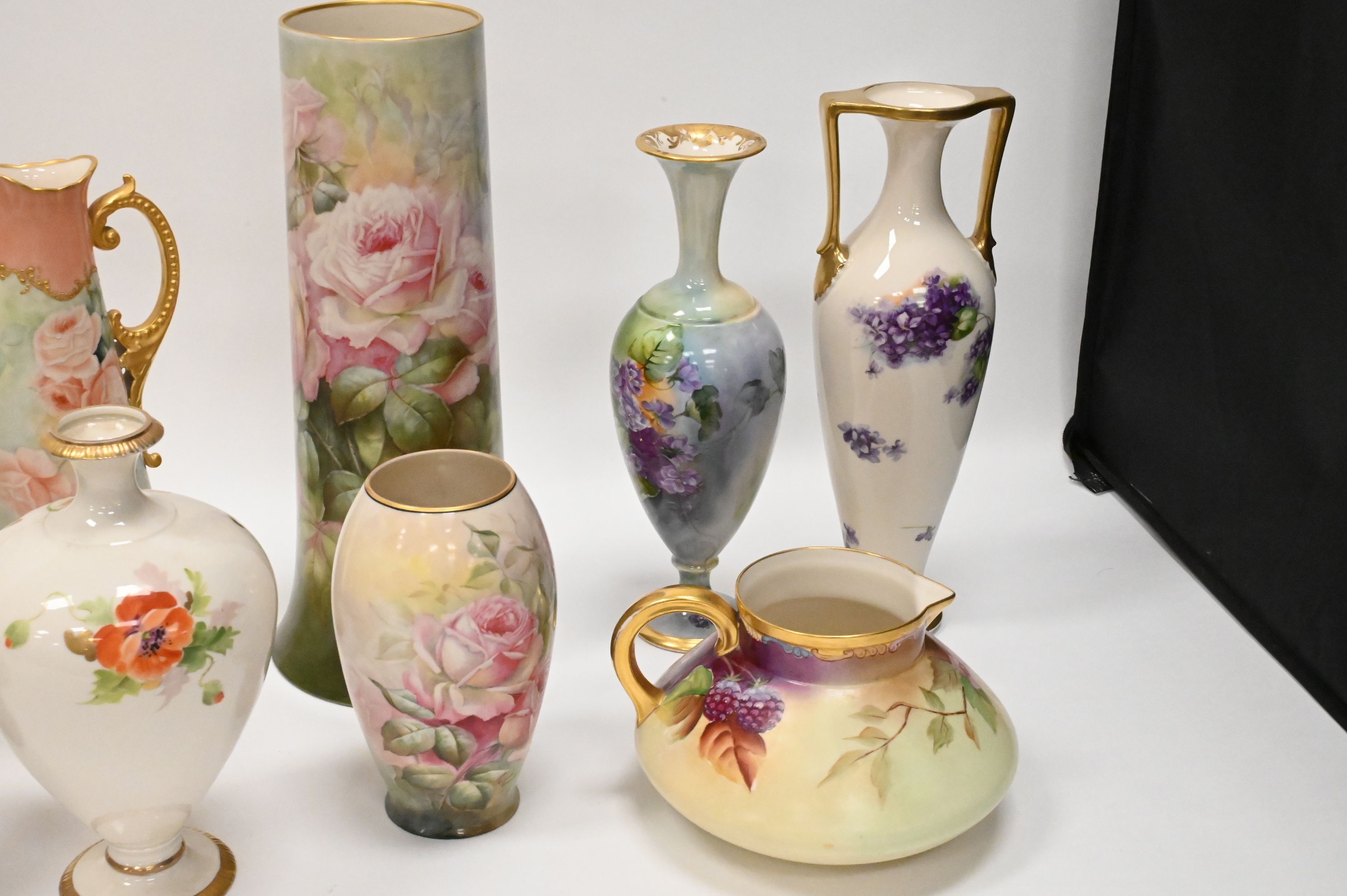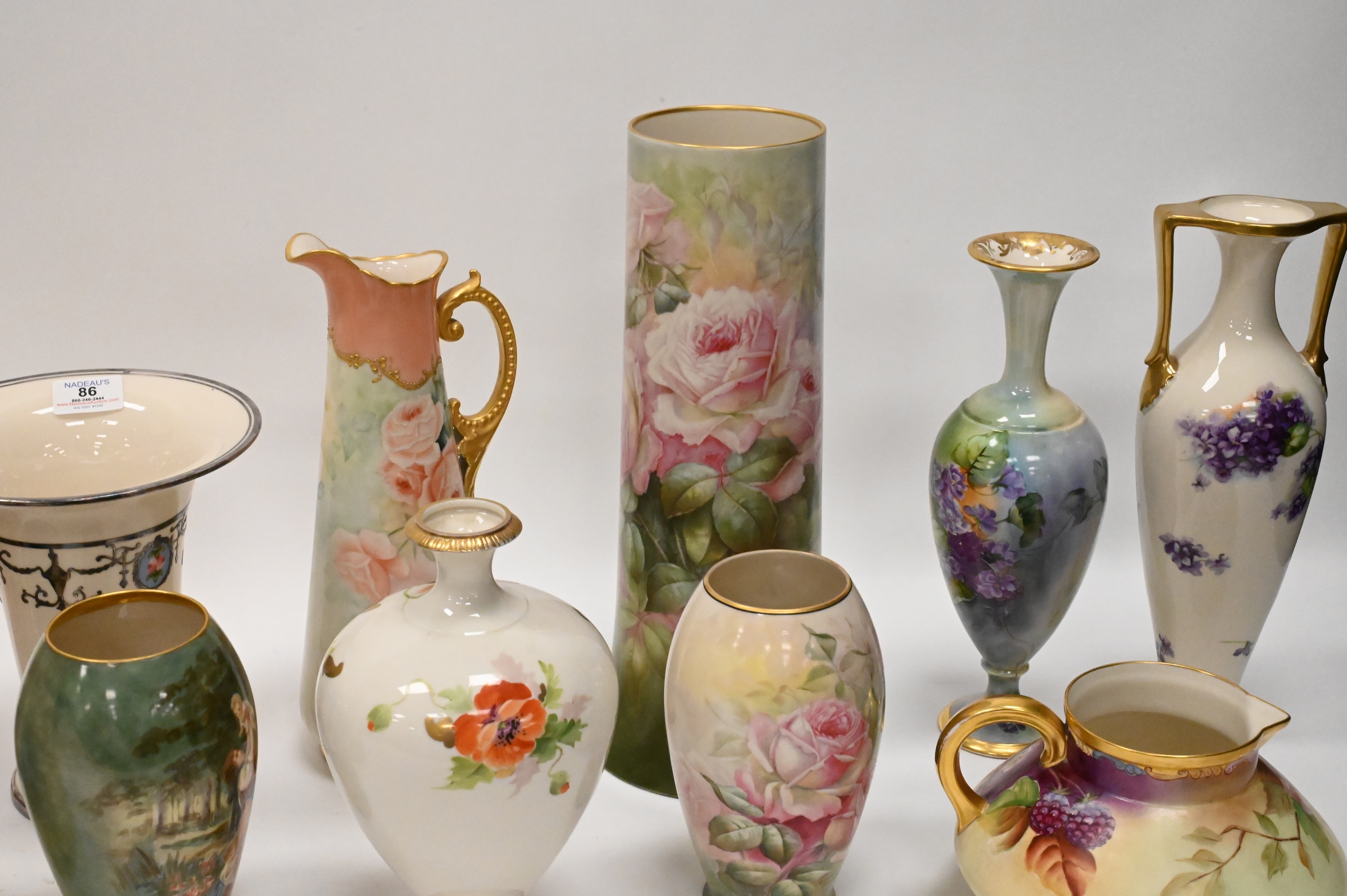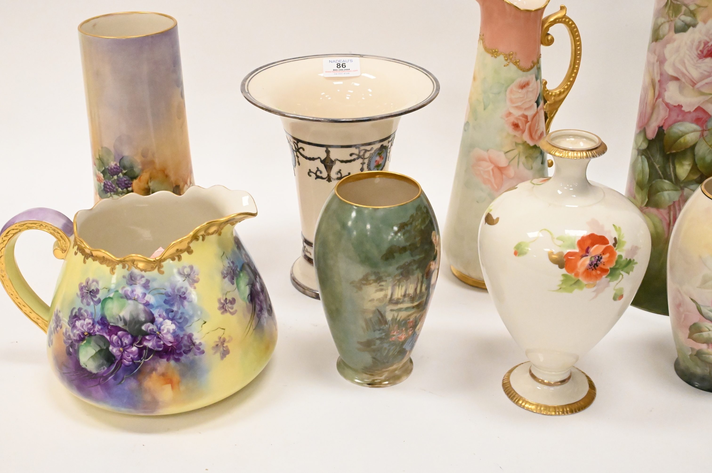 11 Piece Belleek Hand Painted Porcelain Lot, to include tall vases, pitchers, urn, some signed, tallest 16 inches.