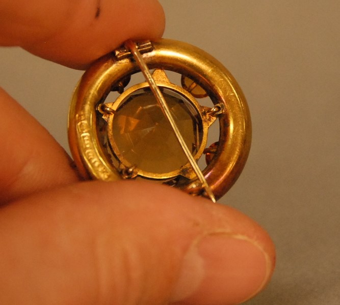 Lot 86: 15K gold pin set with center citrine surrounded by five citrines, circa 1890, Birmingham 625. dia. 1 1/8in.