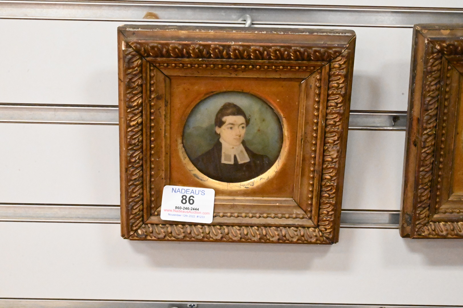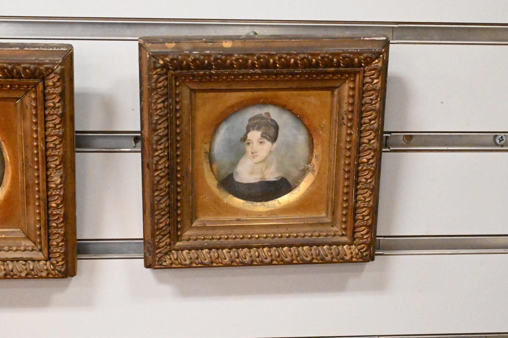 A Pair of Mini Paintings on Ivory, man and woman, early 19th century, diameter 3 inches. Please note: Items containing ivory cannot be purchased or shipped by bidders residing outside of the United States or California, Hawaii, Nevada, New Jersey, New York, Washington, Oregon, or District of Columbia. If an ivory item is purchased by a bidder in one of the above mentioned locations or attempts to ship ivory to one of the above mentioned locations, bidder will forfeit the item and be responsible for any incurred fees such as a restocking fee.