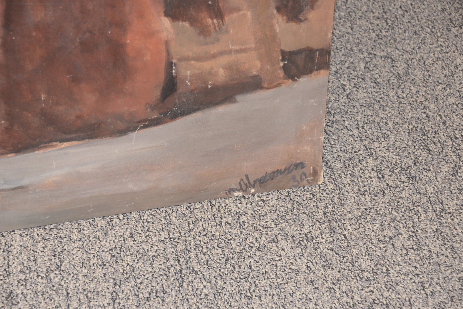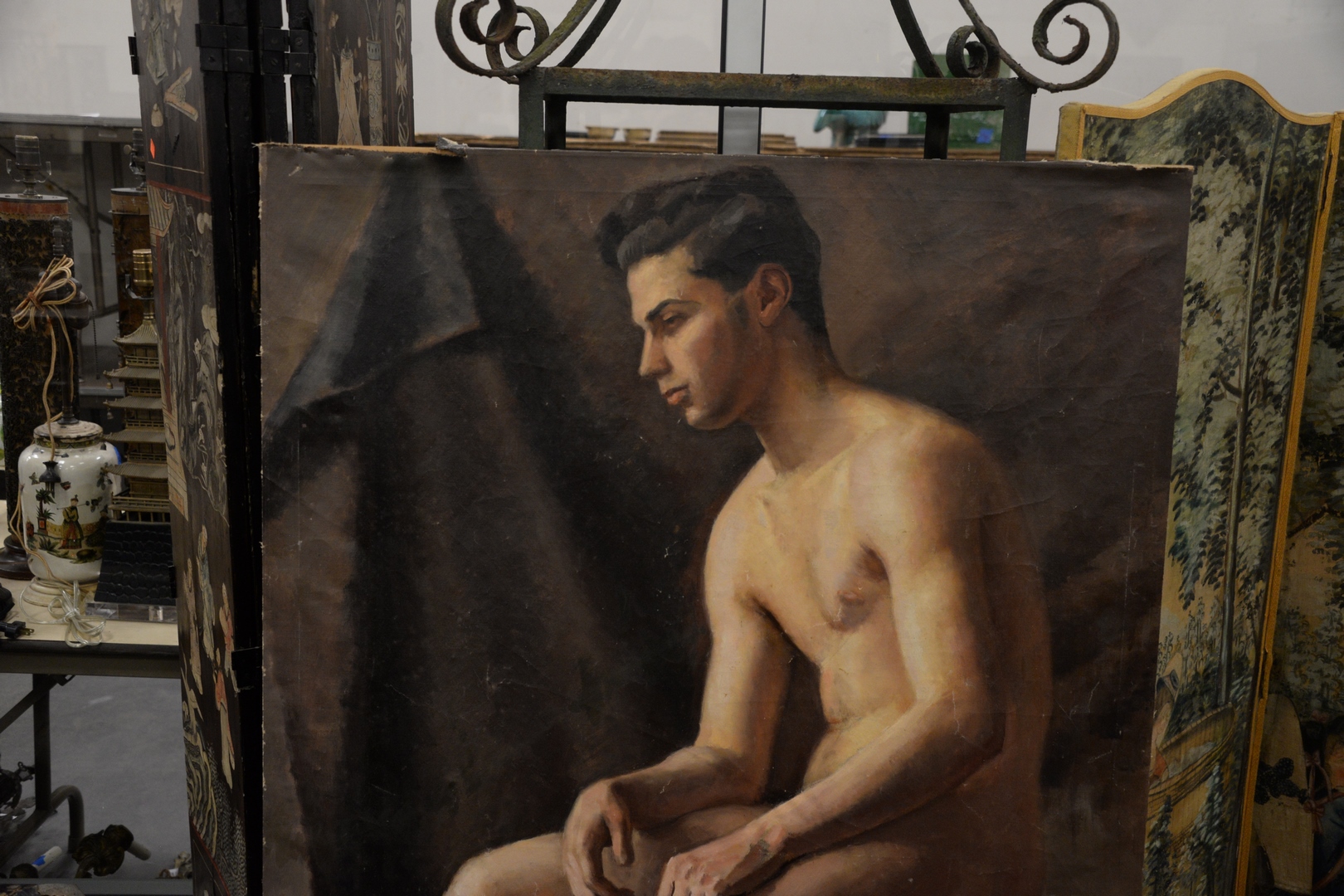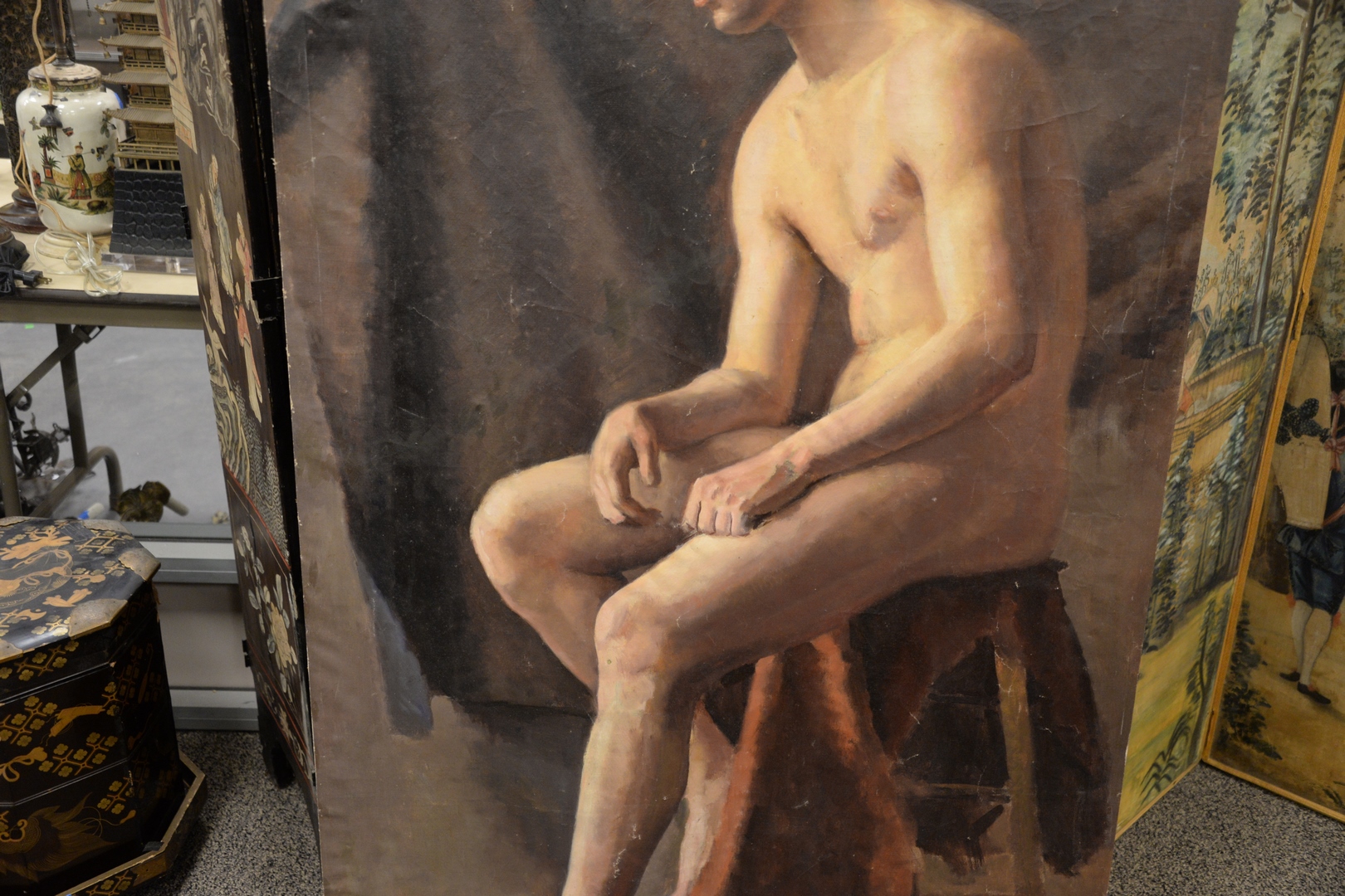 Lot 86: American School early 20th century, life size male nude, oil on canvas, signed indistinctly and dated ’39’ lower right, 36 x 59, as is with specks of paint loss. Provenance: Previously part of the Seymour Stein Collection.
