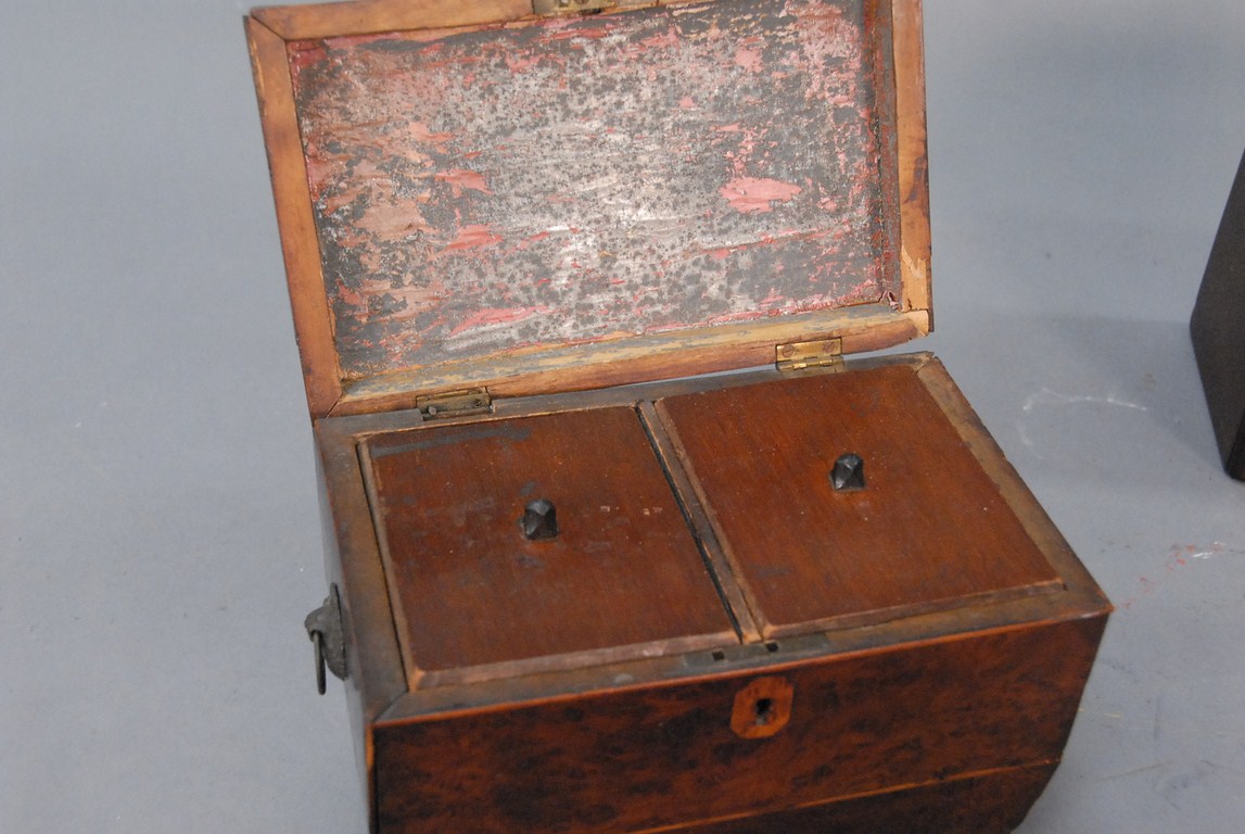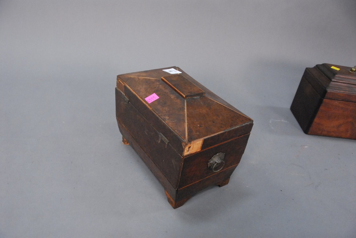 Lot 86: Burlwood tea box with two covered interior compartments and bracket feet, two side handles in form of basket of flowers. ht. 7in. w…