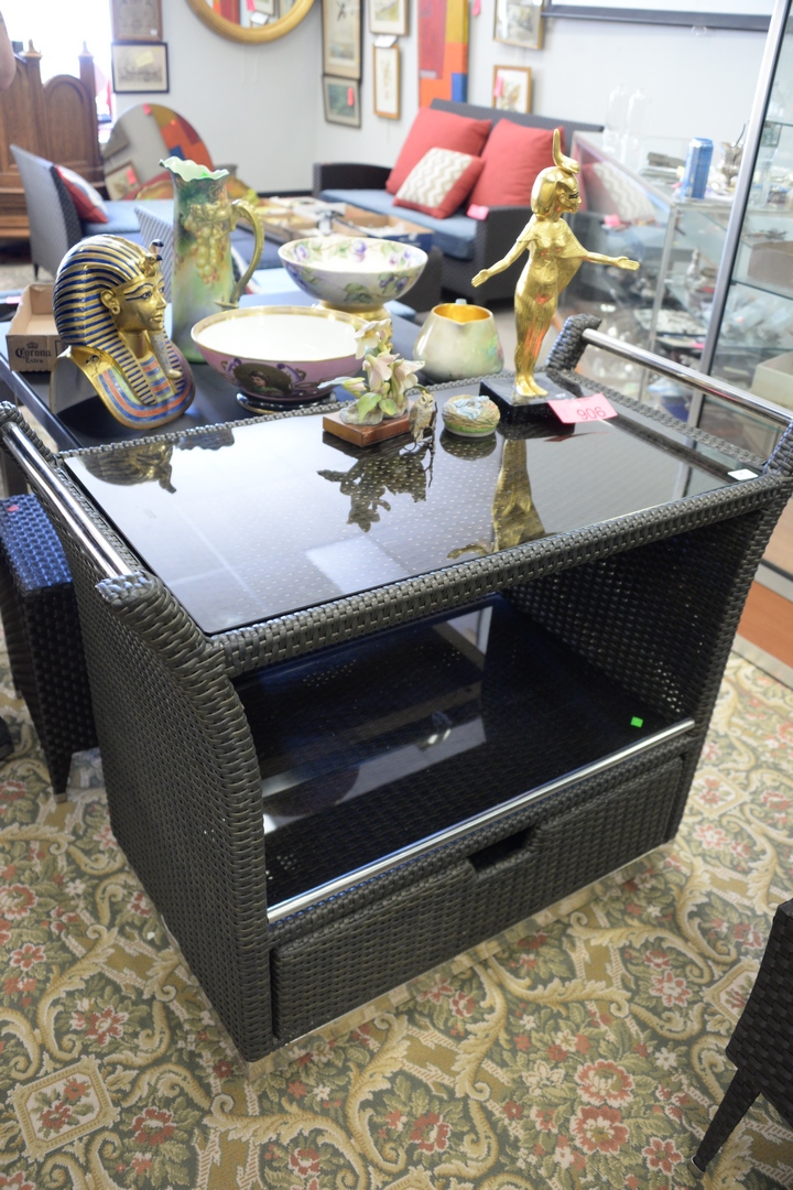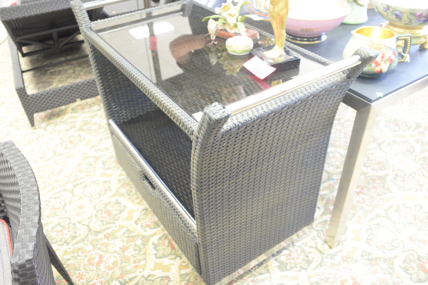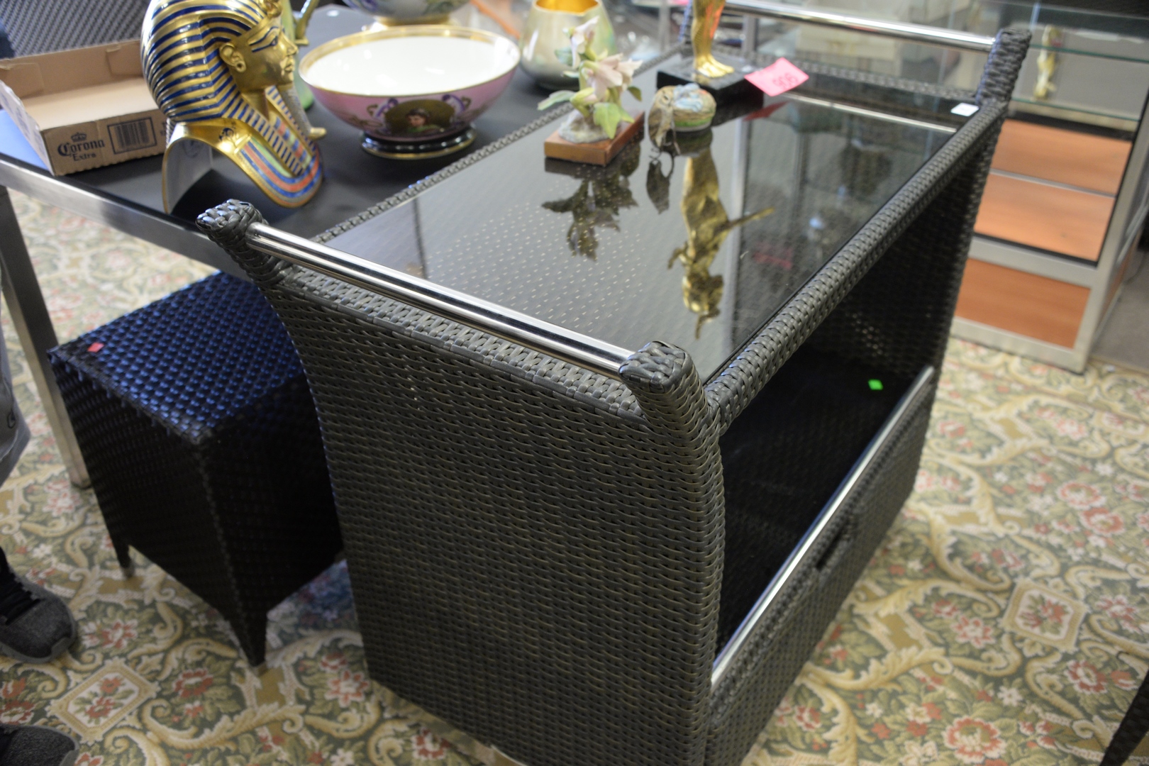 Lot 86: Contemporary Outdoor Serving Cart, woven with chrome and glass tops and bottom drawer, height 36 inches, length 44 inches. Provenance: David and Cynthia Kim, 22 Stoney Wylde Lane, Greenwich, Connecticut. View home by visiting: https://www.zillow.com/homedetails/22-Stoney-Wylde-Ln-Greenwich-CT-06830/177238281_zpid/