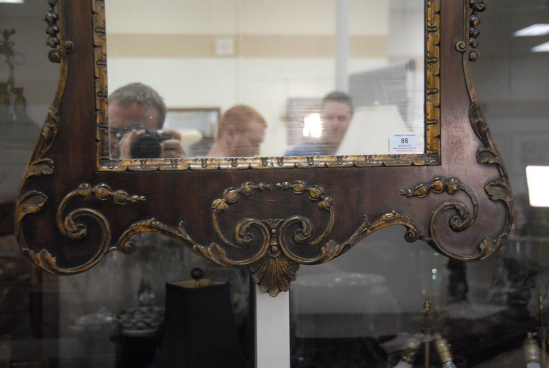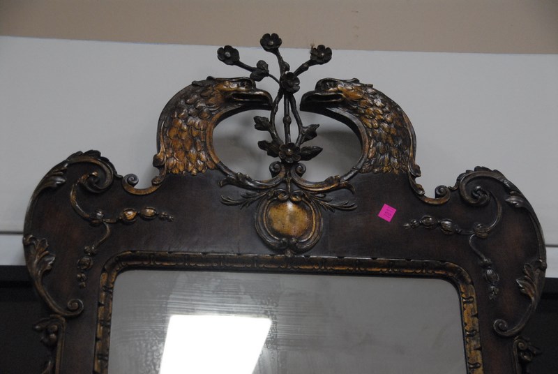 Custom mahogany mirror, top with two eagle heads, ht. 50in.