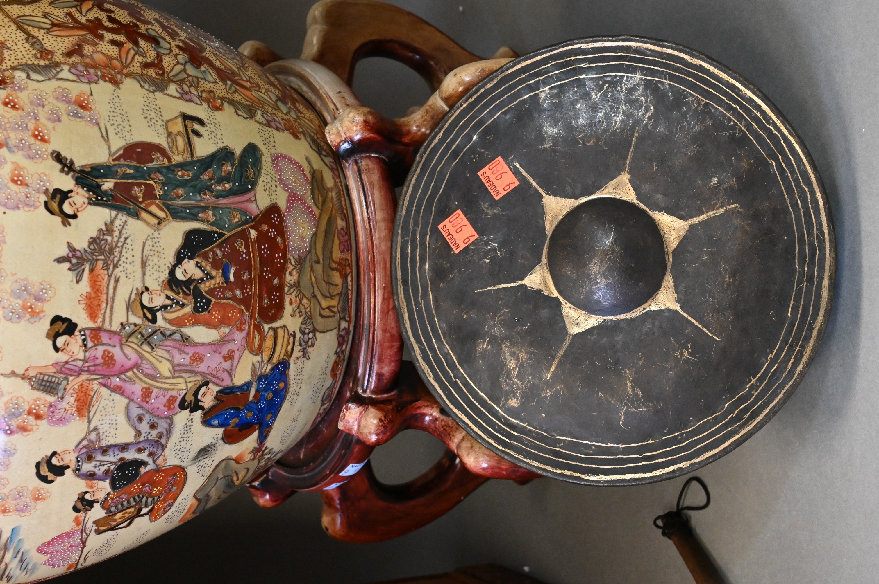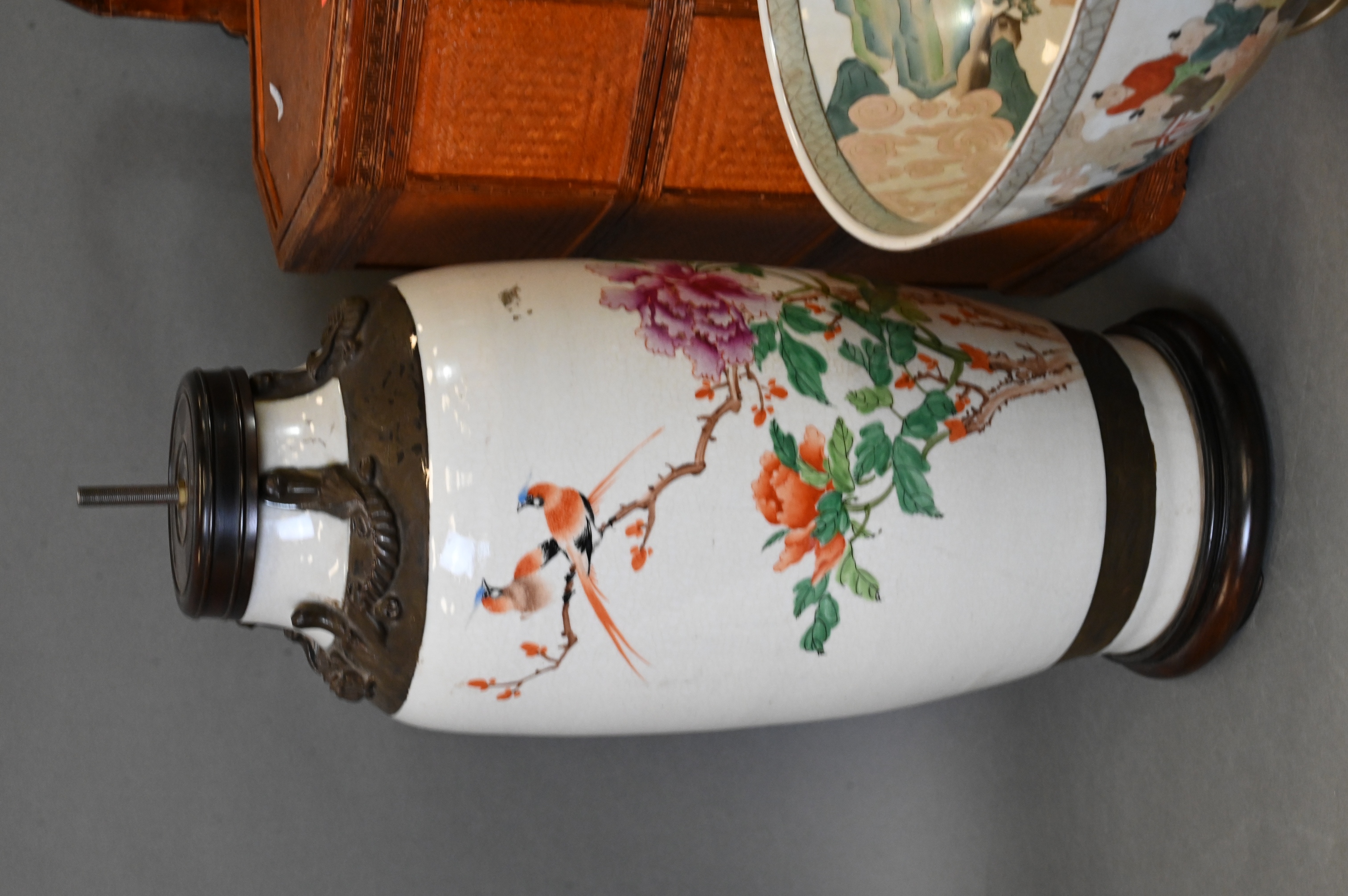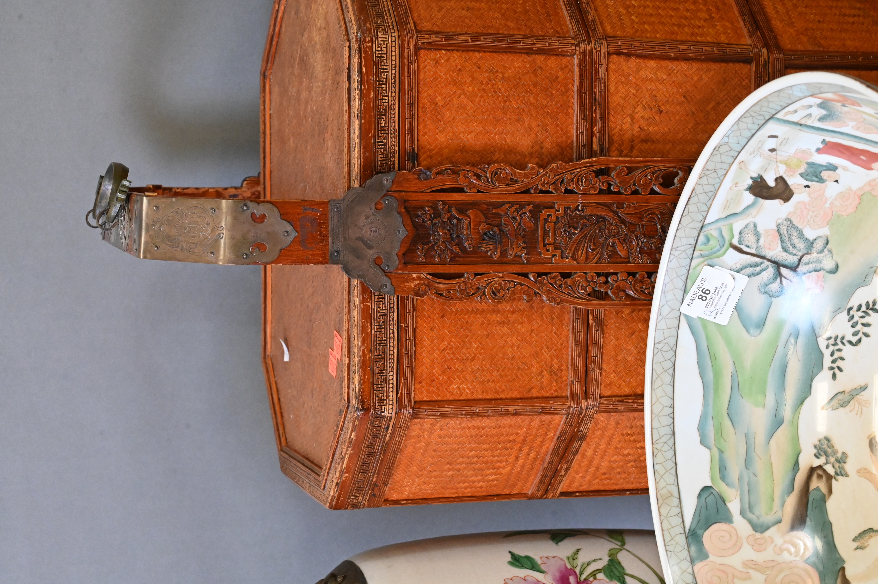three woven boxes with openwork carved and metal mounted sides featuring geishas and scholars
