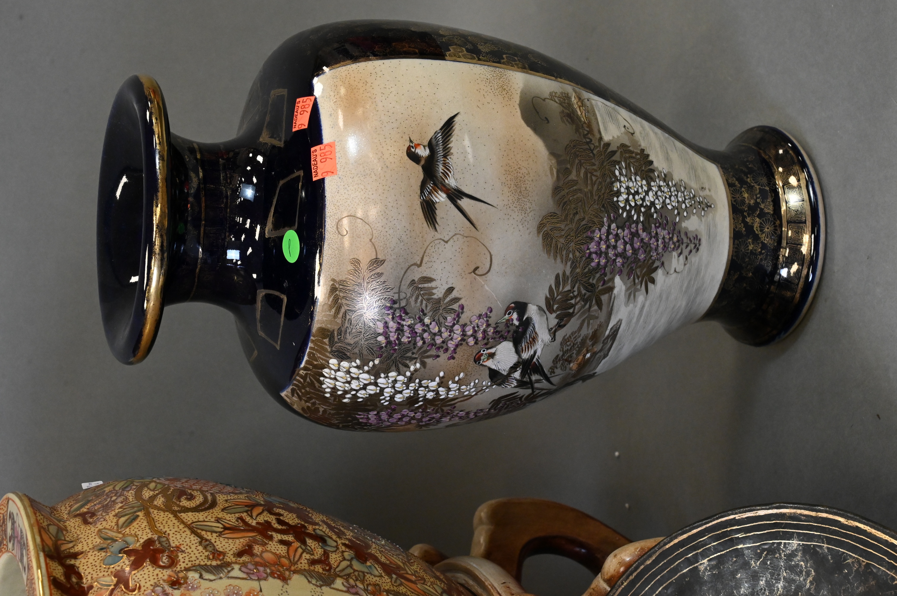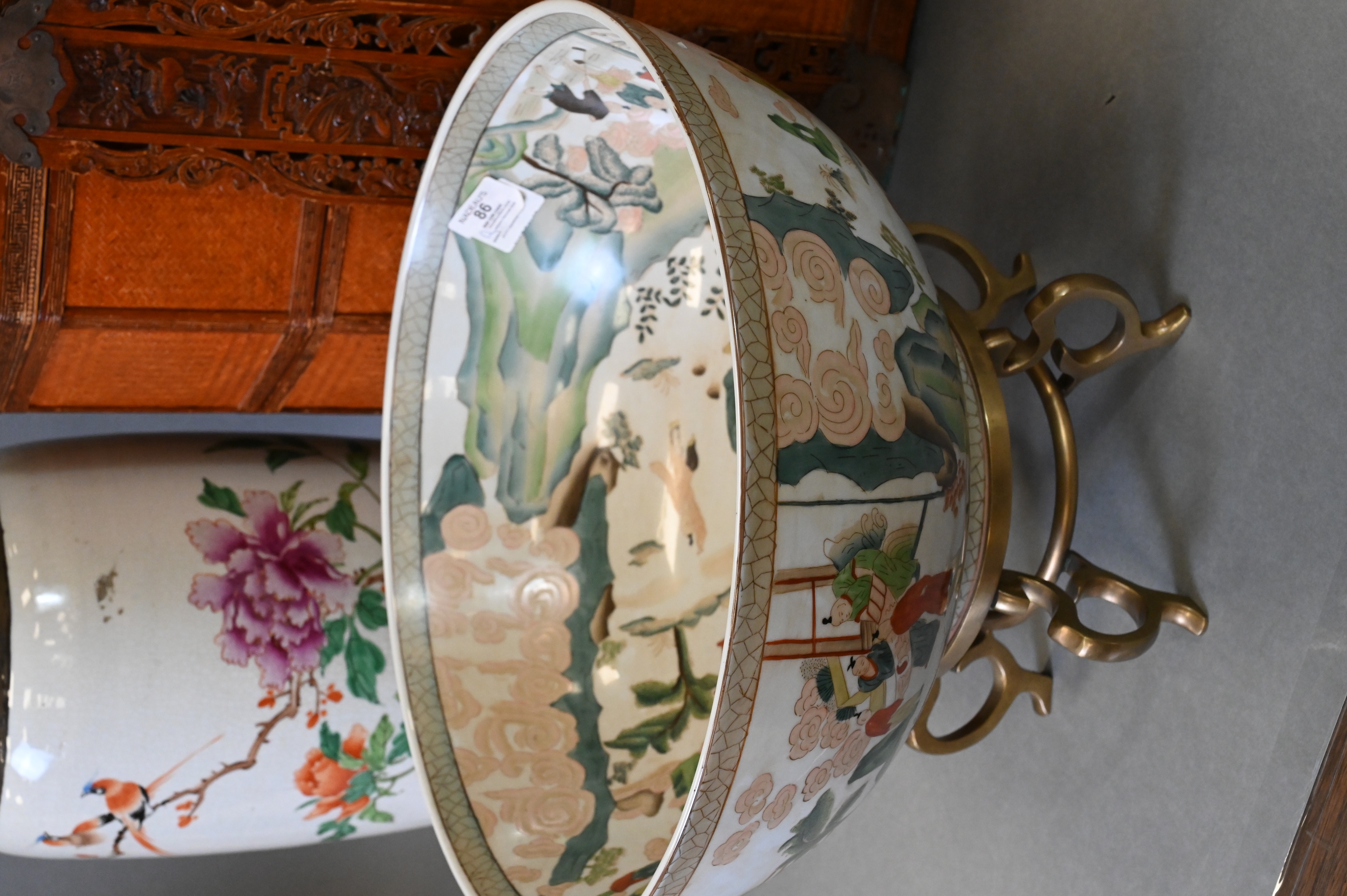 featuring crackle glaze painted rim over motif of boys playing in a mountain landscape with mythical creatures