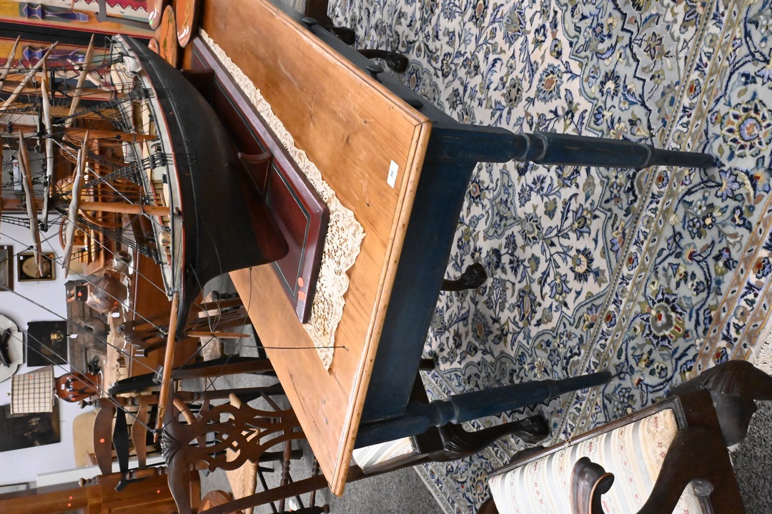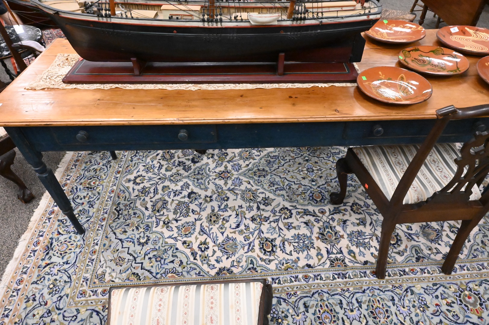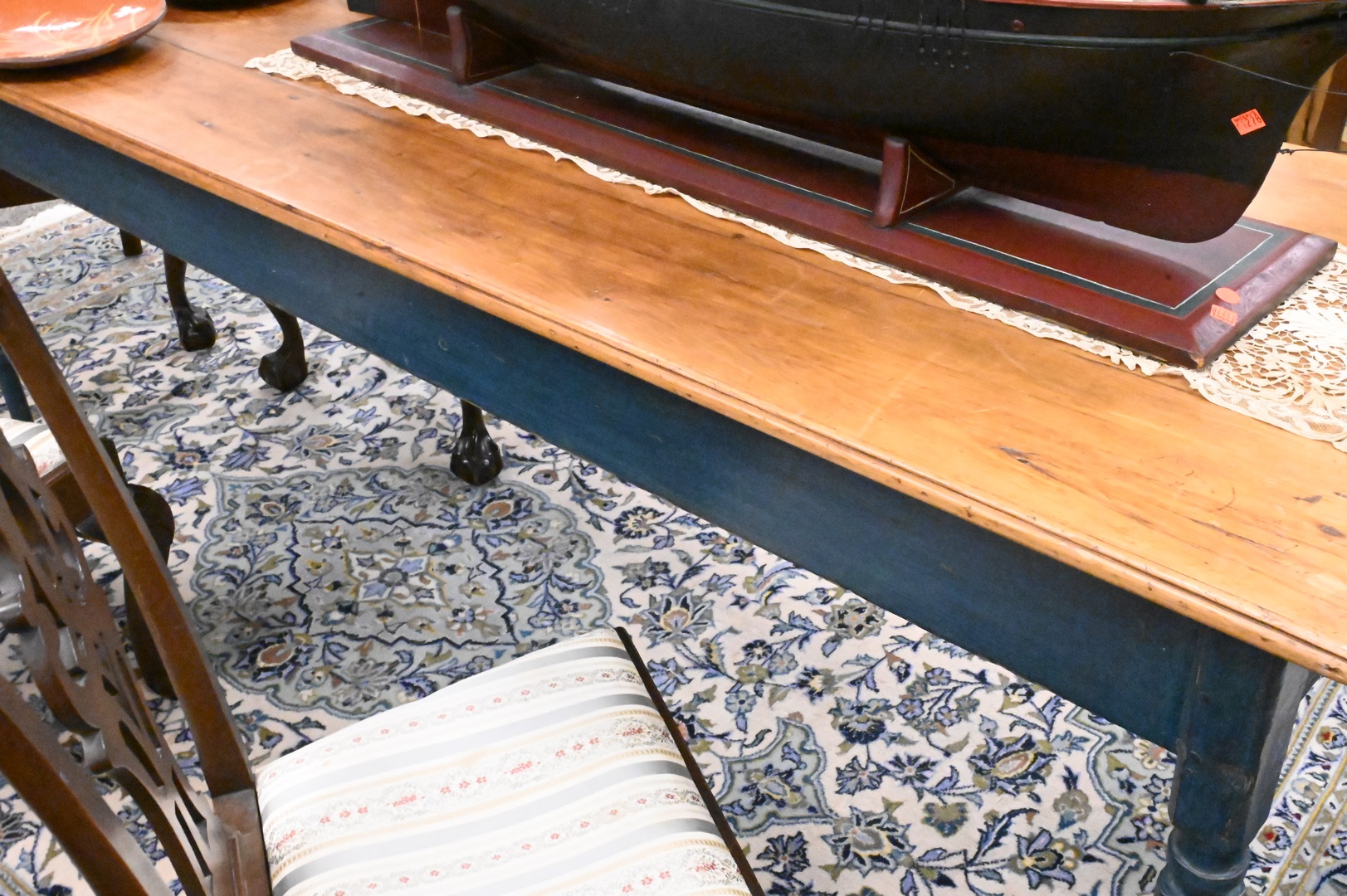 Farm Style Table, having two drawers, on turned legs with molded top, height 30 3/4 inches, top 29 1/2″ x 88 1/2″. Provenance: Estate of Peter Tillou, Litchfield, Connecticut.