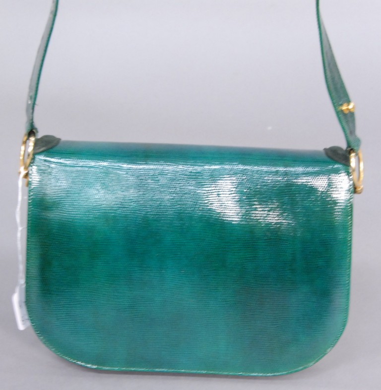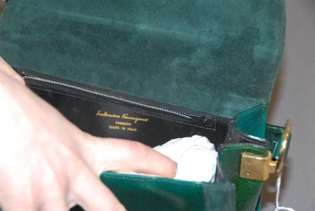 Ferragamo green reptile and suede purse bag. height 8in. width 10 1/2in.