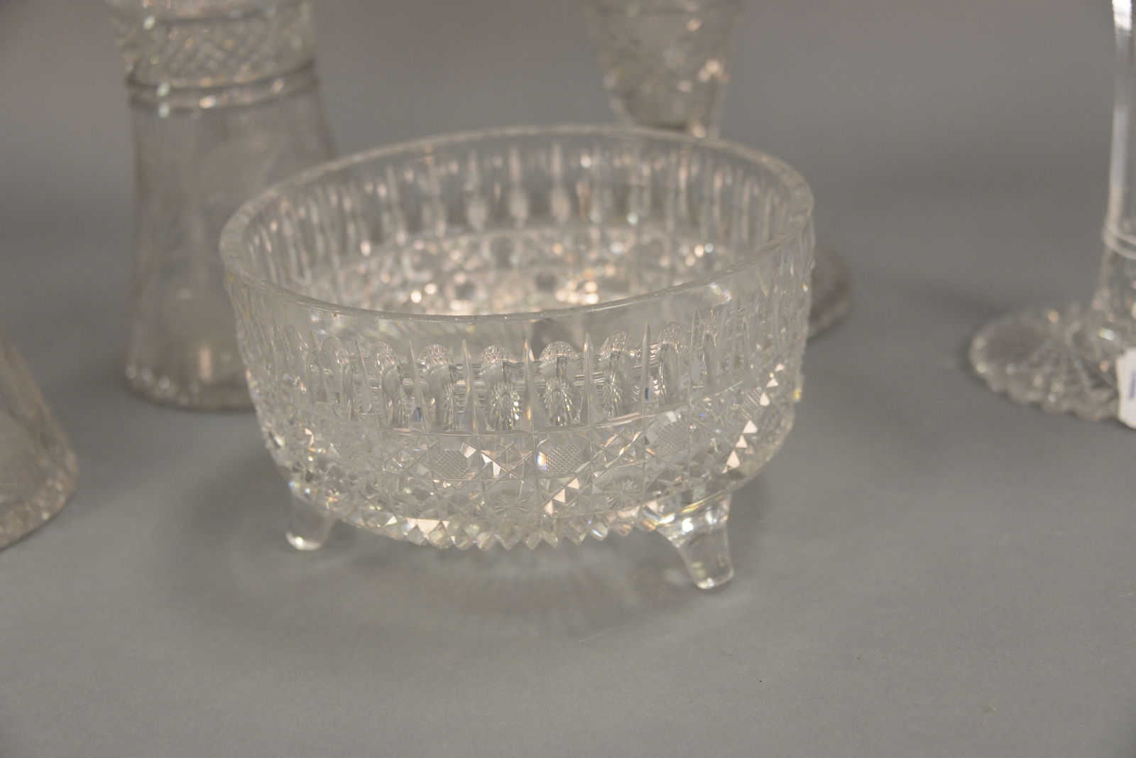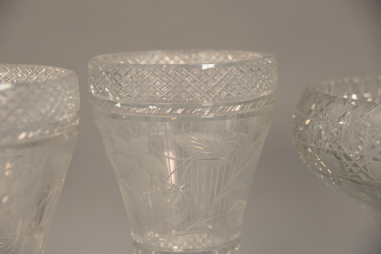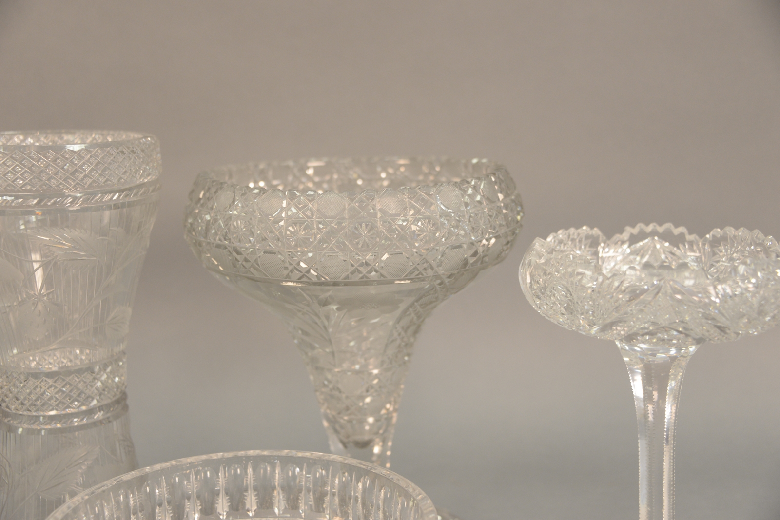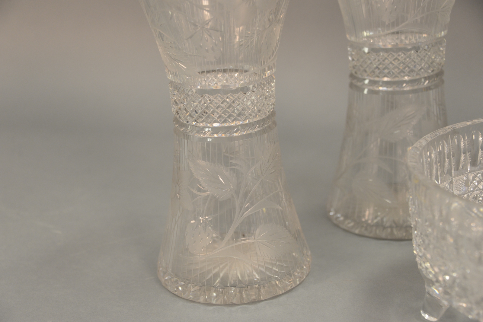 Five cut glass pieces to include two compotes, pair of vases, and a footed bowl. hts. 4 1/4in. to 11 1/2in.