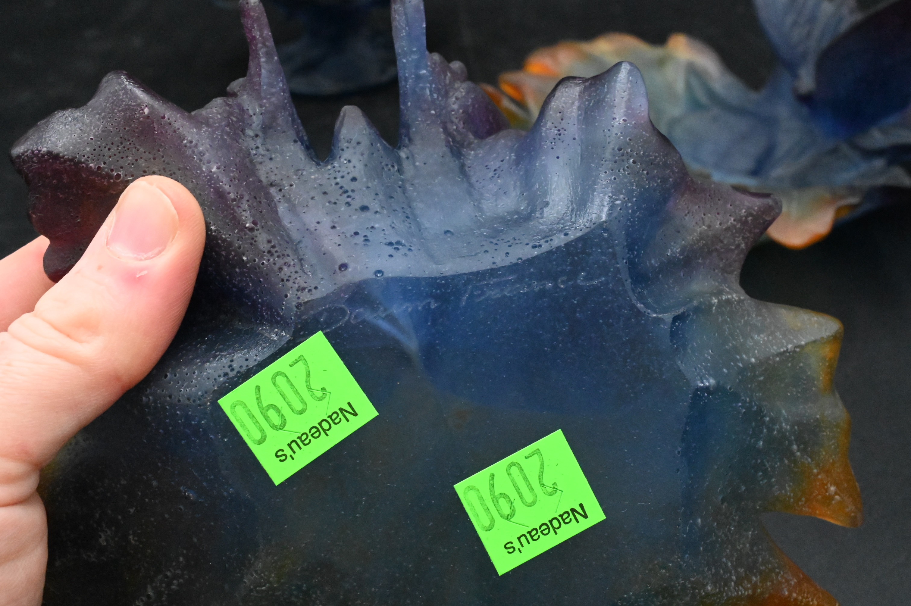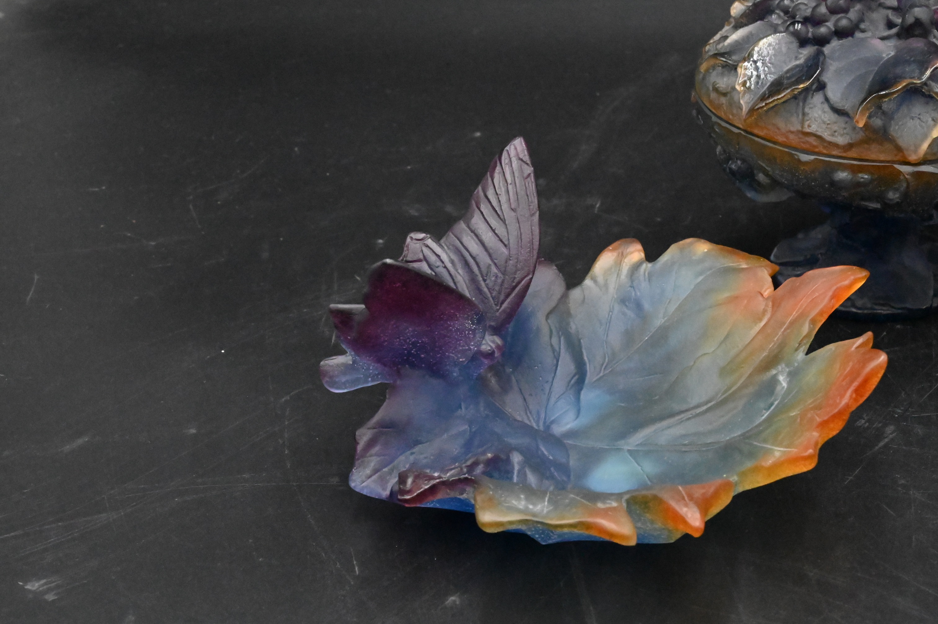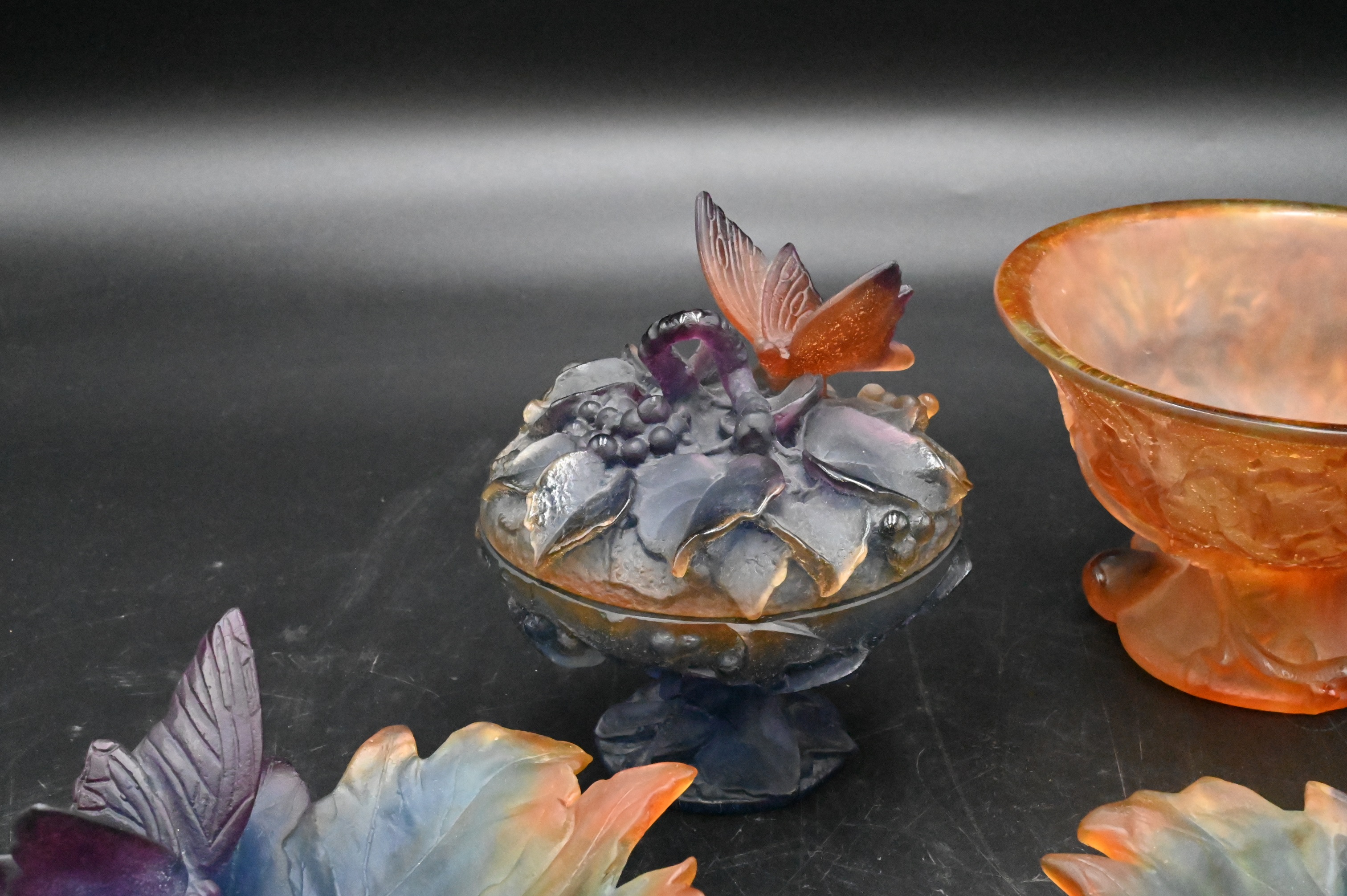 Four Daum Dishes, one having cover, all with original boxes, heights of 2 1/2 inches – 5 1/4 inches.