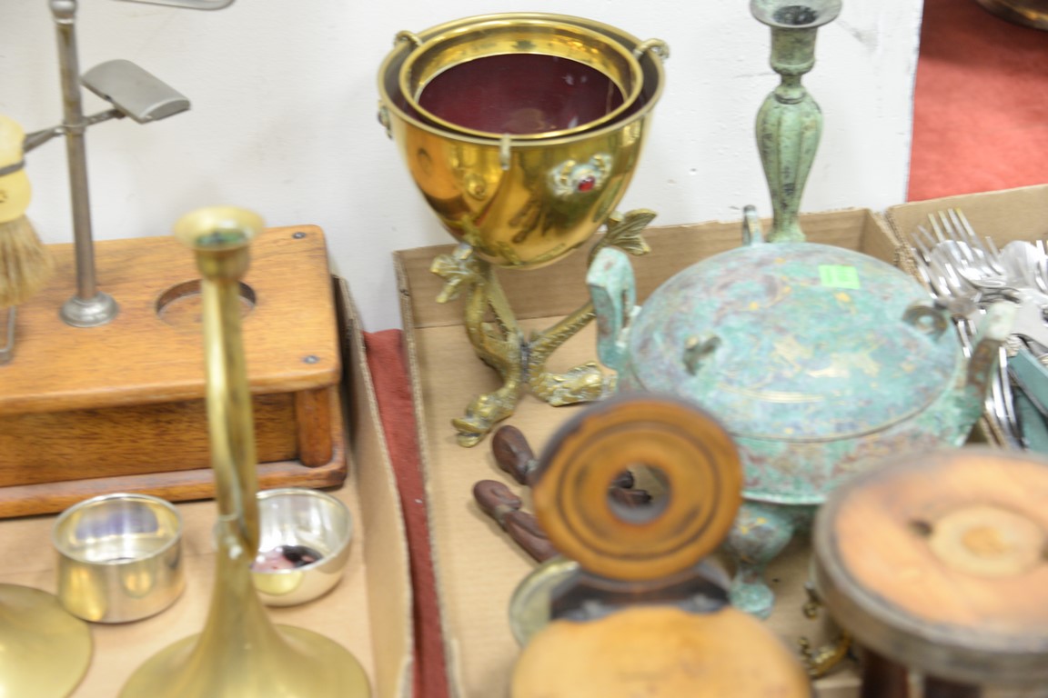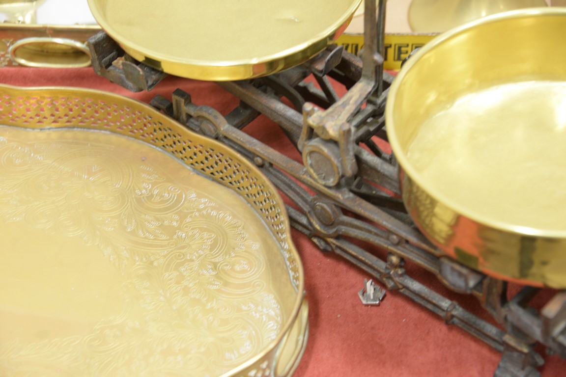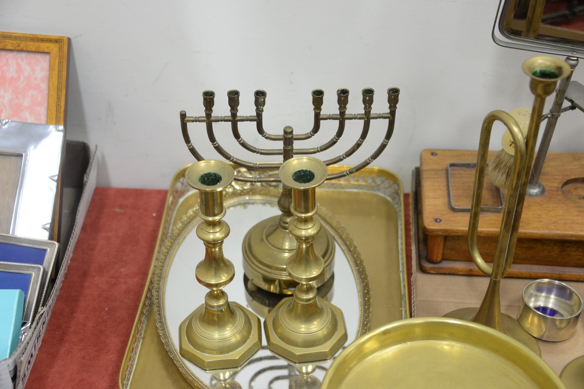Lot 86: Group of brass and wood items to include a pair of push up candlesticks, brass scale, shaving mirror, trays, etc.