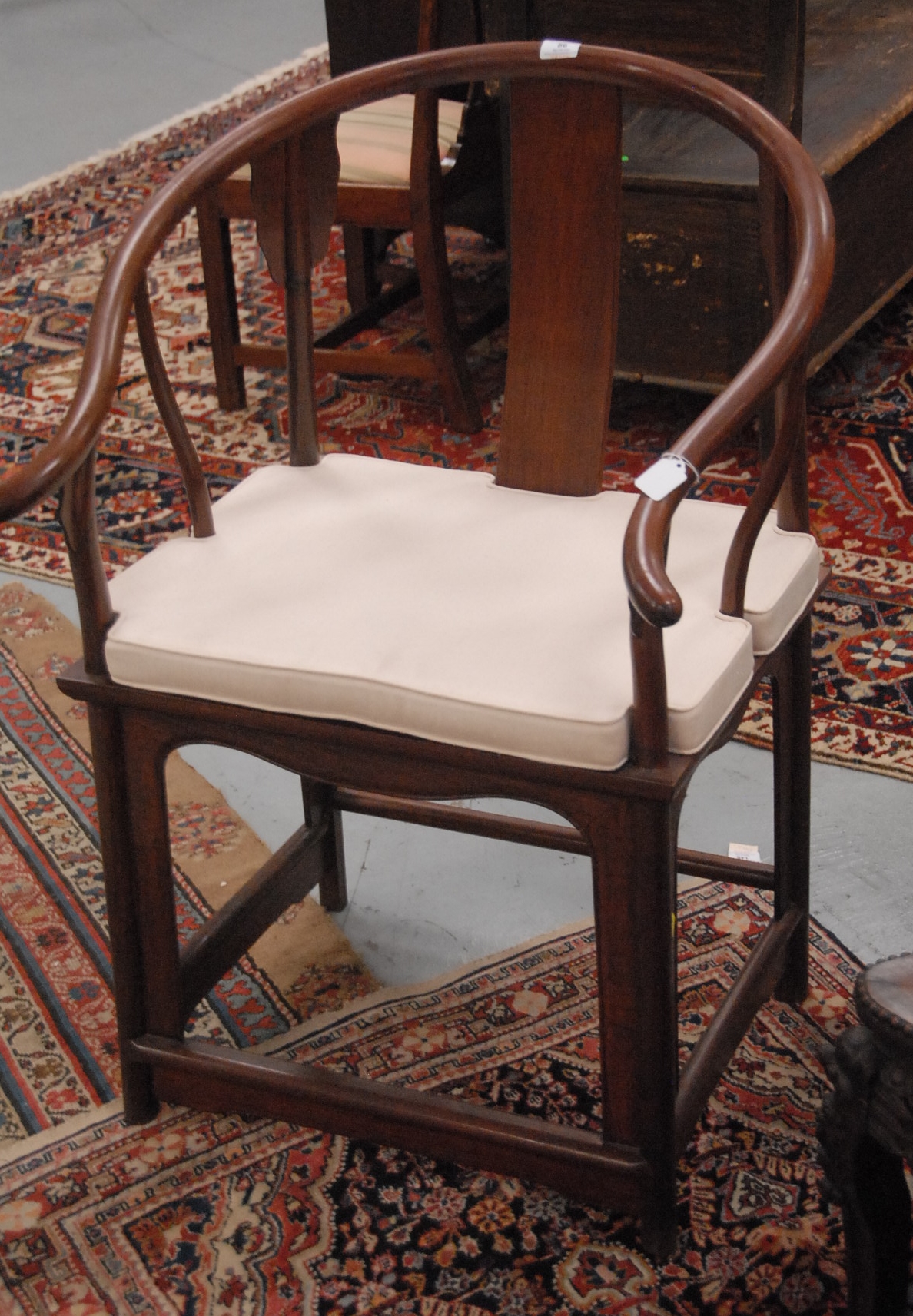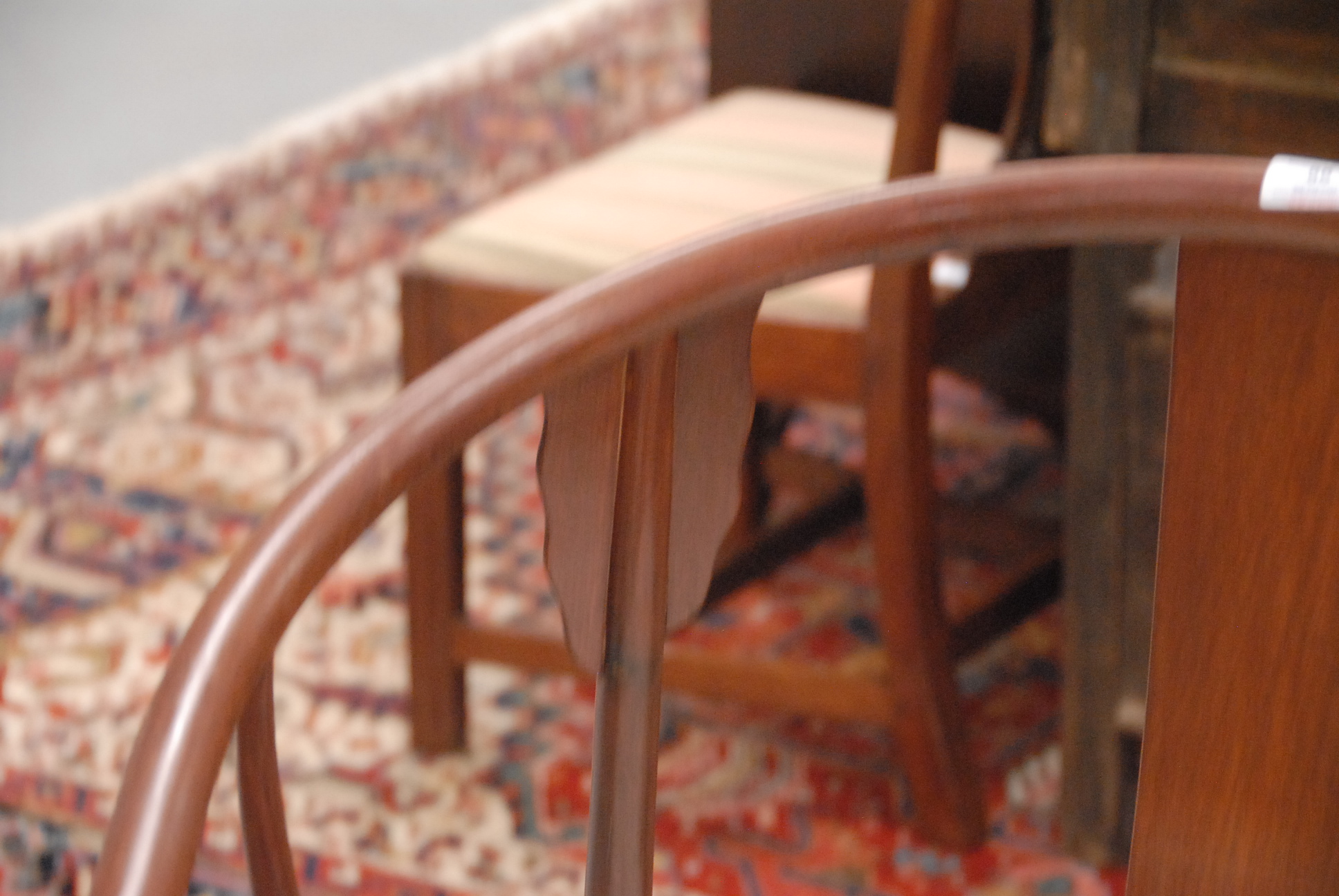 Hardwood horseshoe back armchair in plain form and stretcher base.