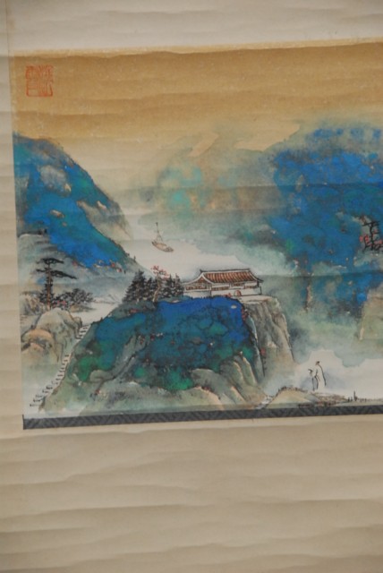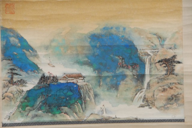 Oriental scroll having 2 panels bright.ly colored landscapes