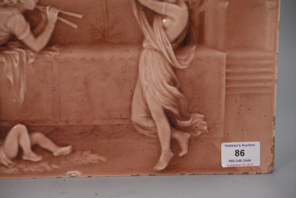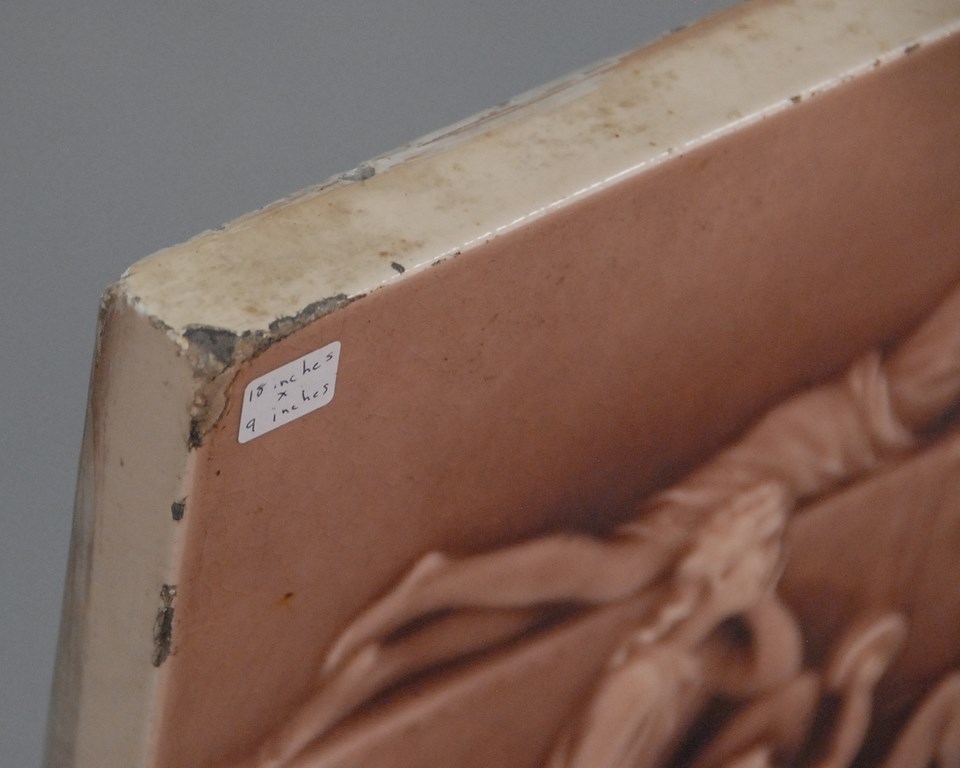 Porcelain tile plaque attributed to Low, 18 x 9.
