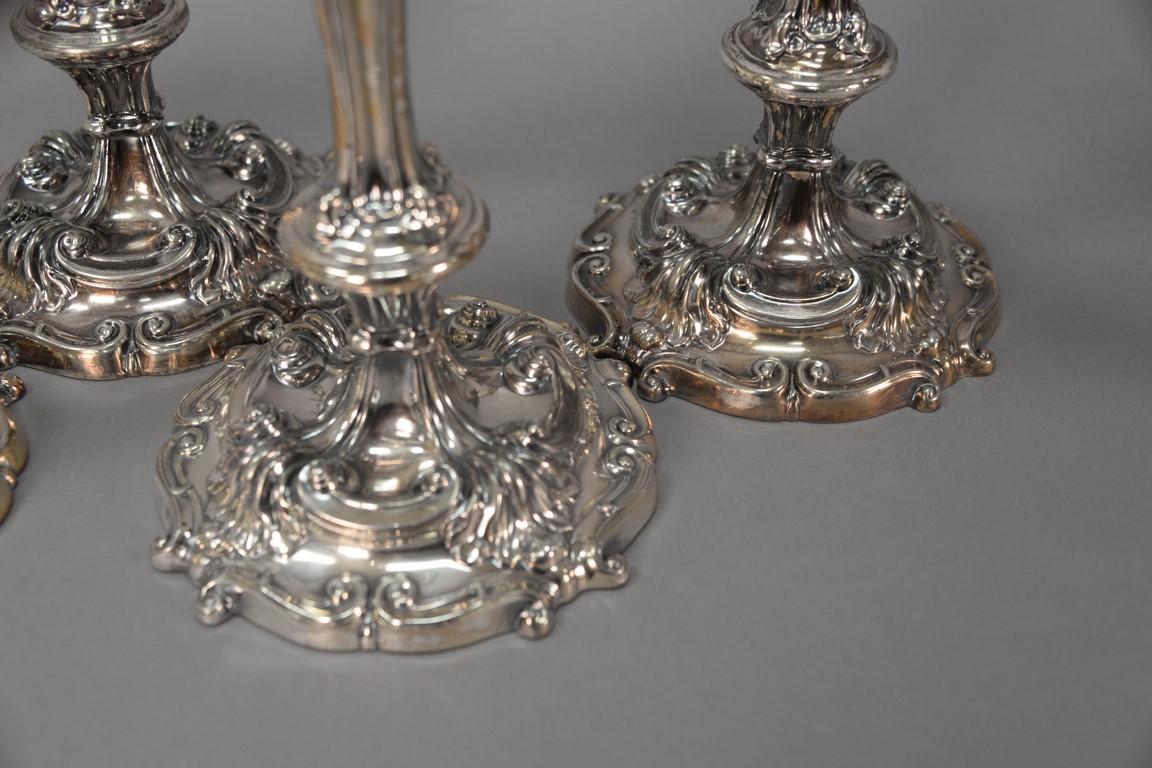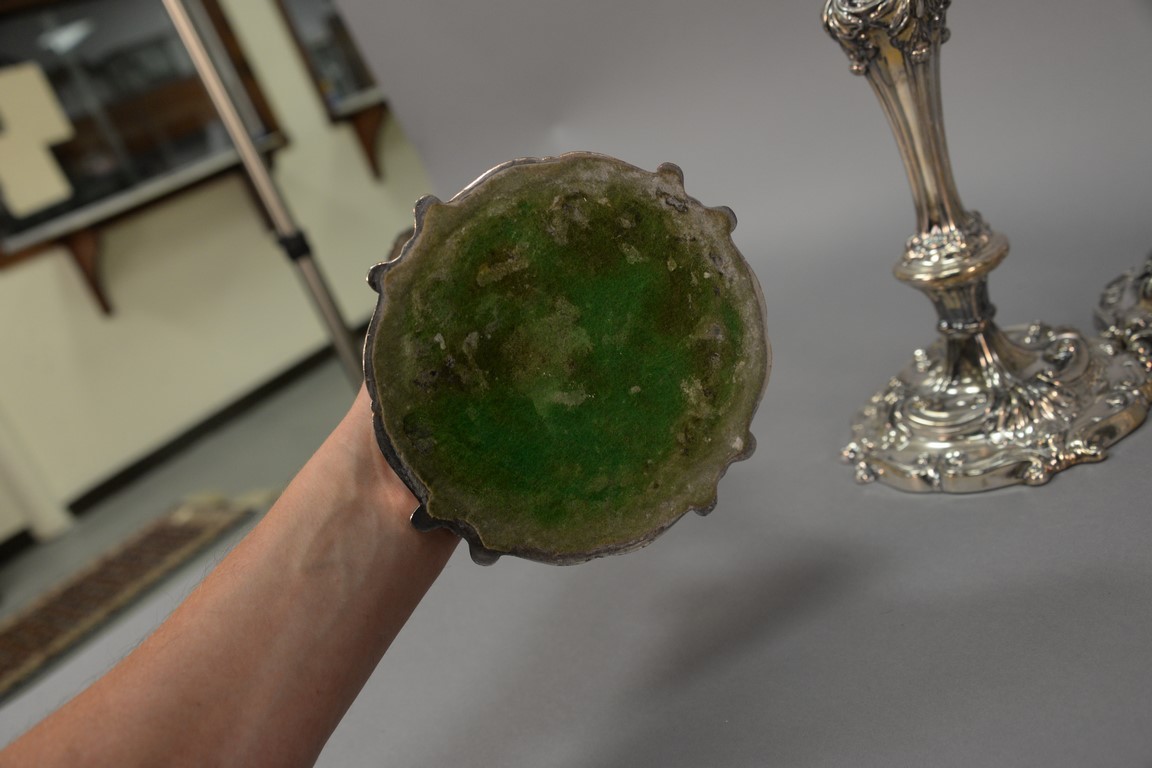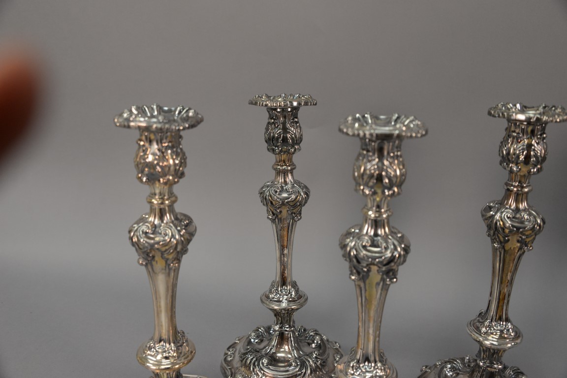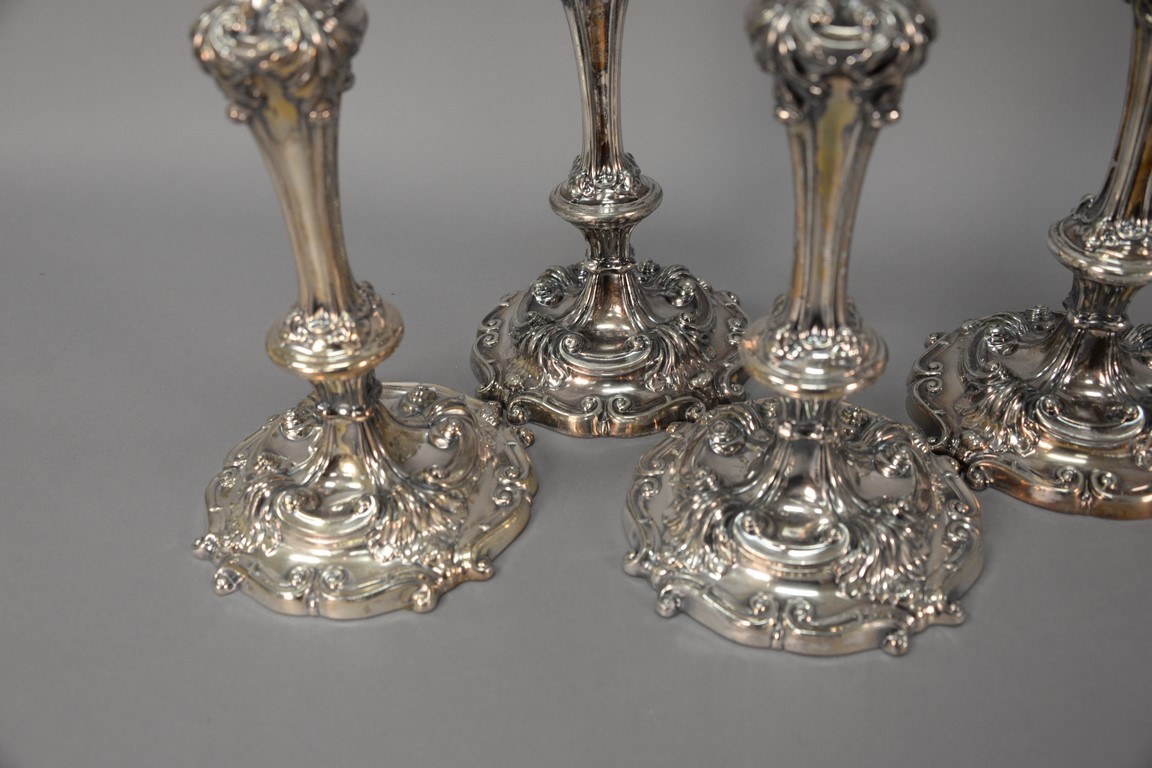 Lot 86: Set of four silverplated candlesticks. ht. 13 1/2in.