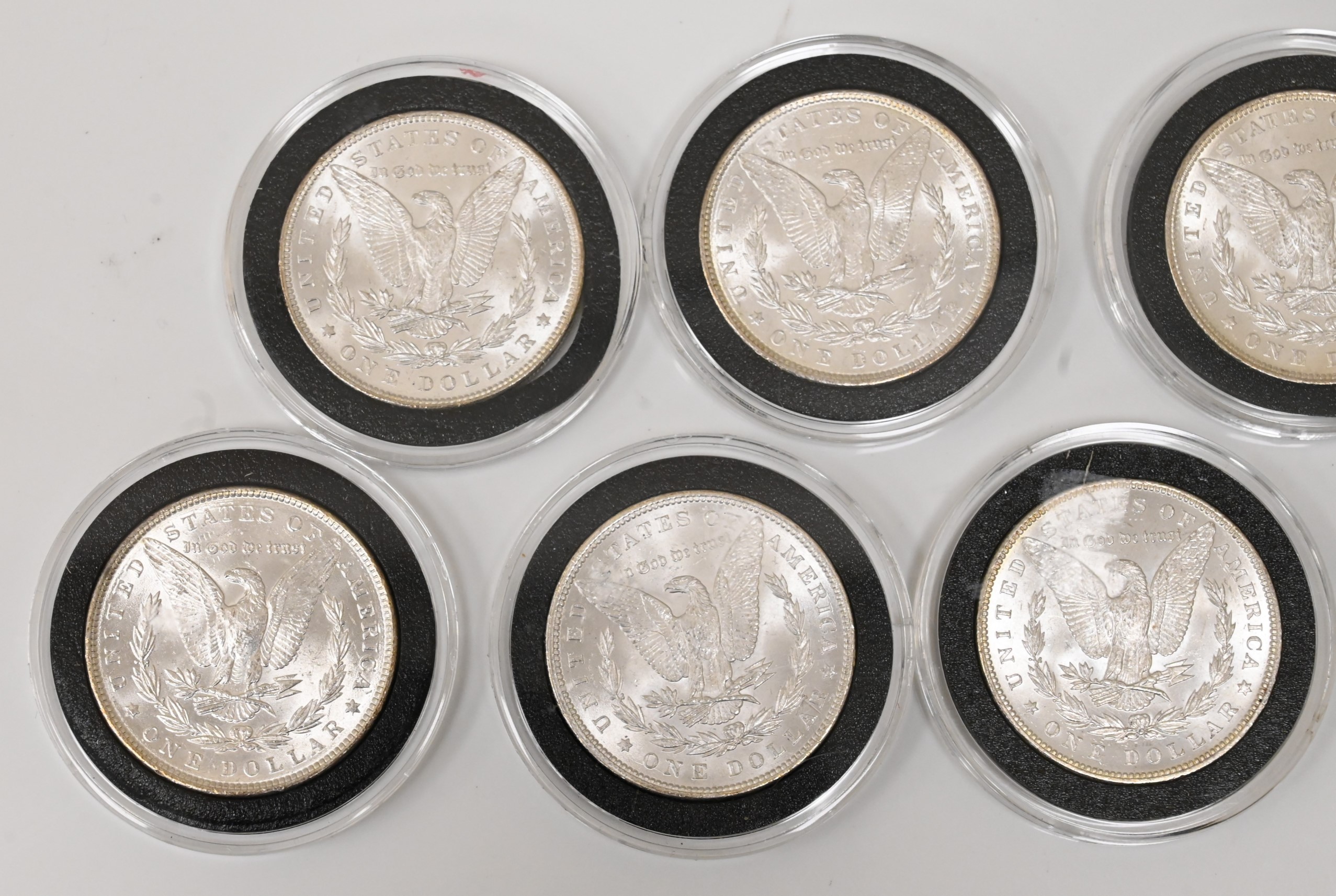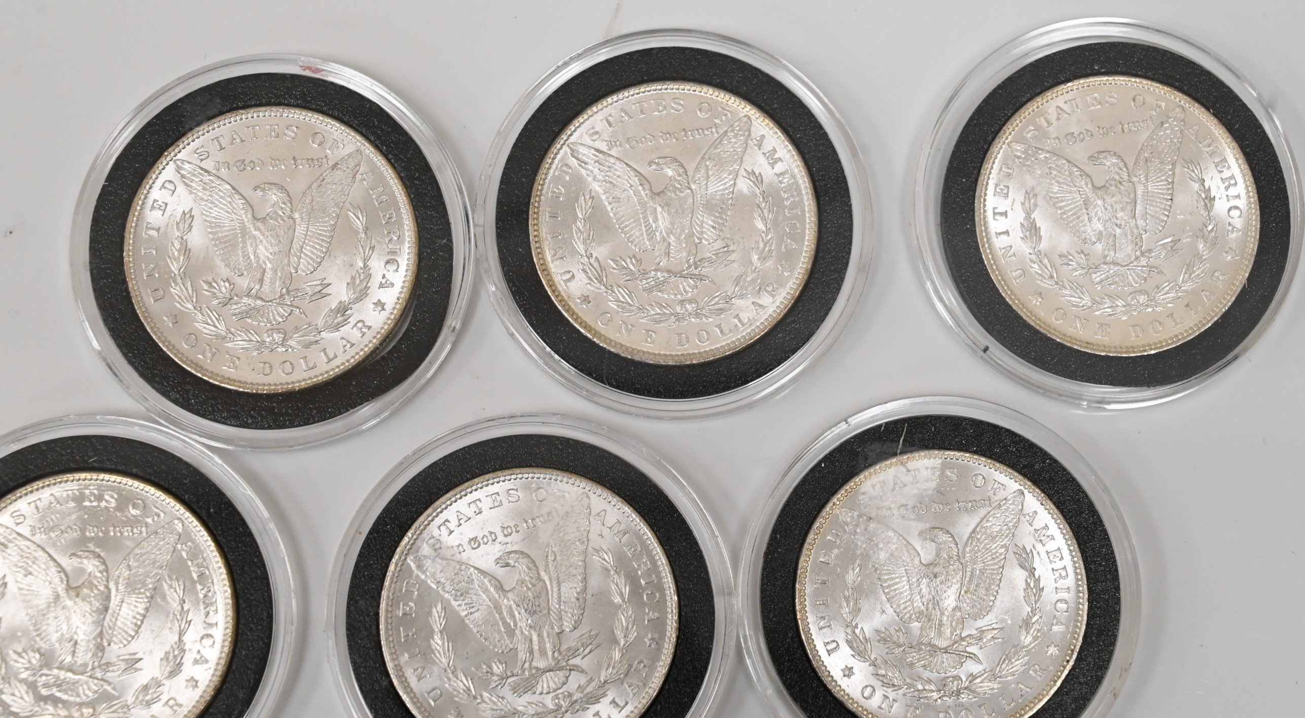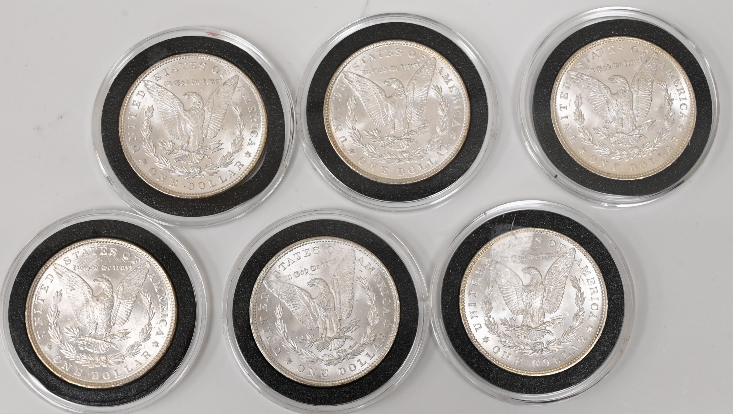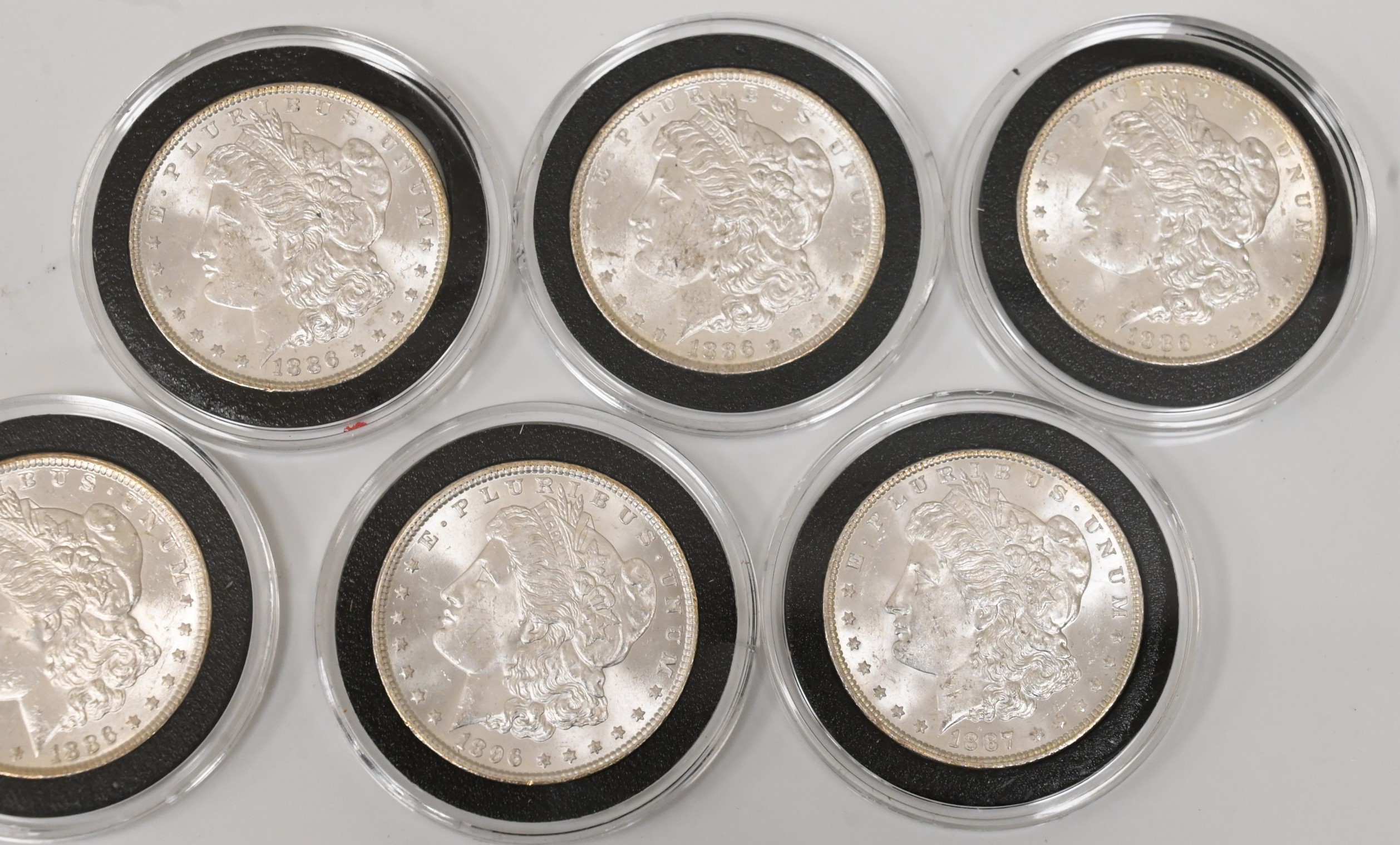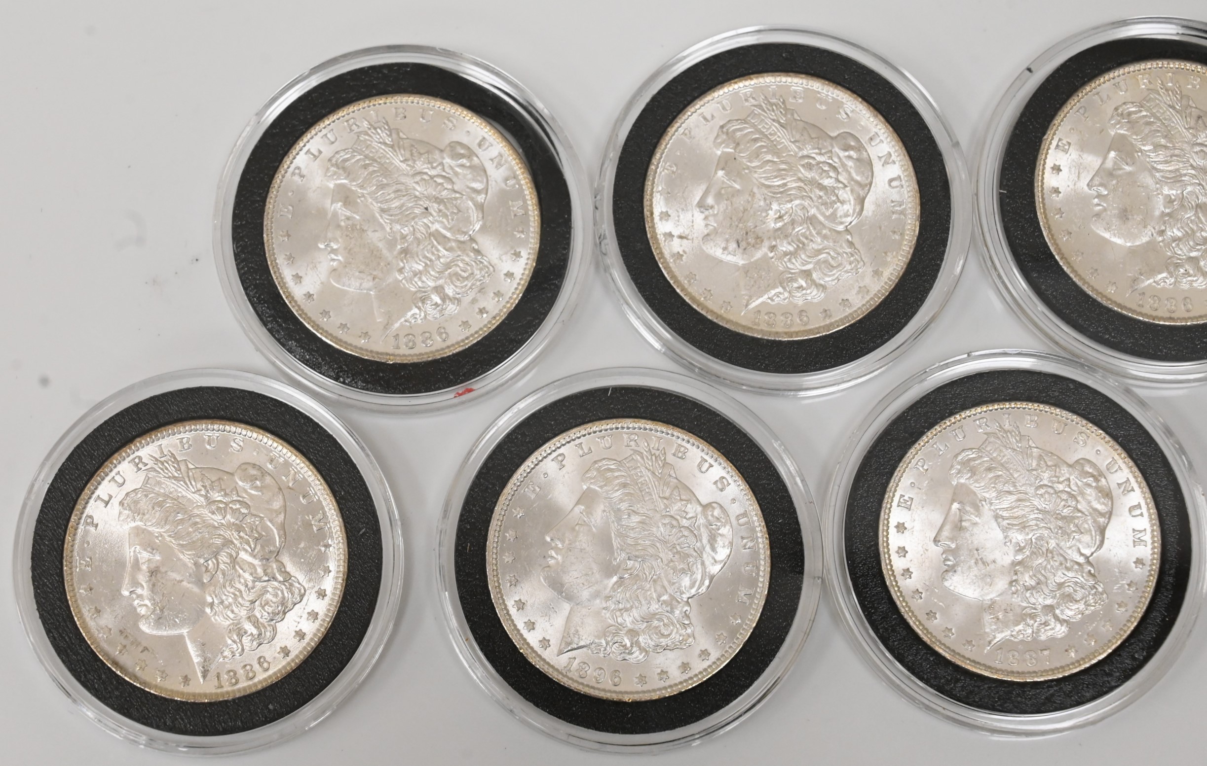 Six Uncirculated Morgan silver dollars, 4-1886, 1-1887, and one 1896.