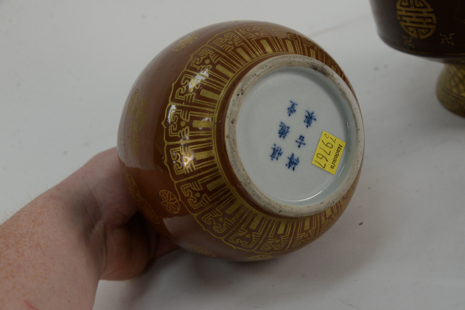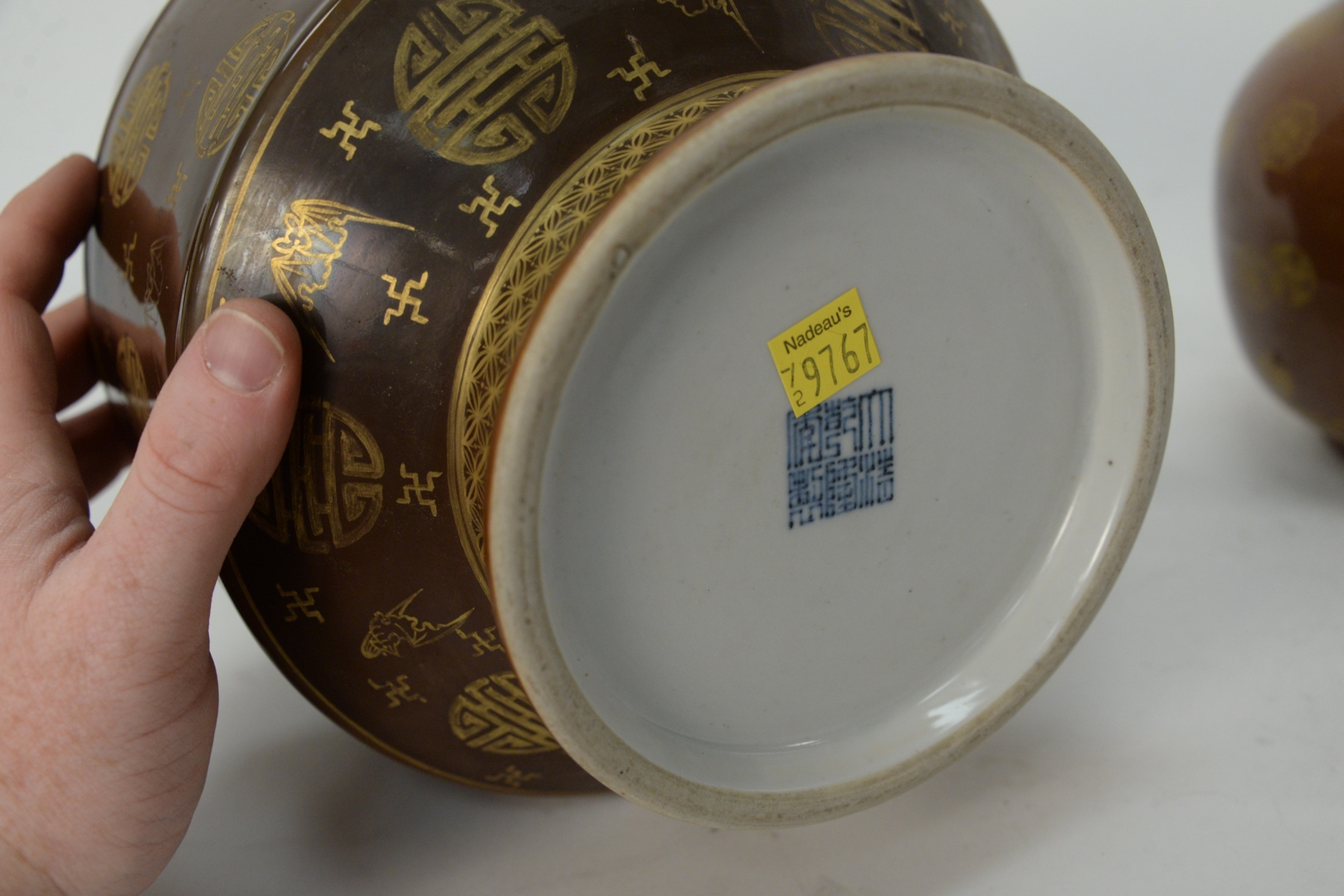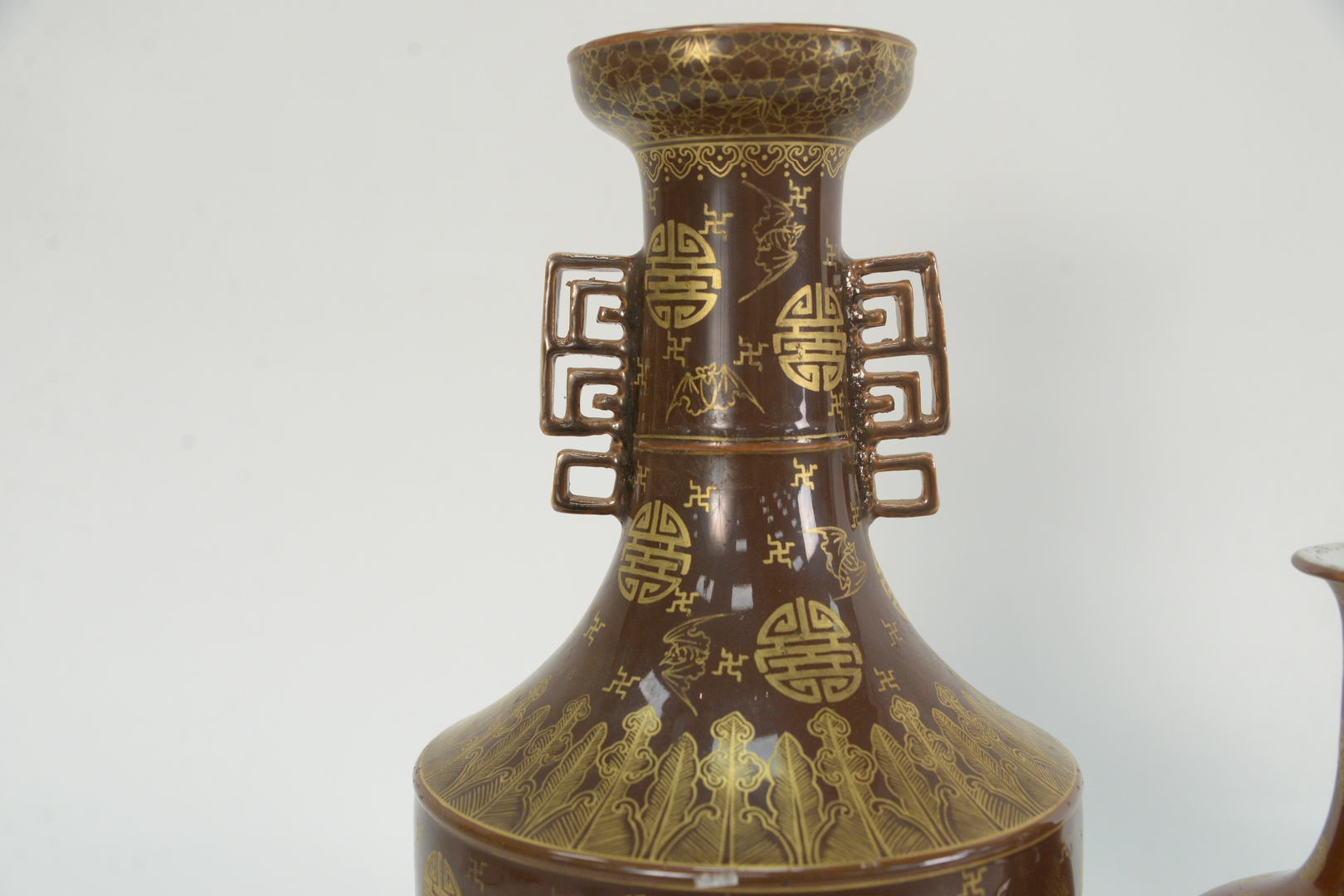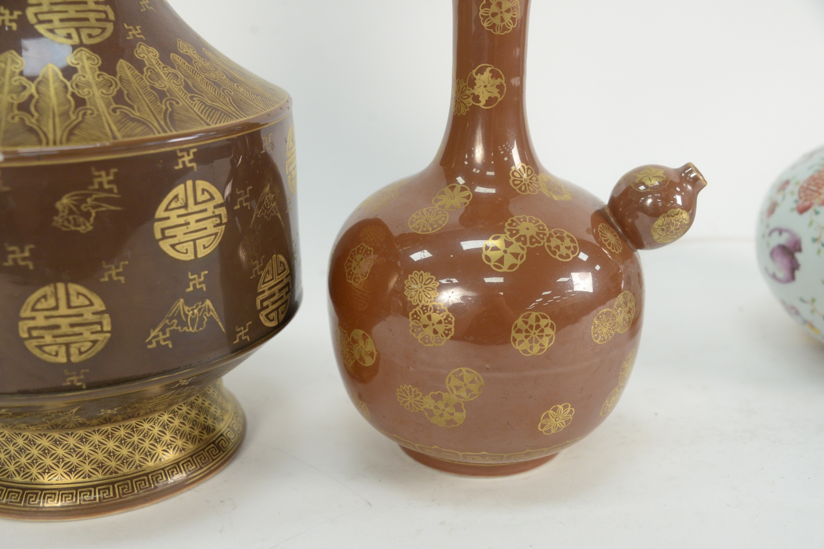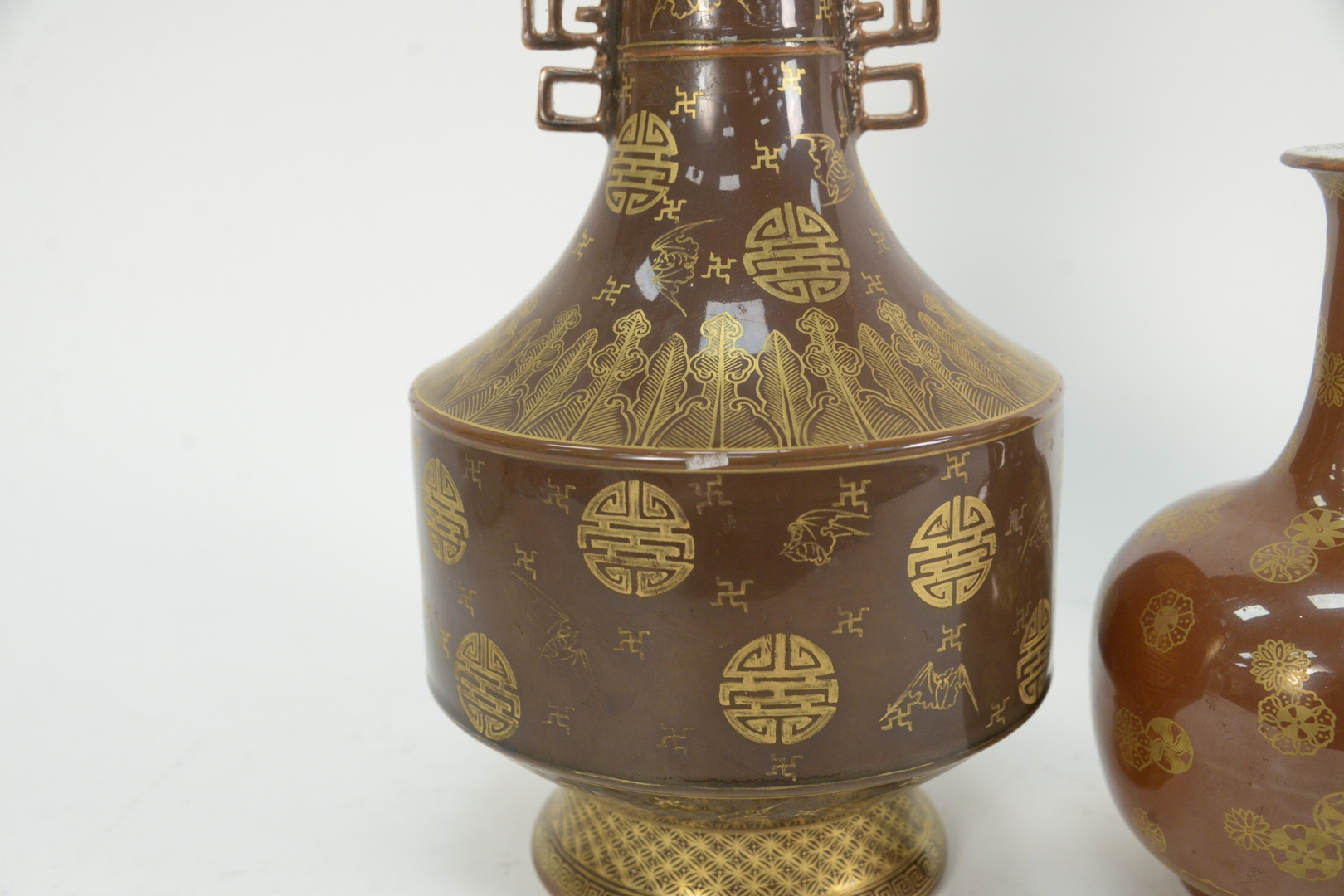 Lot 86: Two Chinese Porcelain Cafe Au Lait Monochrome Glaze Vases, Kendi with painted snowflake medallions, height 9 1/2 inches, along with a vase with gilt bat and leaf decoration, height 15 1/4 inches.