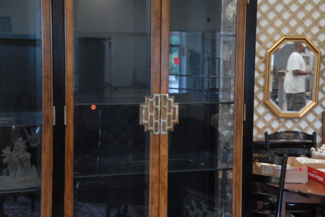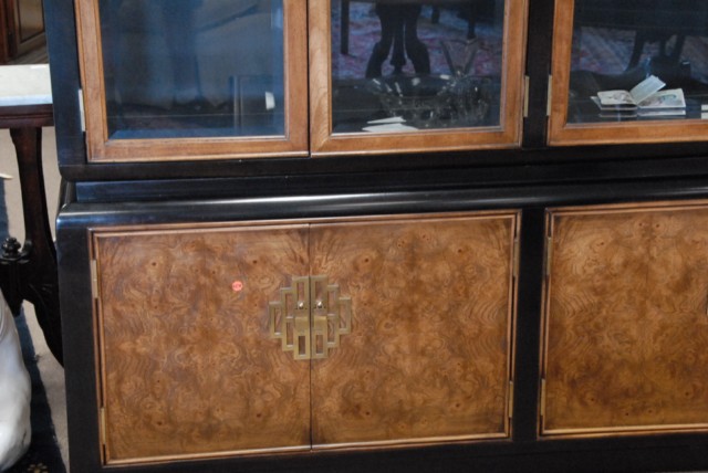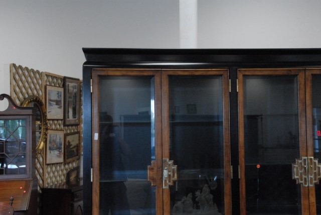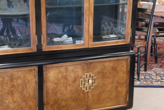 Two-part Oriental style breakfront with glass shelves and beveled glass doors.