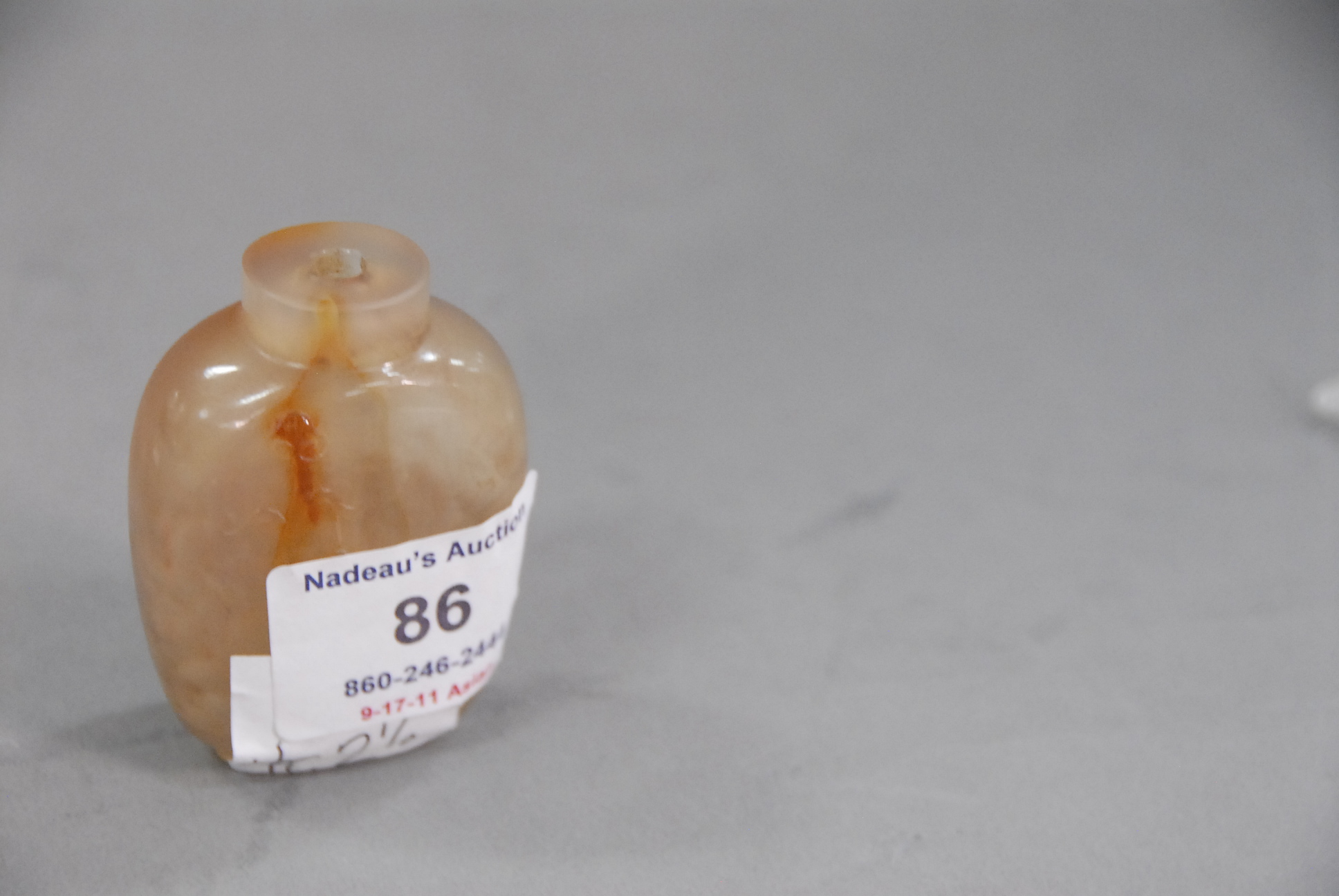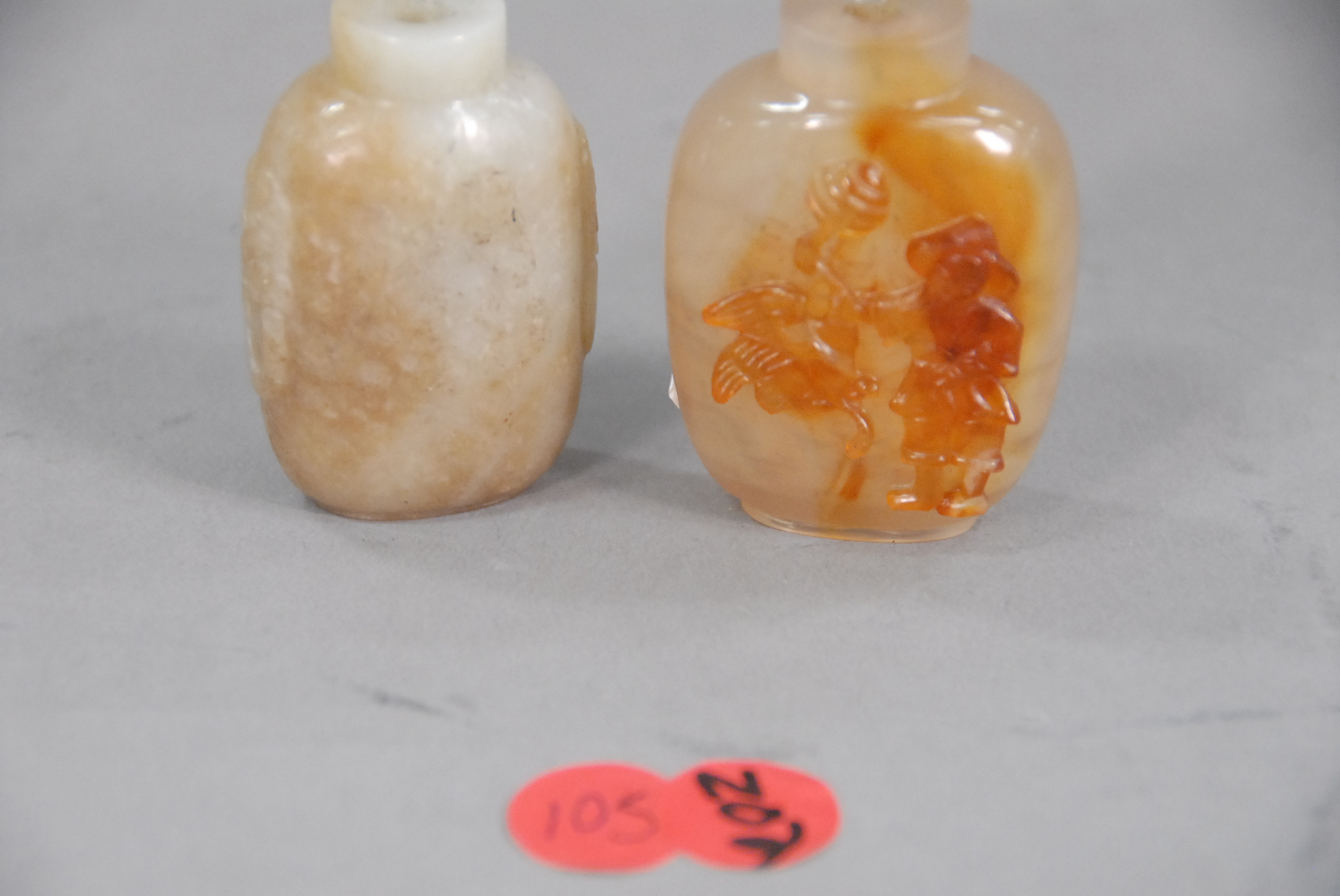Two snuff bottles, one jade with foo dog head sides and one agate carved with a guy and a bird.