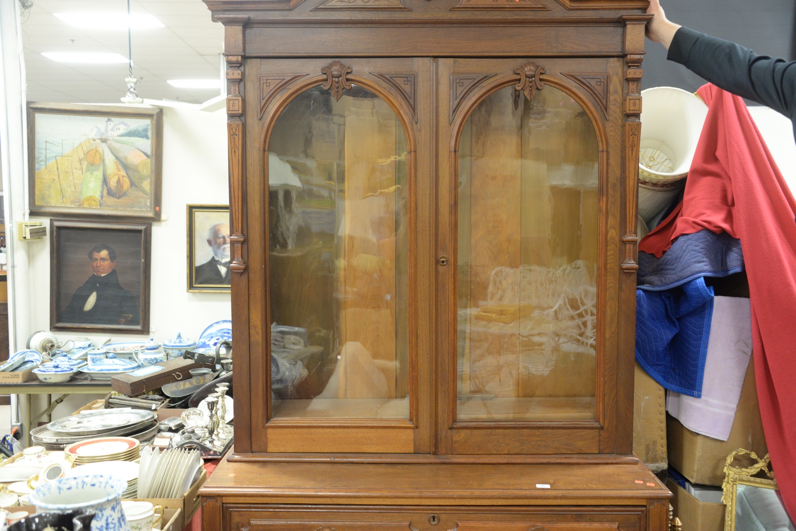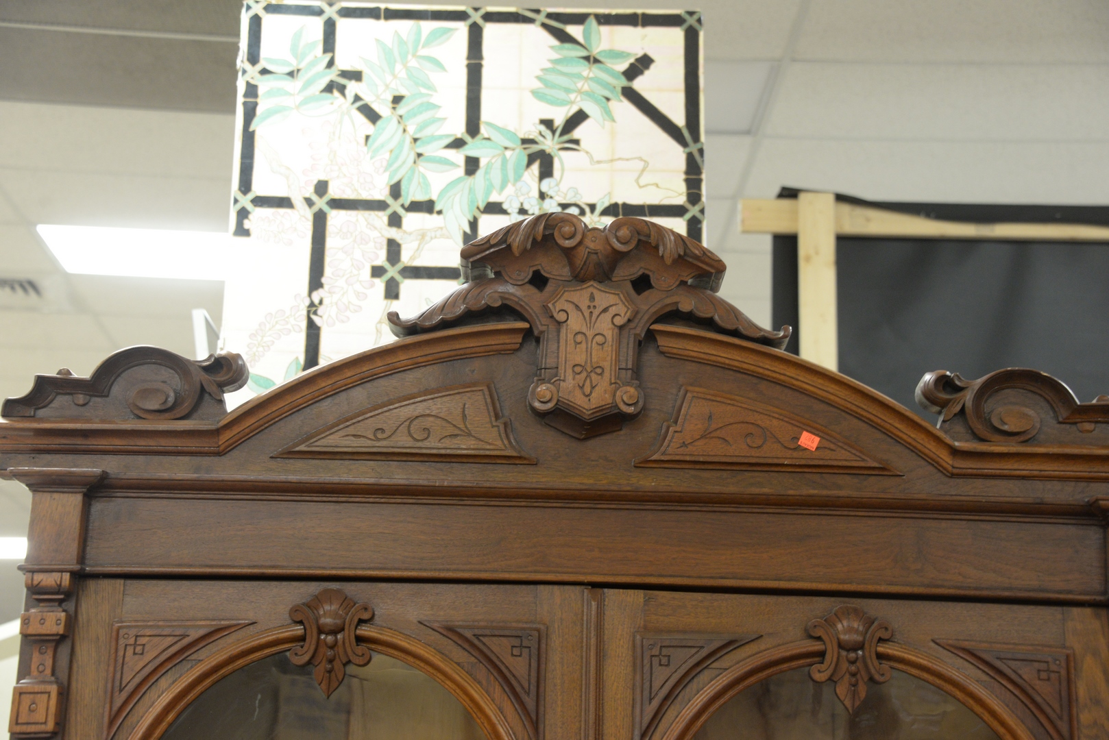 Lot 86: Victorian Walnut Cabinet having two glass doors over one drawer over two doors with carved pulls, height 104 inches, width 53 inches.