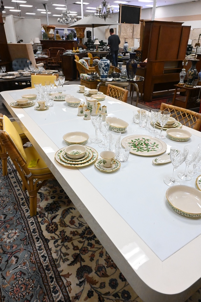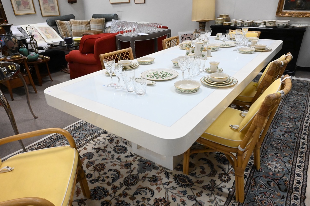 Lot 86: White Lacquered Large Table, having white glass inserts on double pedestal bases, top 48″ x 120″.
