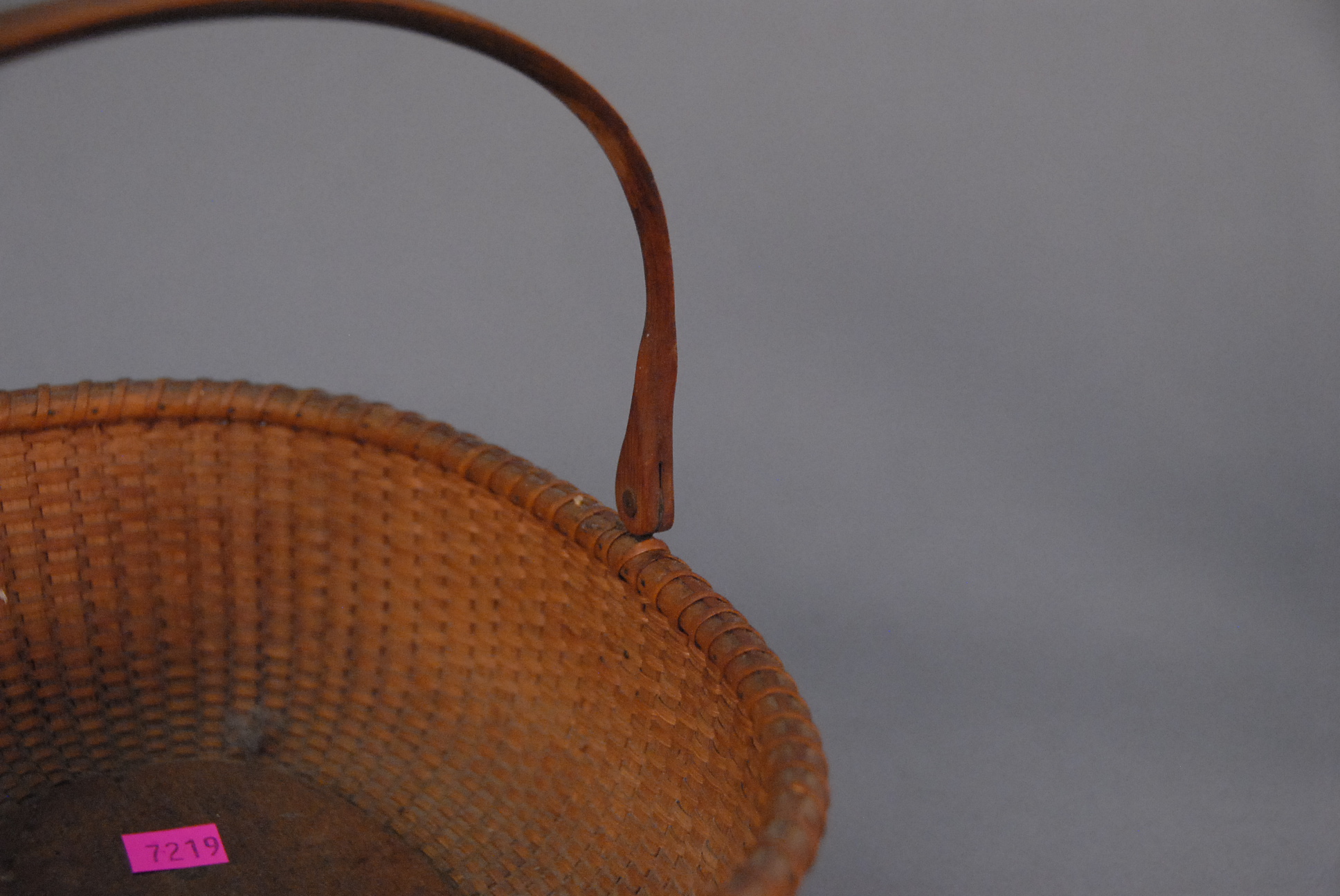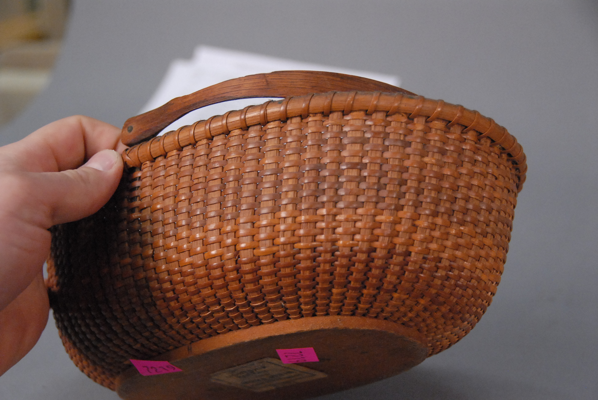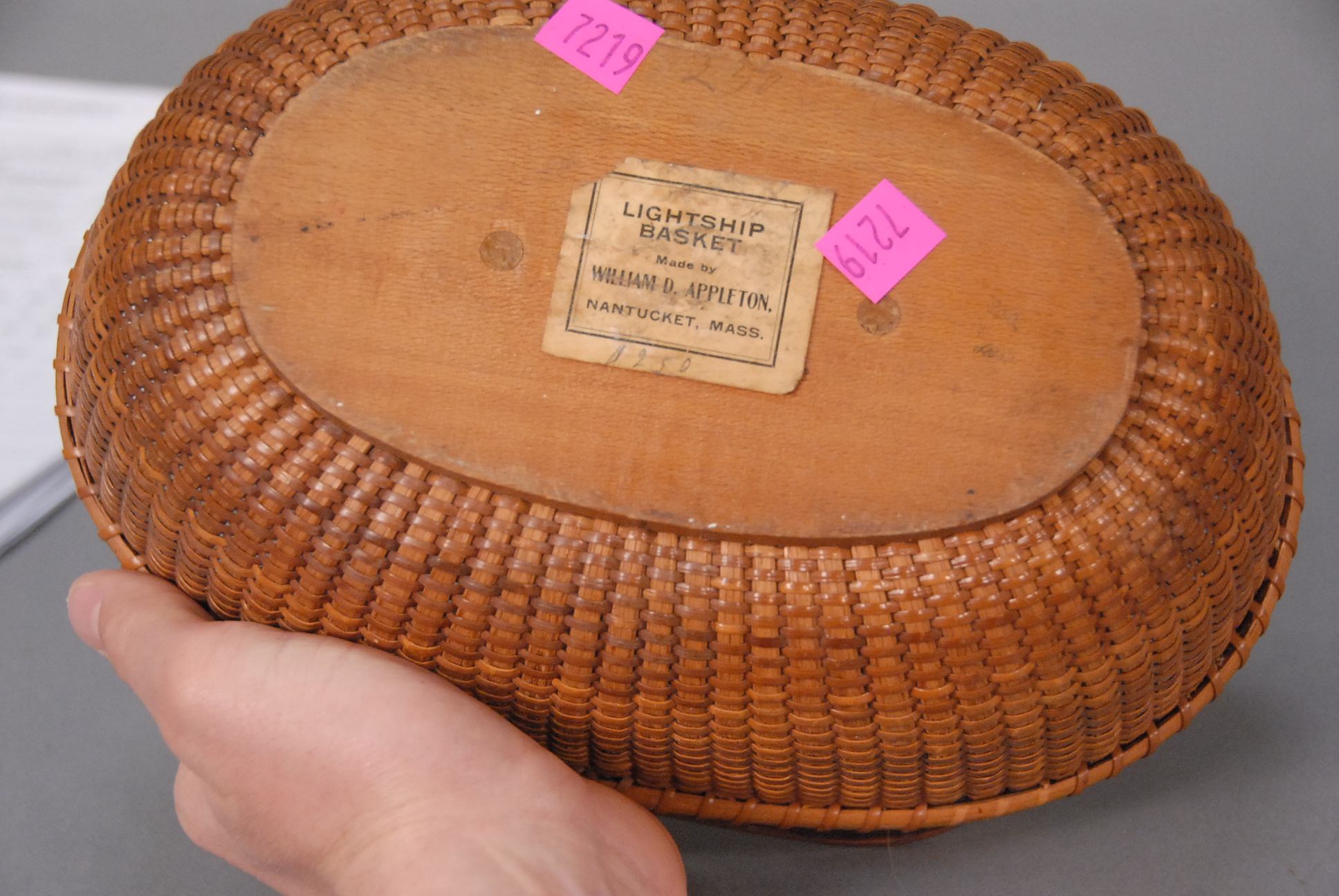 Lot 86: William Appleton Nantucket Lightship basket, oval with swing handle with original label on bottom The Lightship Basket made by William D. Appleton Nantucket, Mass, good old patina. ht. 3 1/2in. 7 x 11.