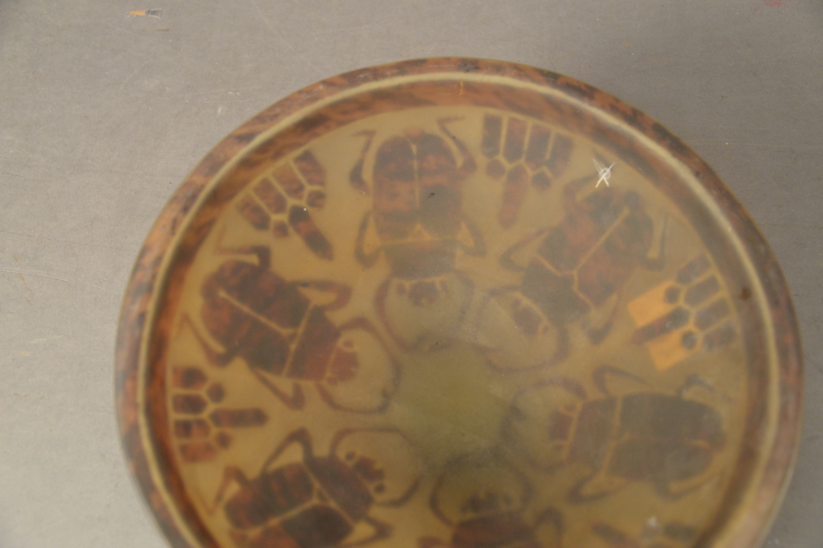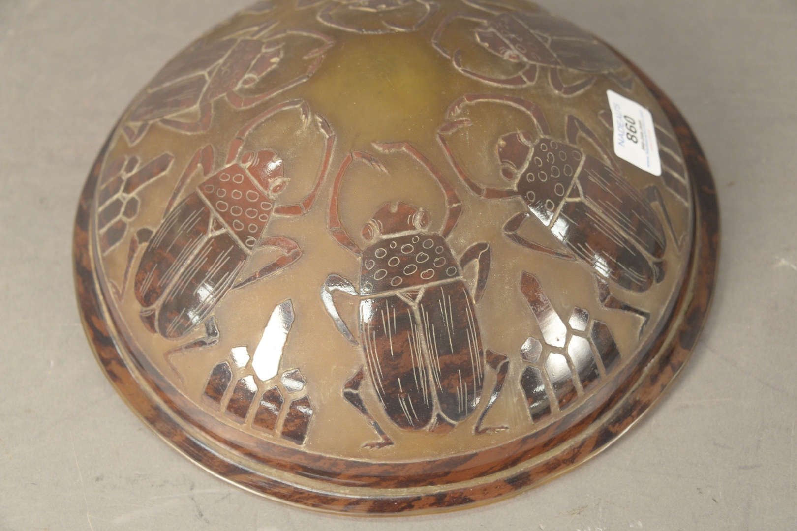 Lot 860: Le Verre Francois Brown Cameo Glass Shade, having large beetle motif, height 3 1/2 inches, diameter 11 1/2 inches.