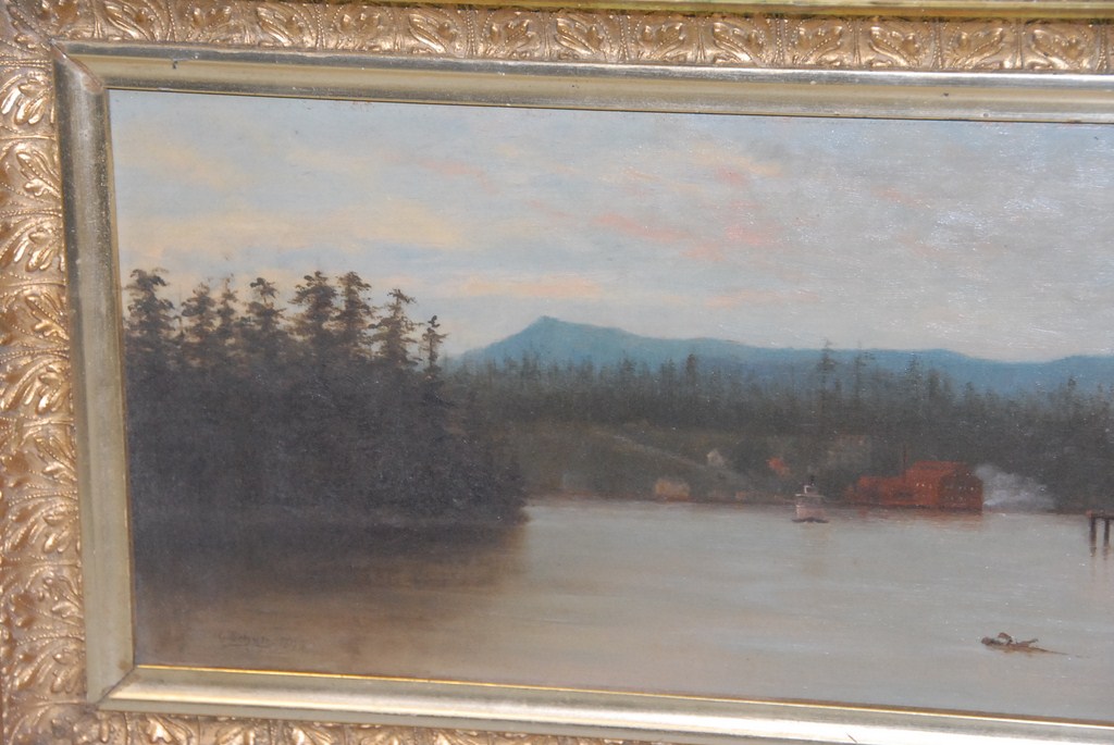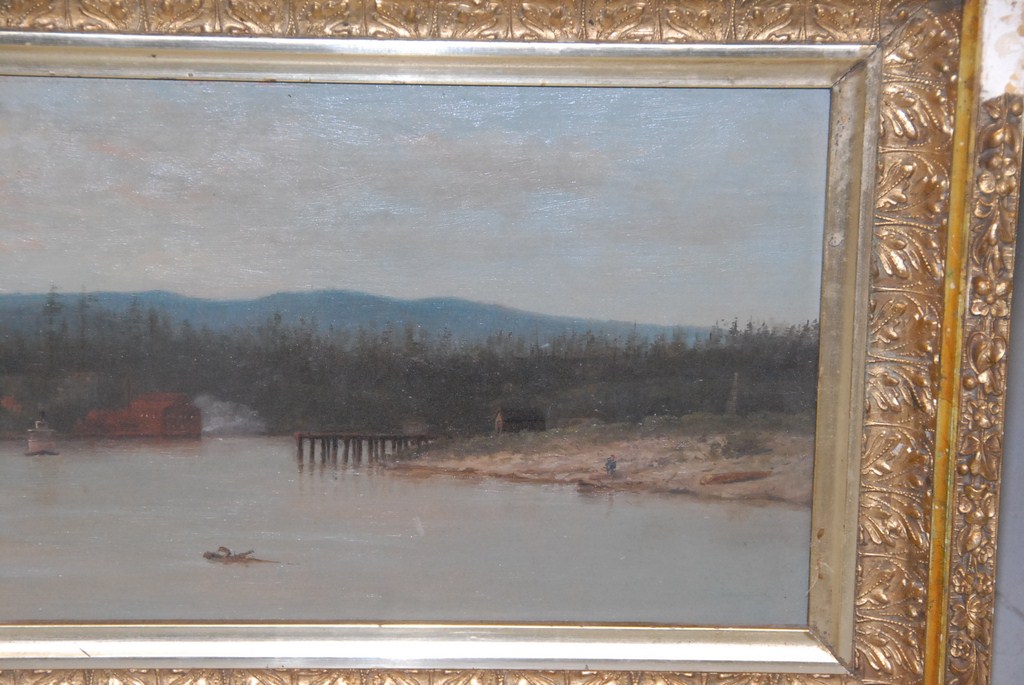 MAINE LAKE WITH SWIMMING MOOSE oil on board signed lower left G. Shutz 1896 7 x 18