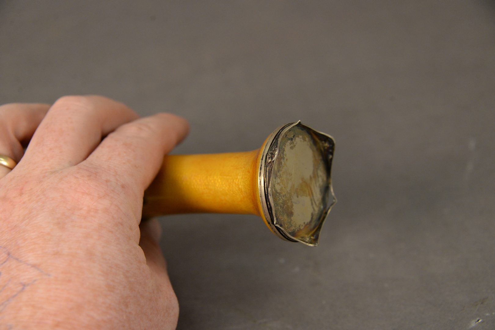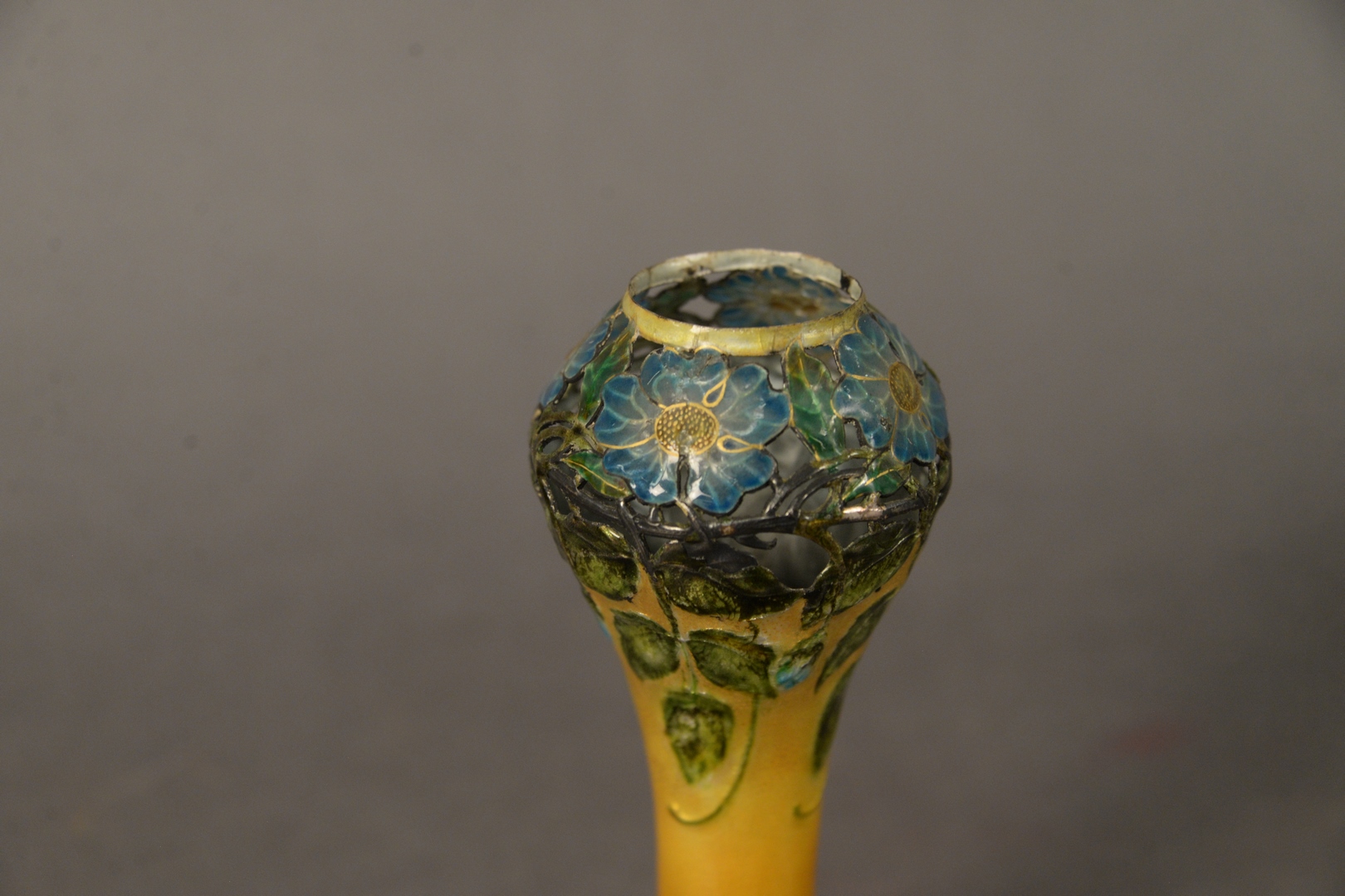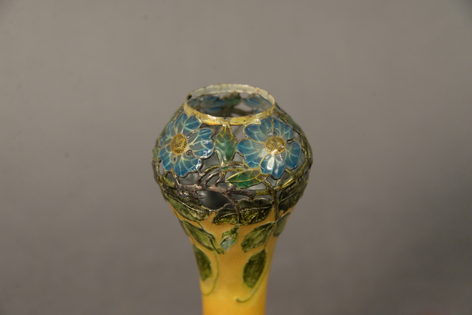 Lot 861: Small Sterling Silver Orange and Blue Enameled Vase, with floral details, height 6 1/4 inches.