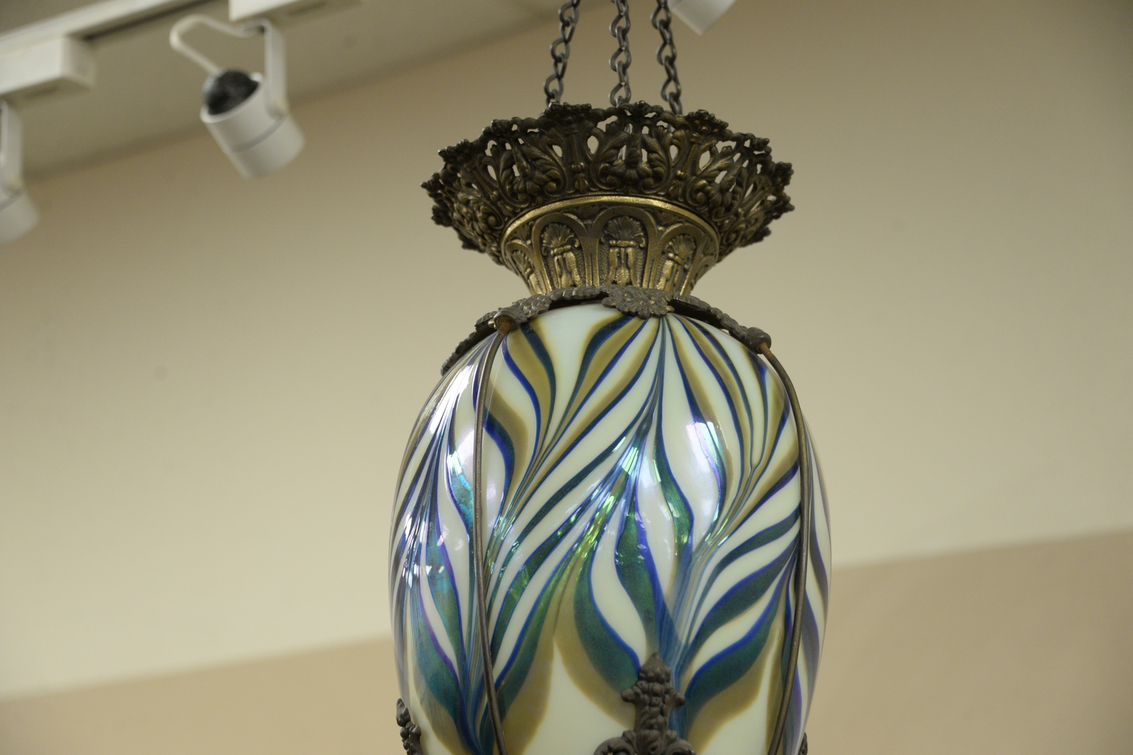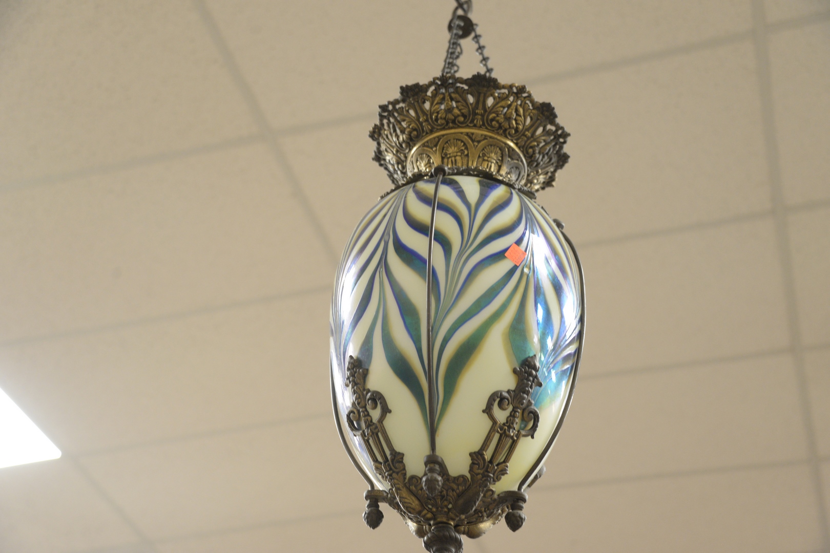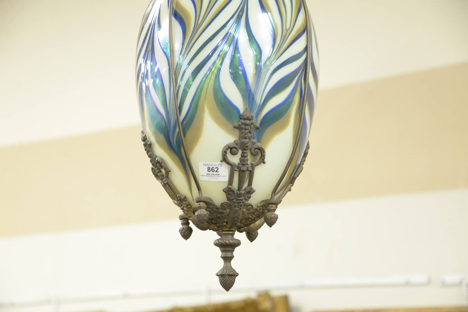 Lot 862: Large Apothecary Hanging Brass Lantern, having blue, white, and gold art glass shade, length 22 1/2 inches, width 8 1/2 inches.